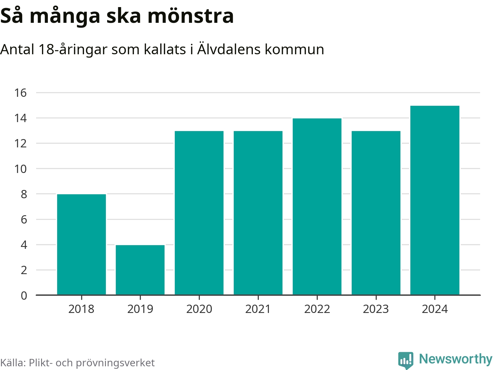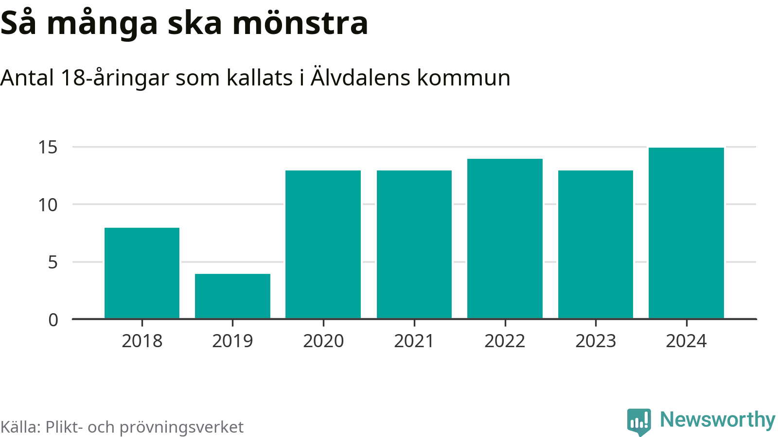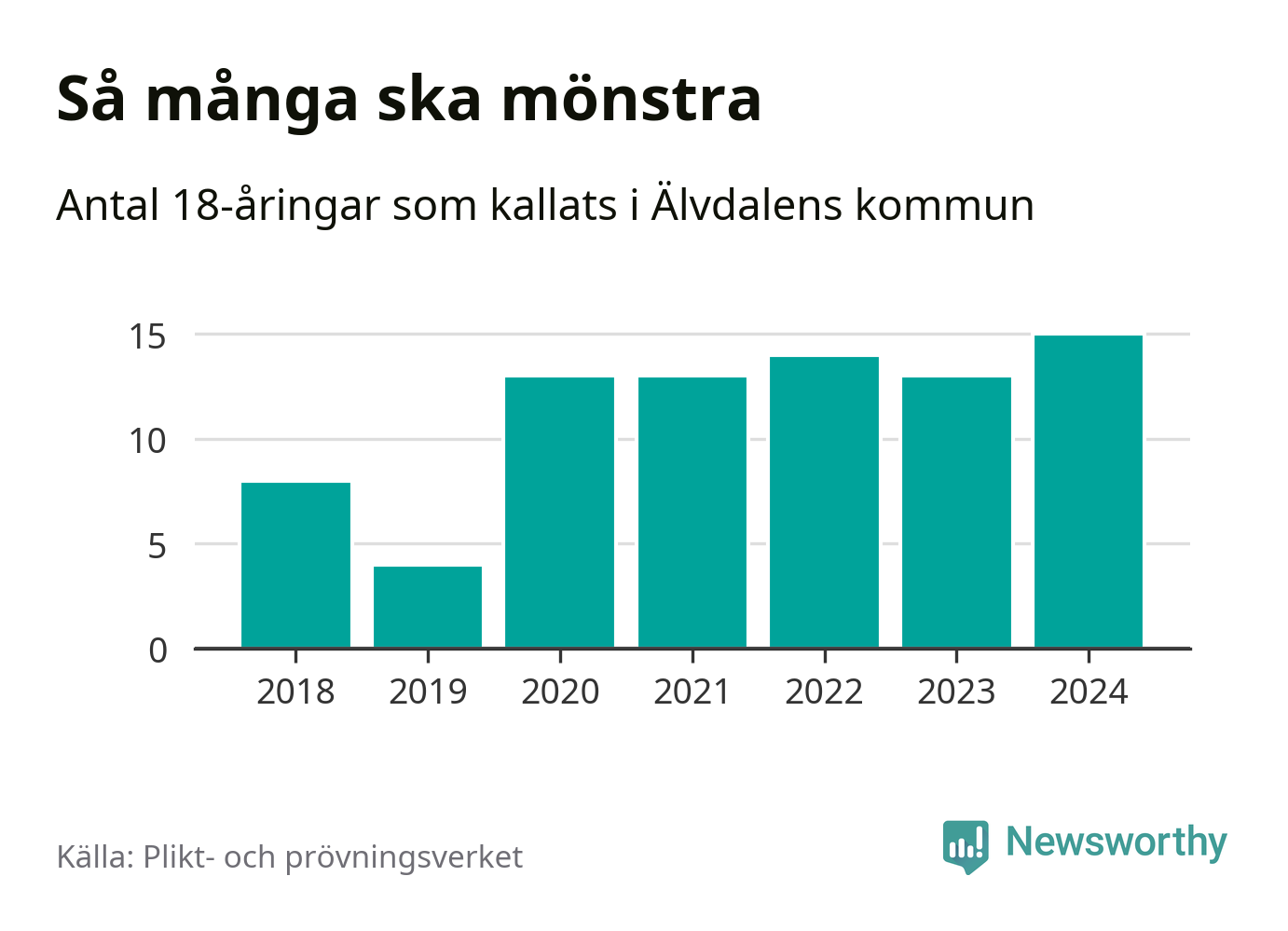 15 personer är det högsta antalet kallade i Älvdalen sedan 2018, som är första året med statistik på kommunnivå (värnplikten återinfördes 2017), och två mönstrande mer än 2023. 2018 kallades som jämförelse åtta 18-åringar från Älvdalen till mönstring. Det motsvarade ungefär 10 procent av årskullen född år 2000. Totalt från Dalarnas län kallas 729 personer födda 2006 i år.