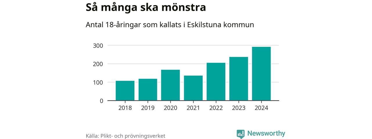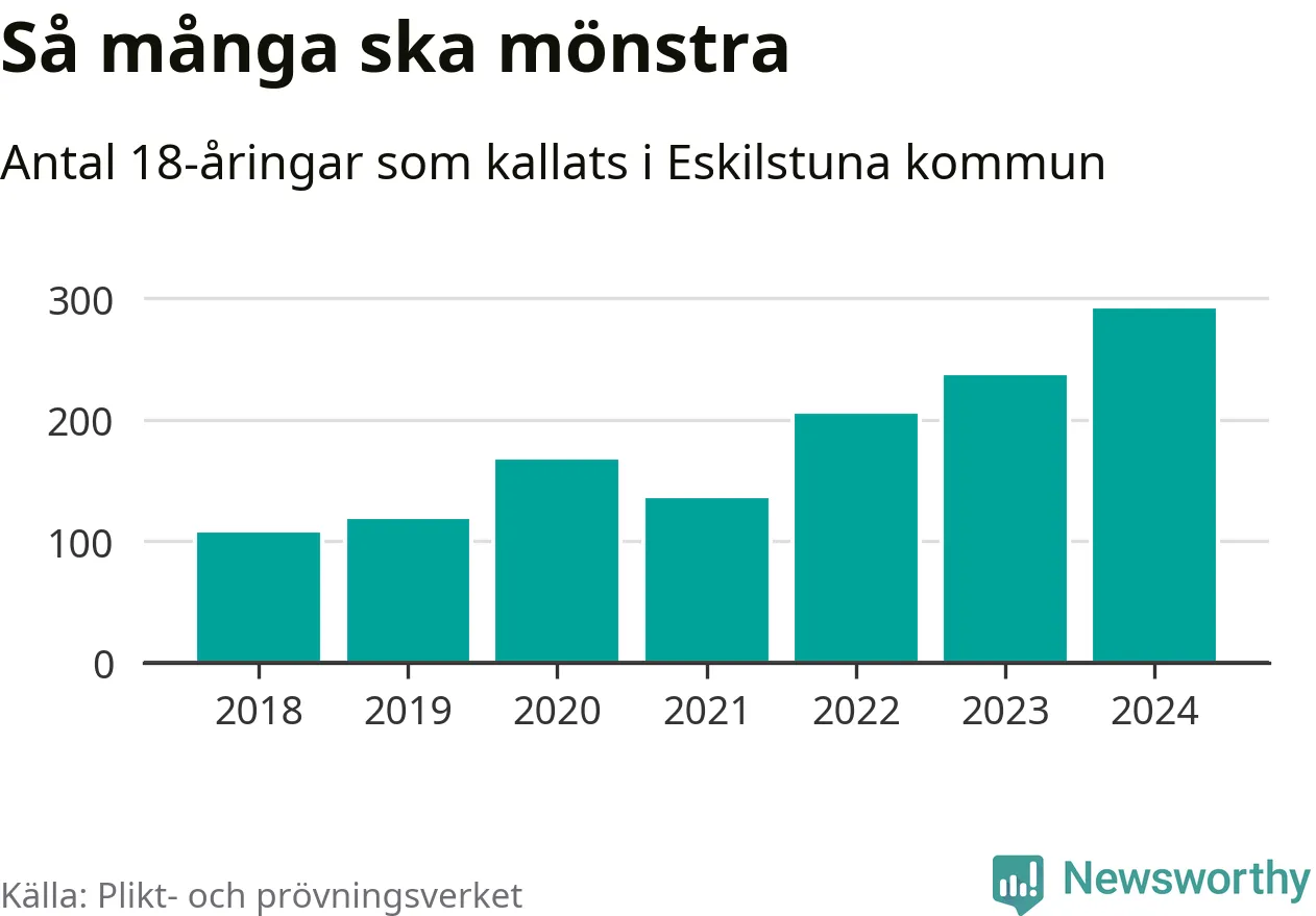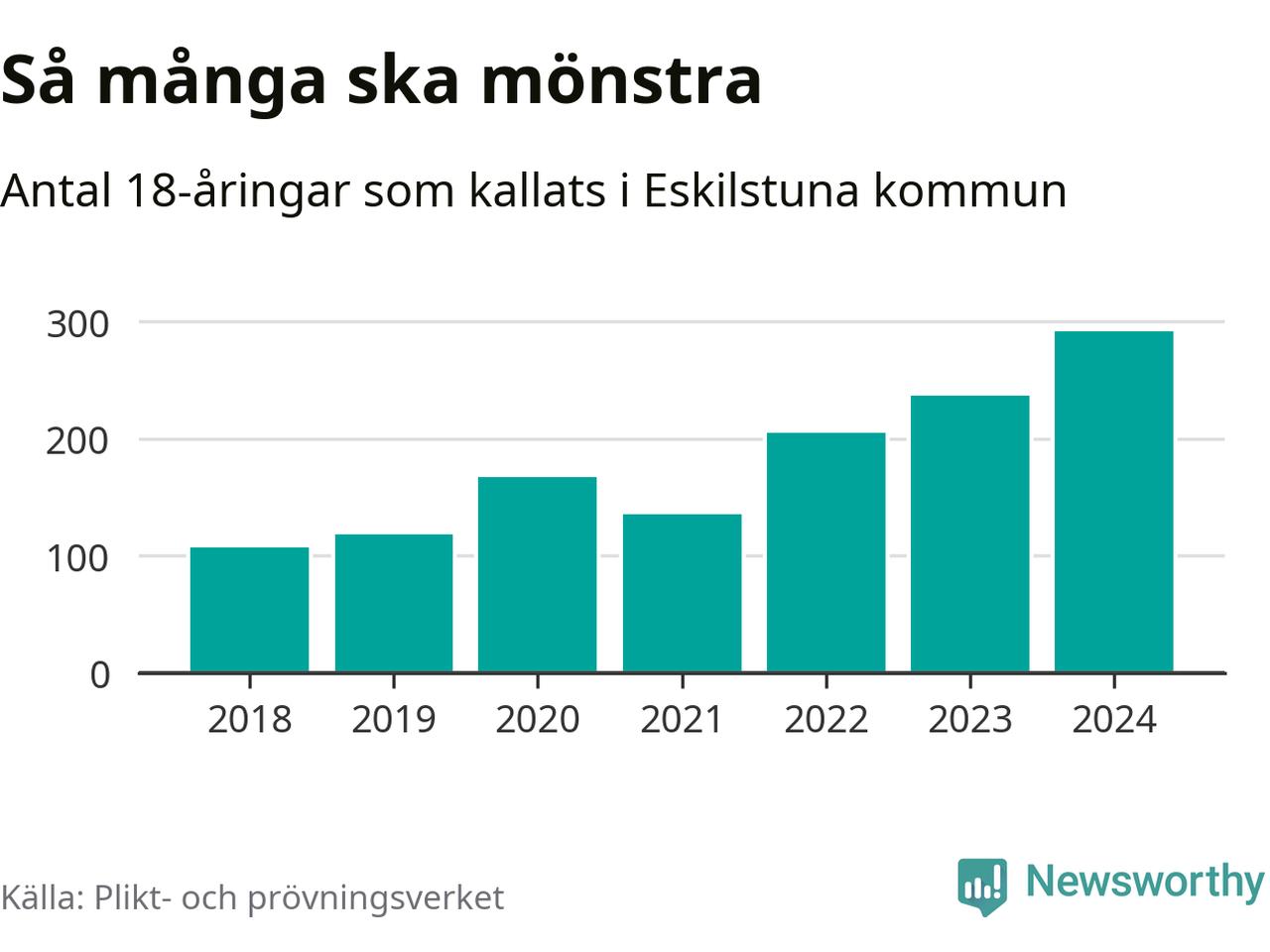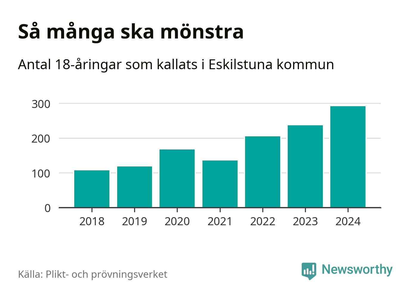 293 personer är det högsta antalet kallade i Eskilstuna sedan 2018, som är första året med statistik på kommunnivå (värnplikten återinfördes 2017), och 55 mönstrande mer än 2023. 2018 kallades som jämförelse 109 artonåringar från Eskilstuna till mönstring. Det motsvarade ungefär 9 procent av årskullen född år 2000. Totalt från Södermanlands län kallas 817 personer födda 2006 i år.