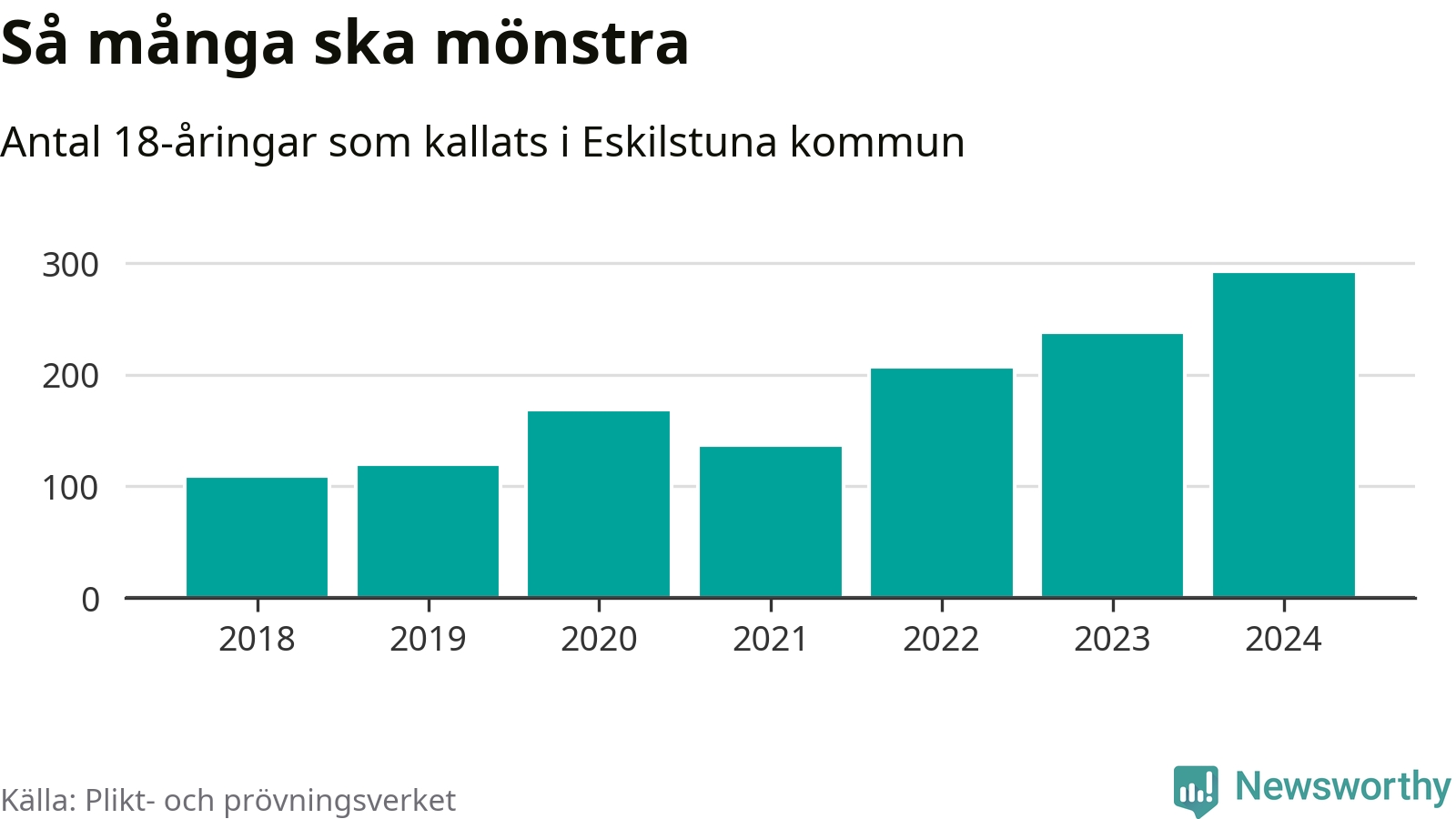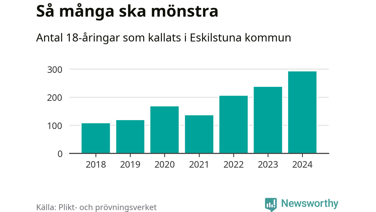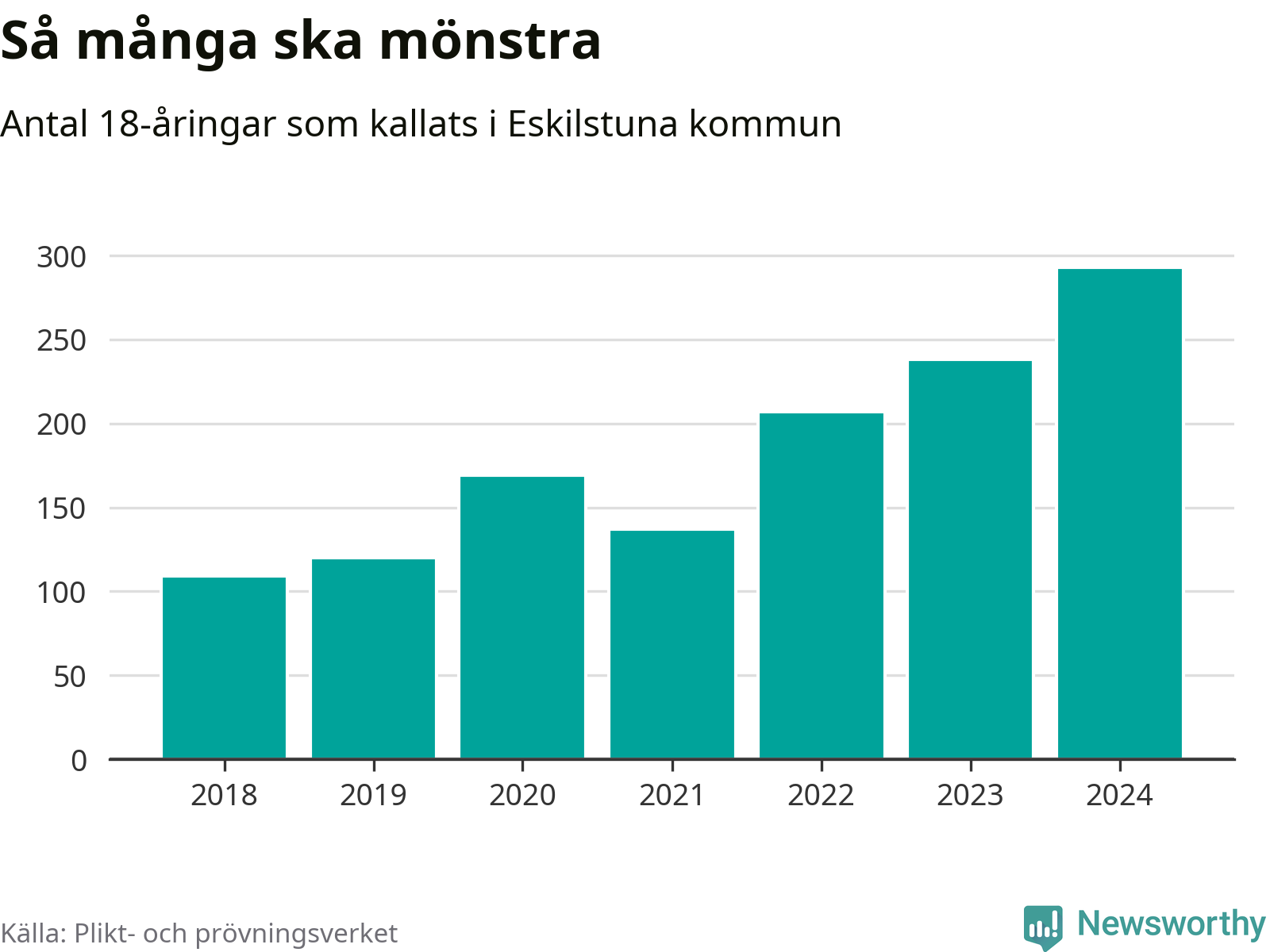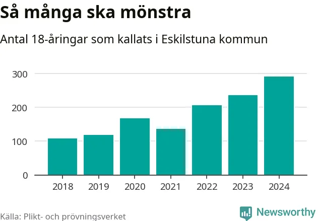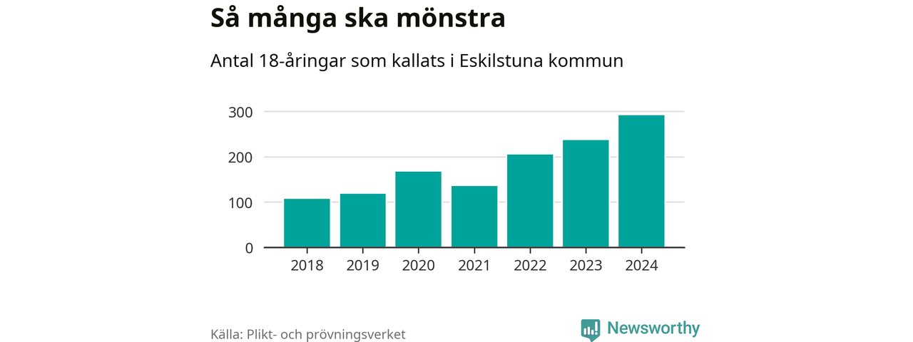 293 personer är det högsta antalet kallade i Eskilstuna sedan 2018, som är första året med statistik på kommunnivå (värnplikten återinfördes 2017), och 55 mönstrande mer än 2023. 2018 kallades som jämförelse 109 artonåringar från Eskilstuna till mönstring. Det motsvarade ungefär 9 procent av årskullen född år 2000. Totalt från Södermanlands län kallas 817 personer födda 2006 i år.