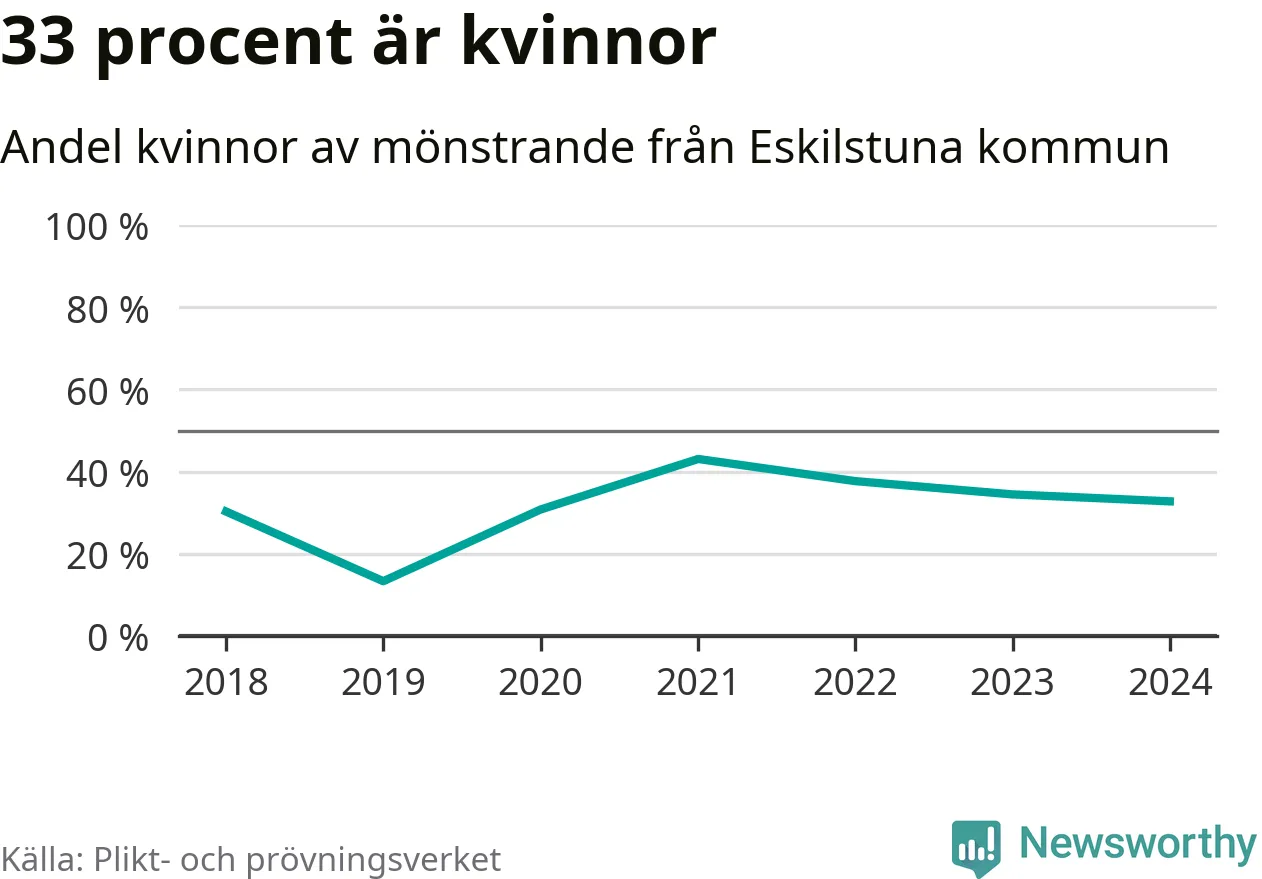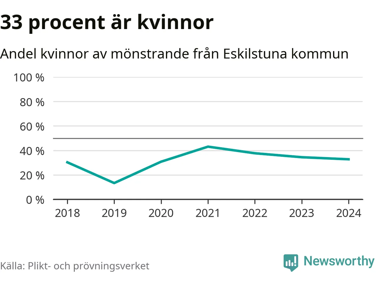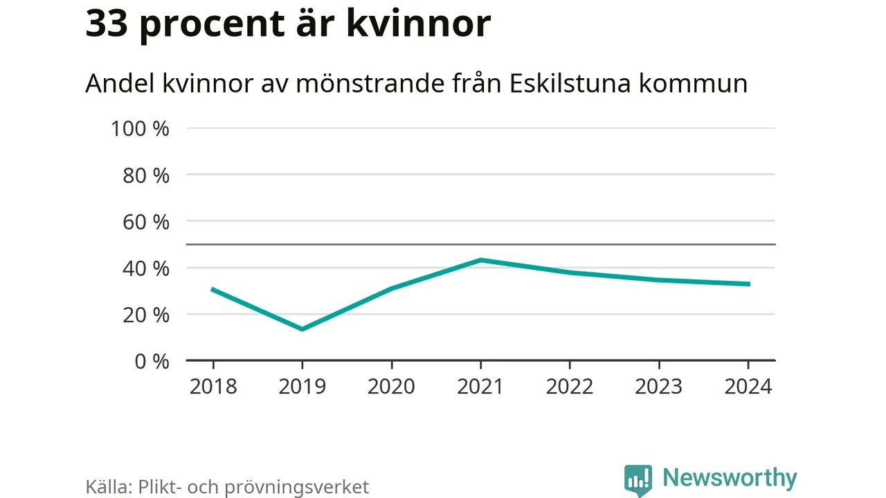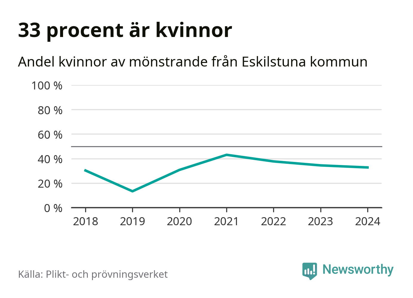 Av de som skrivits in till någon av Försvarmaktens grundutbildningar det senaste året, från juni 2023 till mars i år, kommer 59 (46 män och 13 kvinnor) från Eskilstuna. 49 av dessa antogs efter att ha kallats till mönstring.