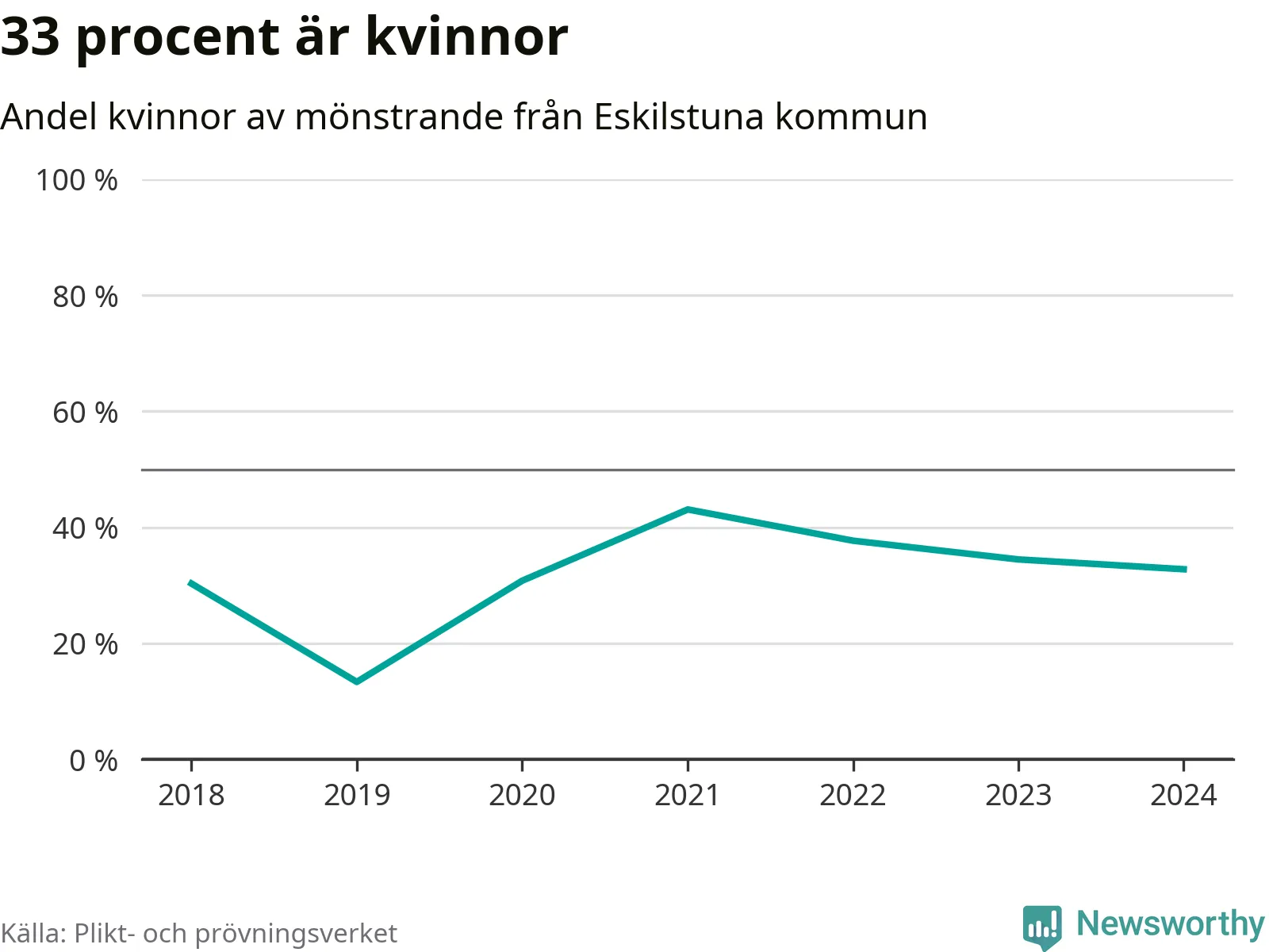 96 av de som kallats till mönstring från Eskilstuna är kvinnor, vilket motsvarar 33 procent av de mönstrande. I absoluta tal är det fler kvinnor än något år sedan värnplikten återinfördes, men 2021 var en större andel av de mönstrande från kommunen kvinnor (43 procent). I riket som helhet är 30 procent av de mönstrande tjejer.