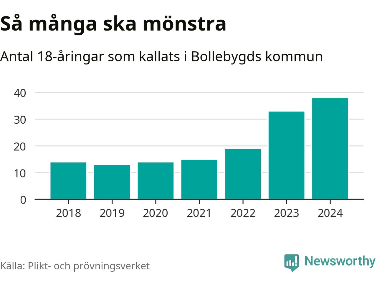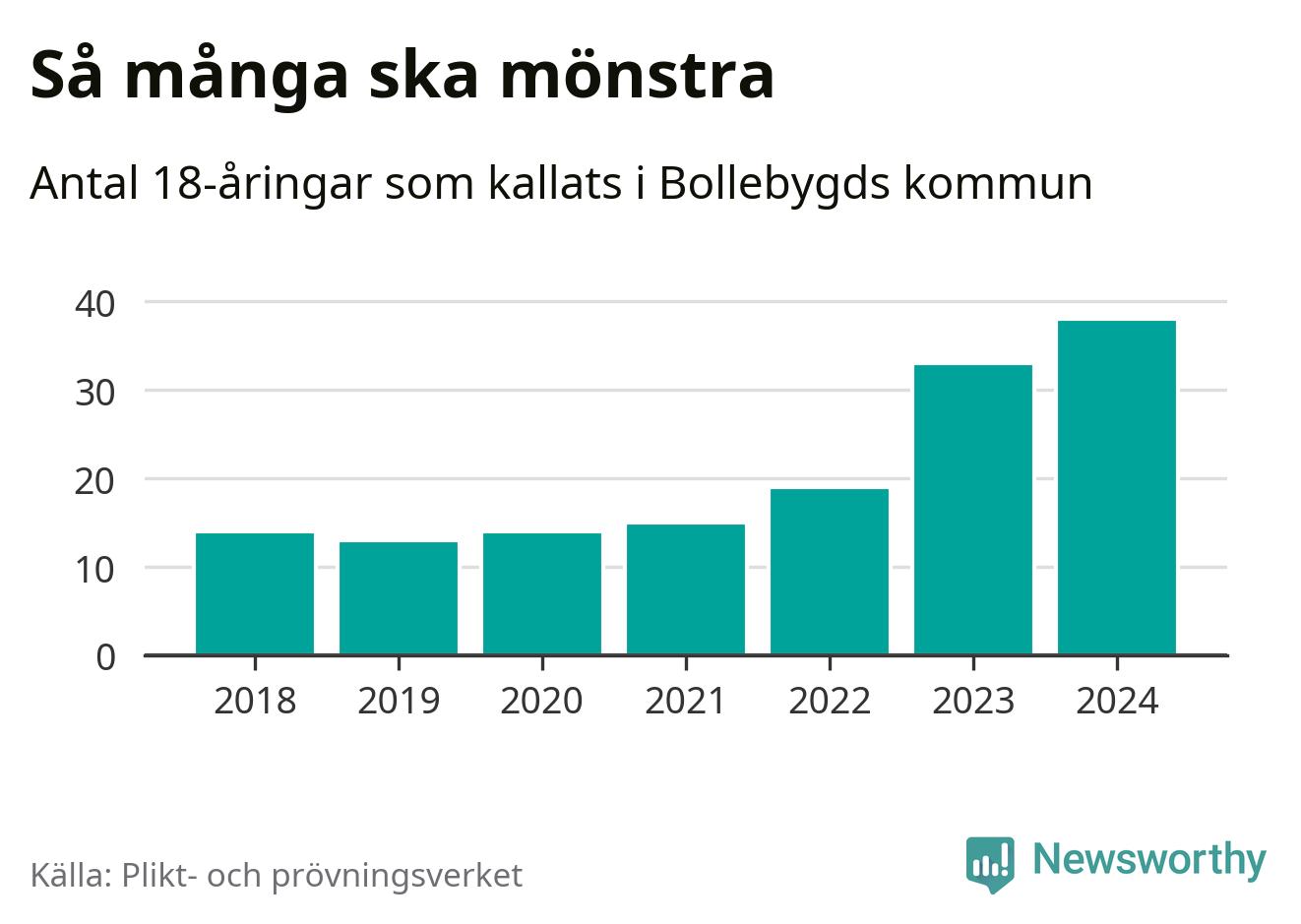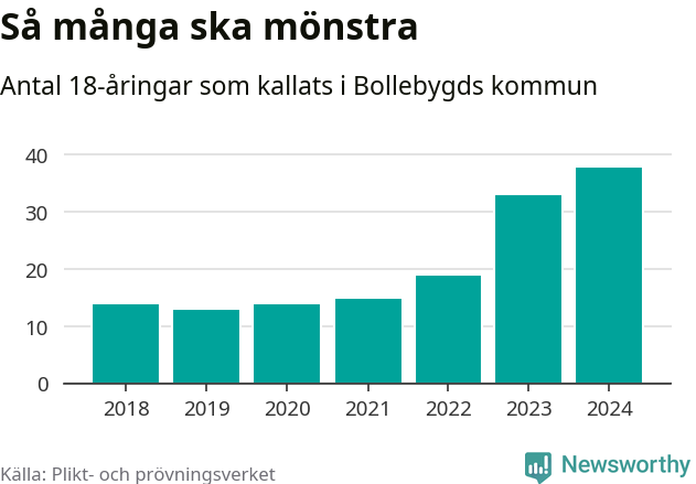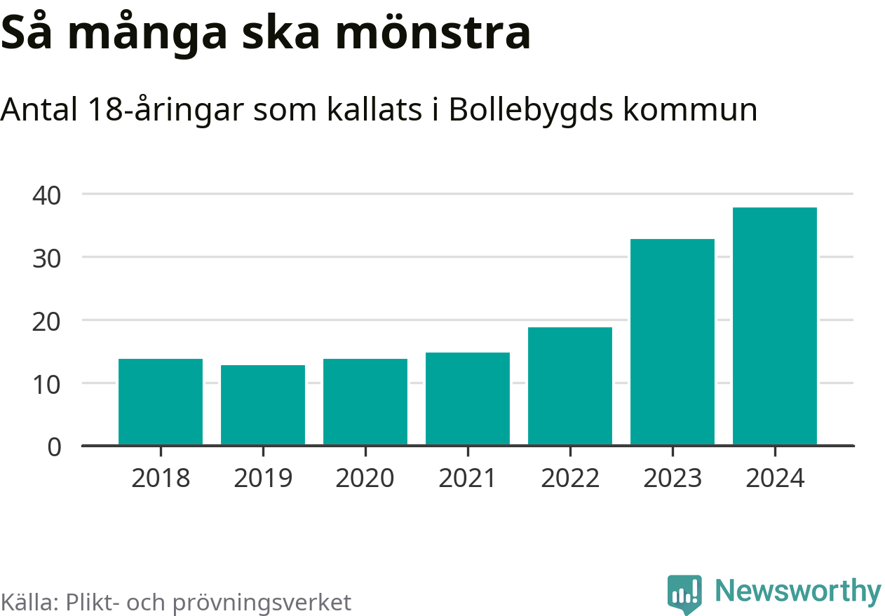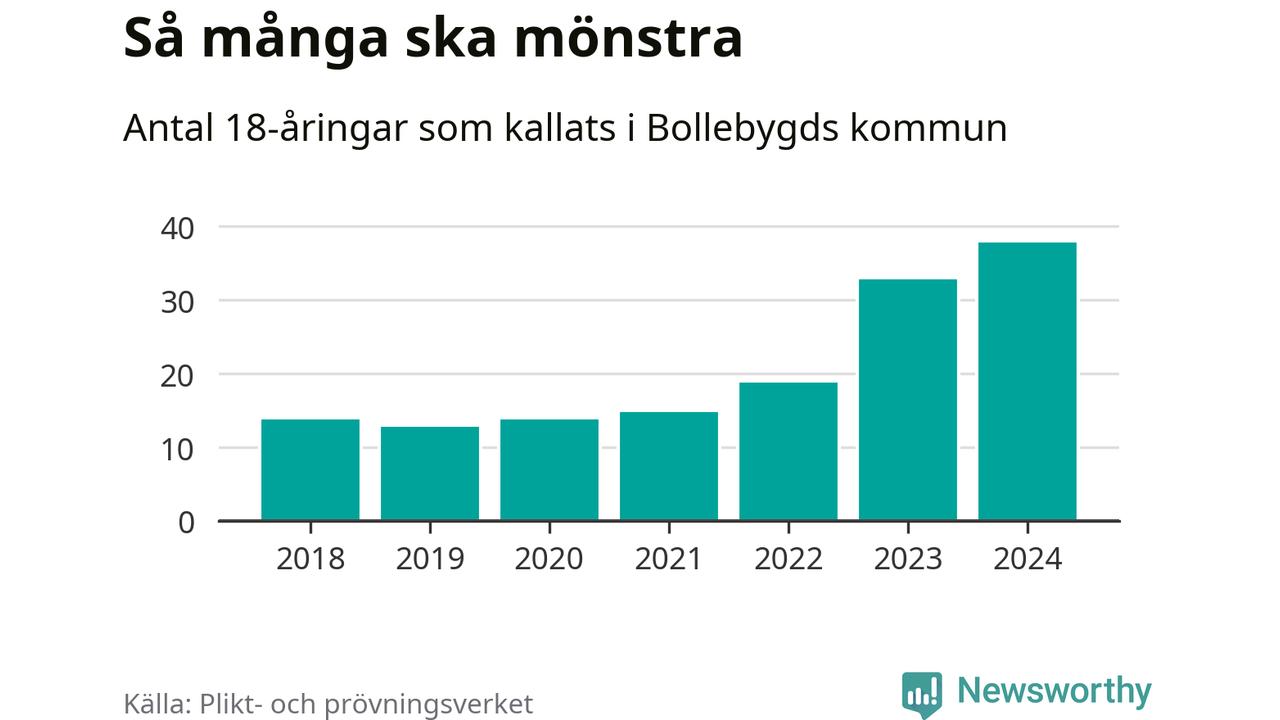 38 personer är det högsta antalet kallade i Bollebygd sedan 2018, som är första året med statistik på kommunnivå (värnplikten återinfördes 2017), och fem mönstrande mer än 2023. 2018 kallades som jämförelse 14 artonåringar från Bollebygd till mönstring. Det motsvarade ungefär 15 procent av årskullen född år 2000. Totalt från Västra Götalands län kallas 4 562 personer födda 2006 i år.