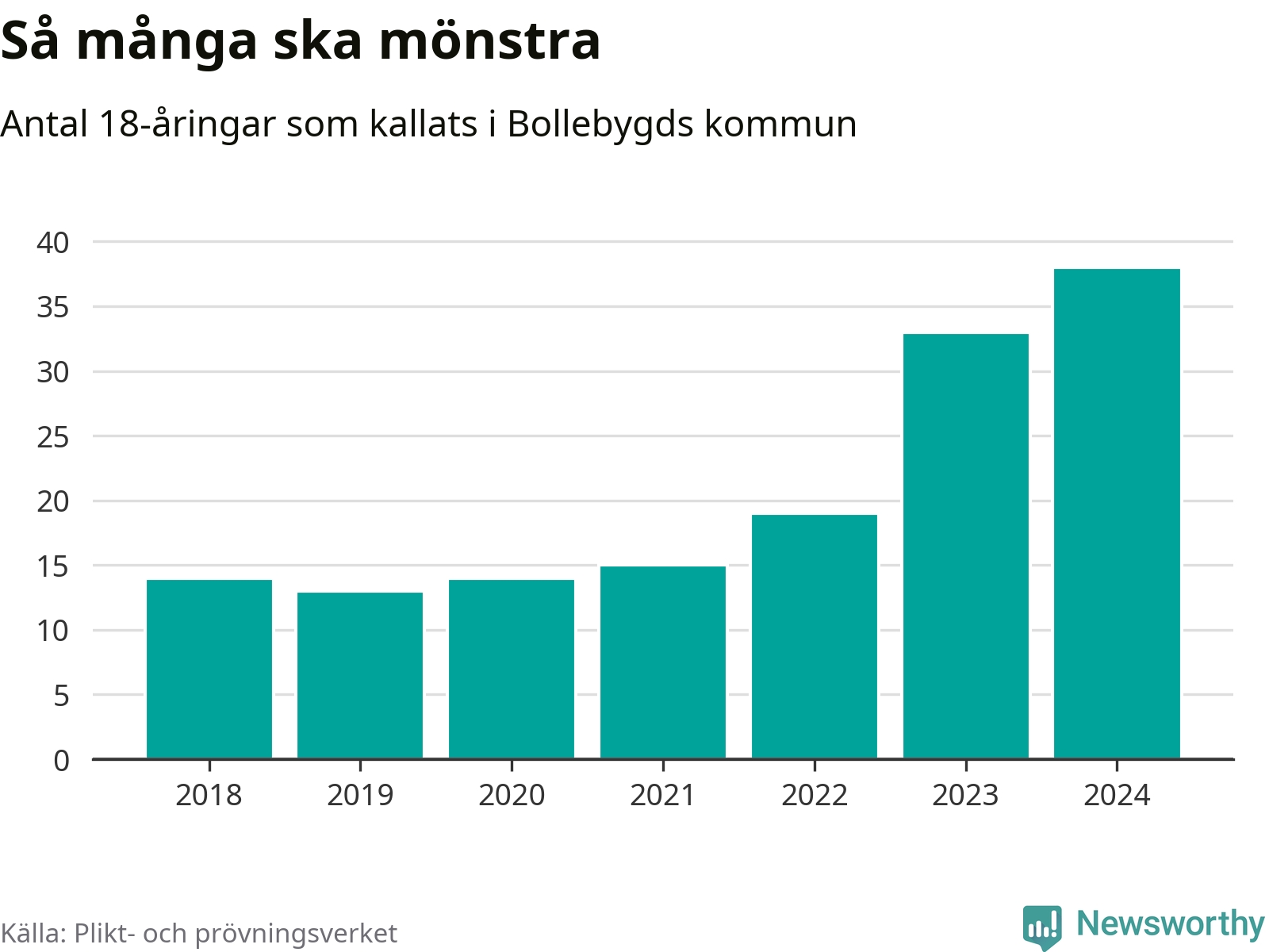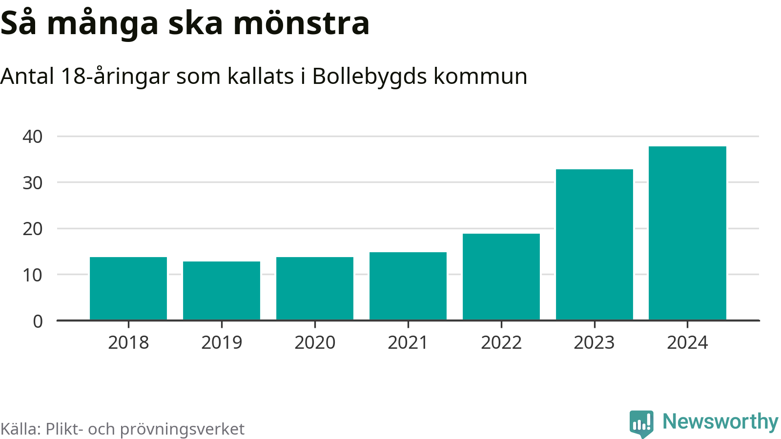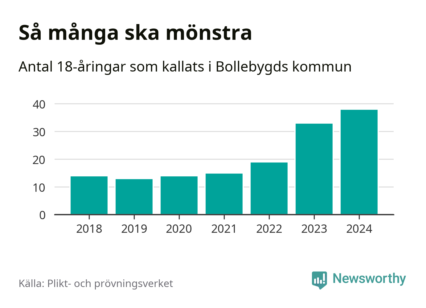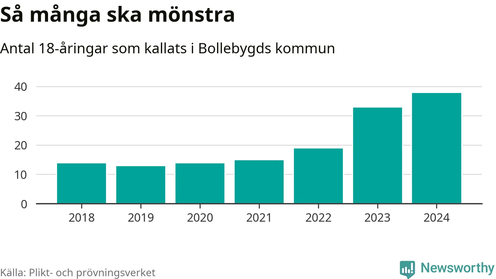 38 personer är det högsta antalet kallade i Bollebygd sedan 2018, som är första året med statistik på kommunnivå (värnplikten återinfördes 2017), och fem mönstrande mer än 2023. 2018 kallades som jämförelse 14 artonåringar från Bollebygd till mönstring. Det motsvarade ungefär 15 procent av årskullen född år 2000. Totalt från Västra Götalands län kallas 4 562 personer födda 2006 i år.