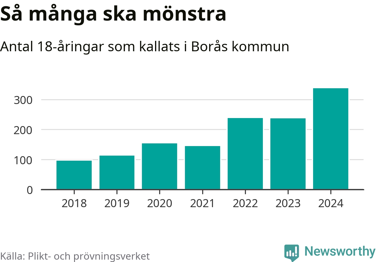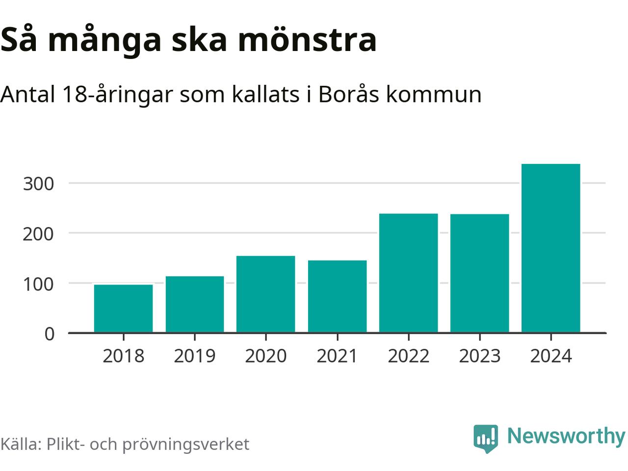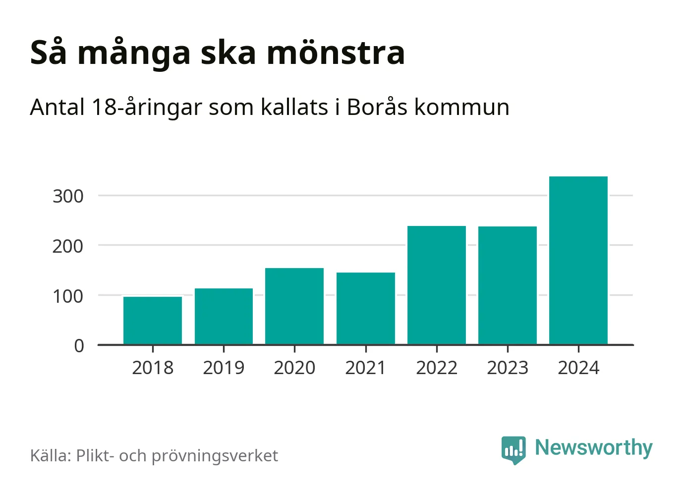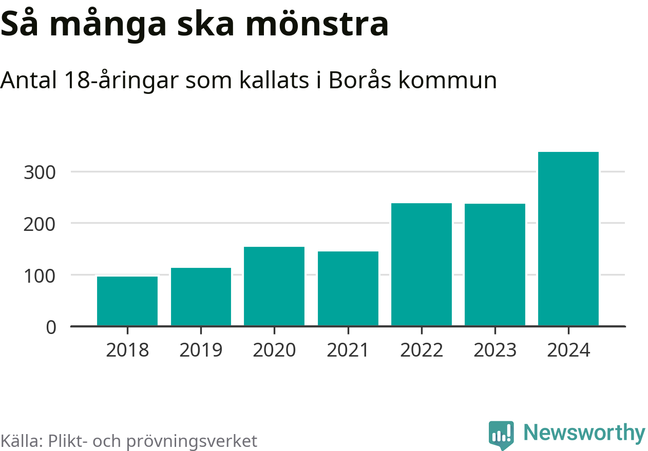 339 personer är det högsta antalet kallade i Borås sedan 2018, som är första året med statistik på kommunnivå (värnplikten återinfördes 2017), och 100 mönstrande mer än 2023. 2018 kallades som jämförelse 98 artonåringar från Borås till mönstring. Det motsvarade ungefär 8 procent av årskullen född år 2000. Totalt från Västra Götalands län kallas 4 562 personer födda 2006 i år.