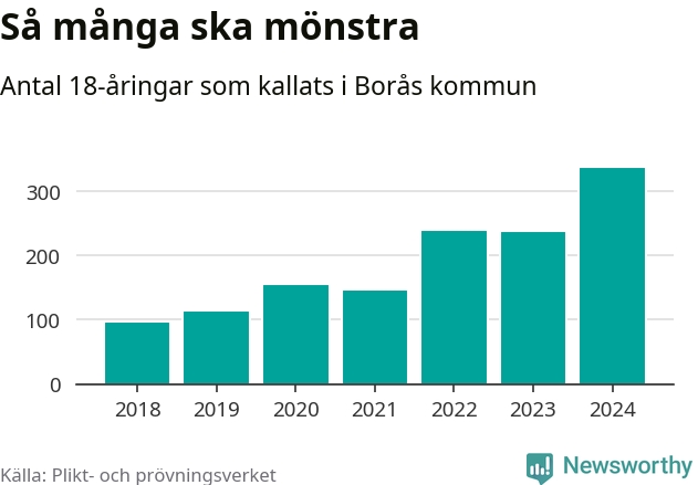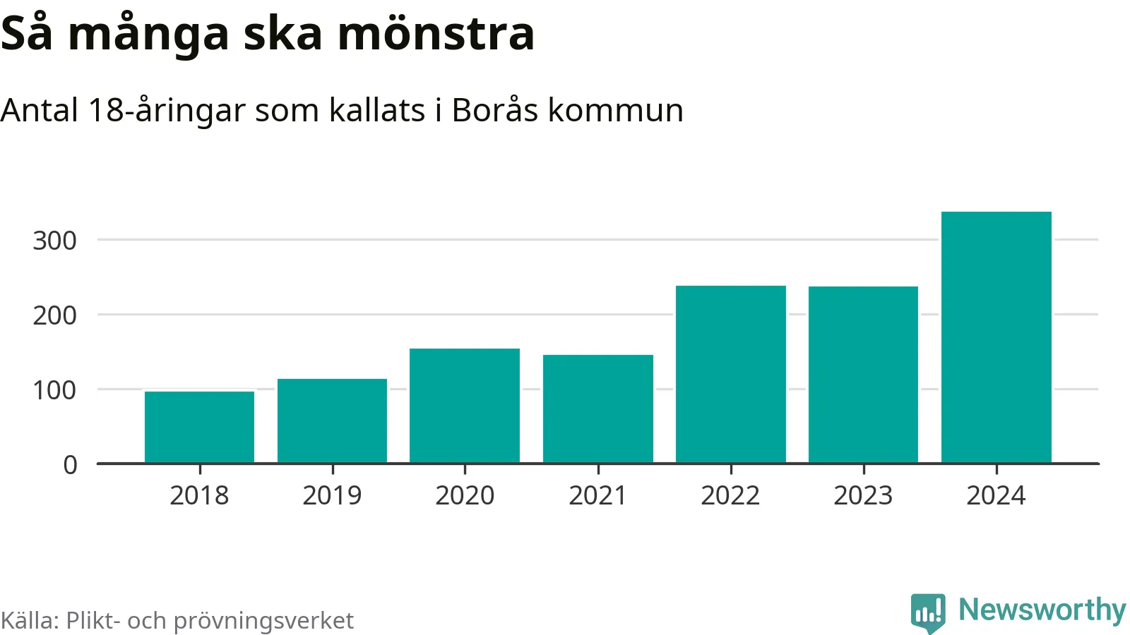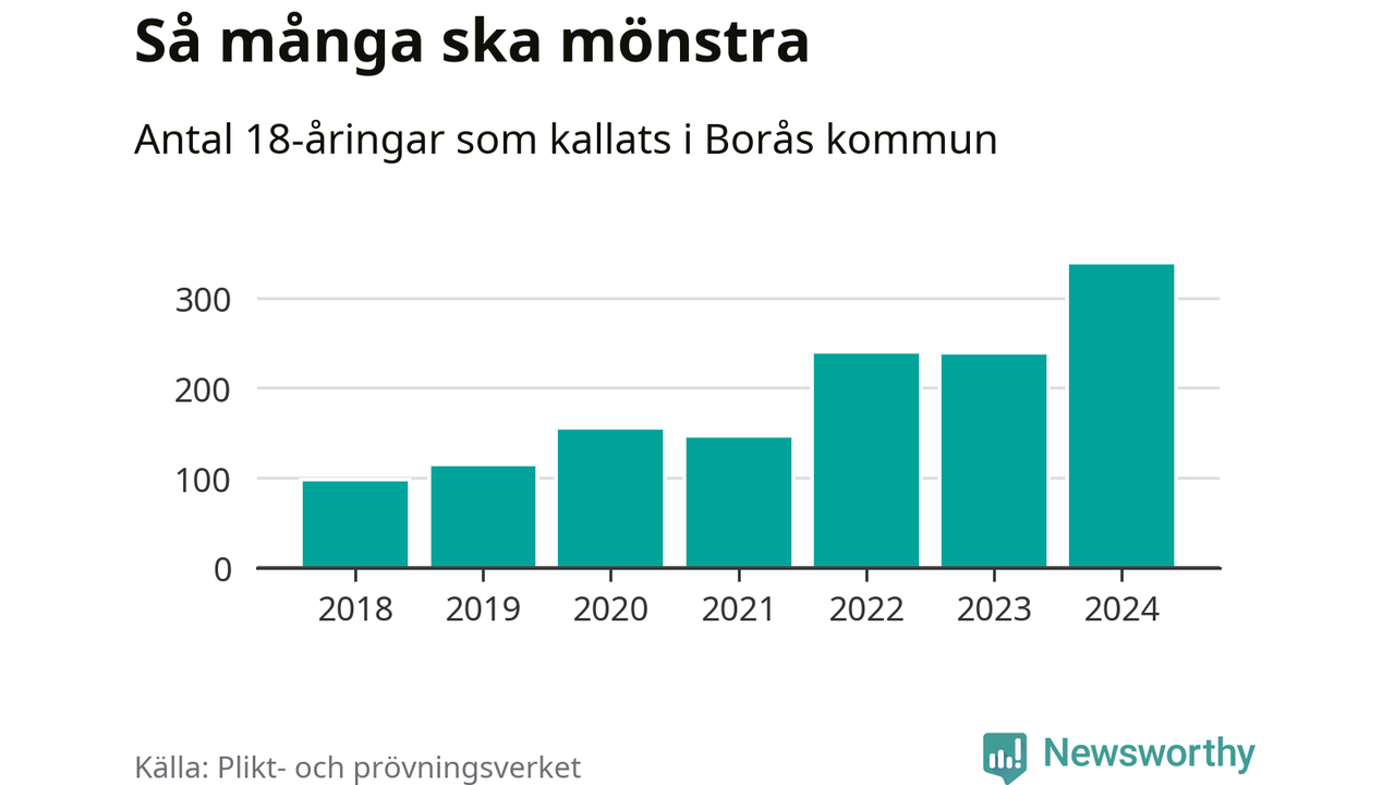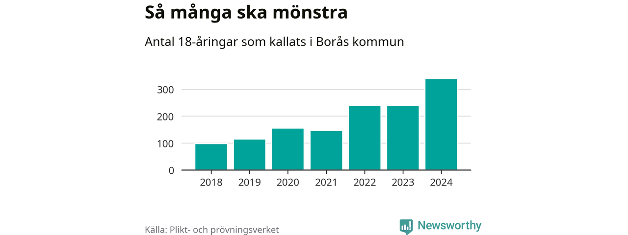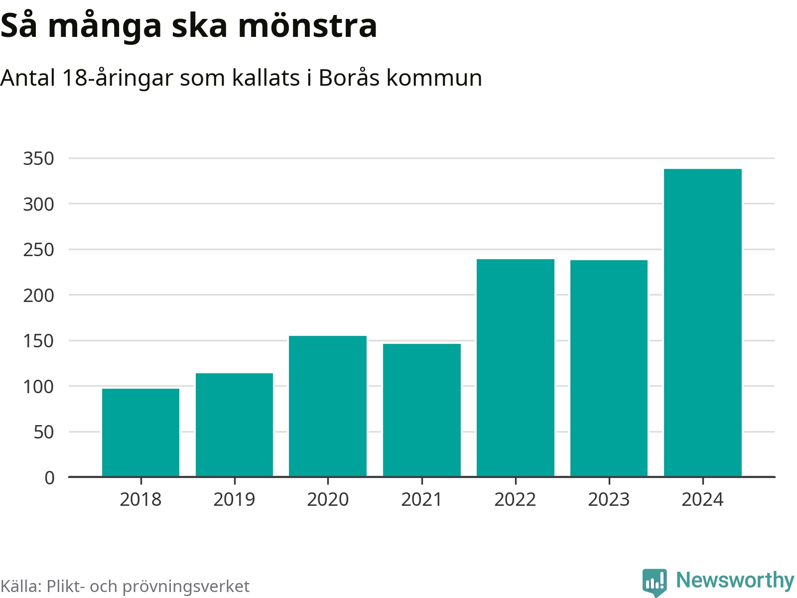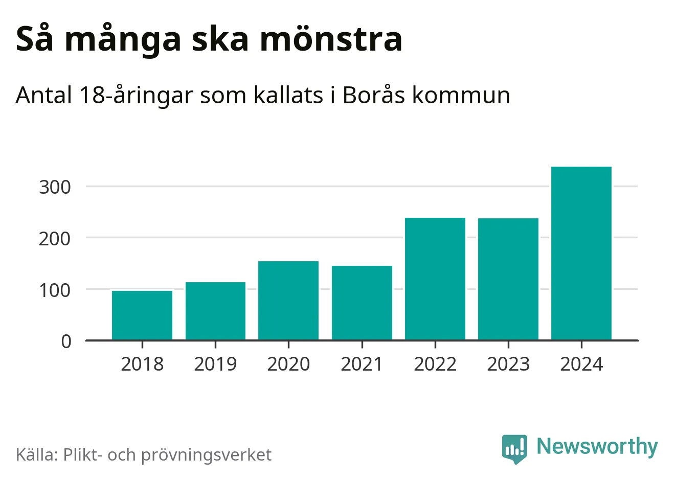 339 personer är det högsta antalet kallade i Borås sedan 2018, som är första året med statistik på kommunnivå (värnplikten återinfördes 2017), och 100 mönstrande mer än 2023. 2018 kallades som jämförelse 98 artonåringar från Borås till mönstring. Det motsvarade ungefär 8 procent av årskullen född år 2000. Totalt från Västra Götalands län kallas 4 562 personer födda 2006 i år.
