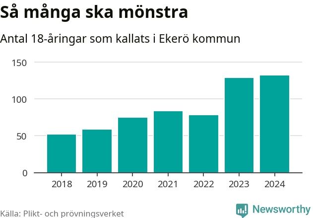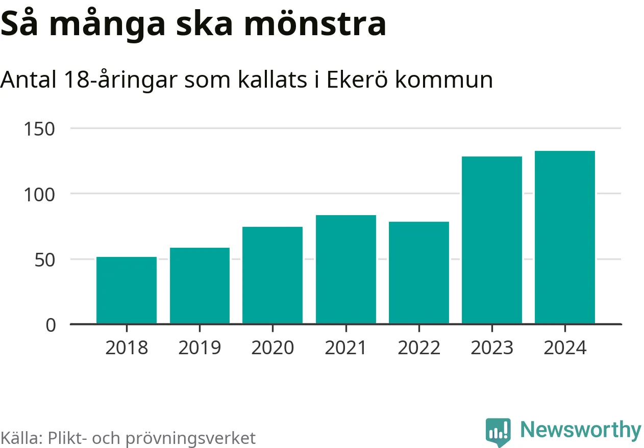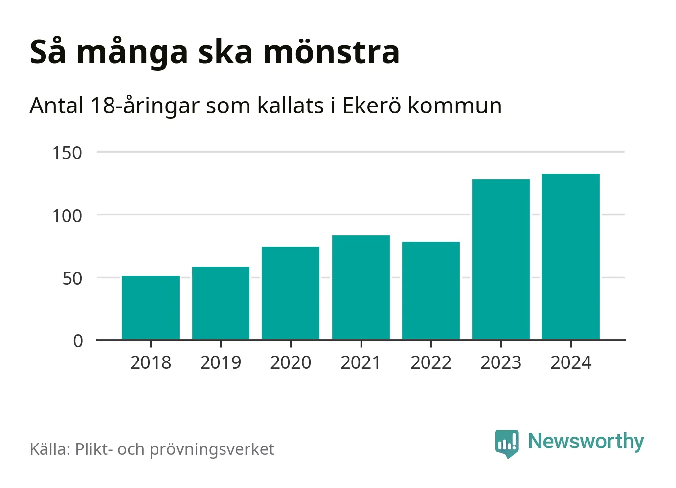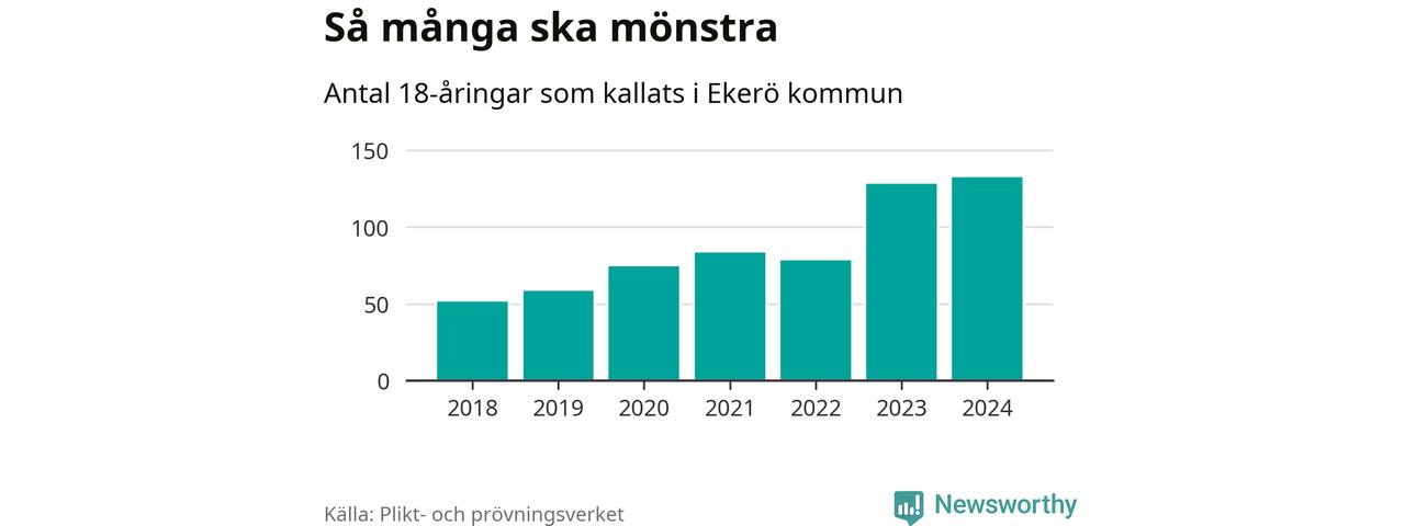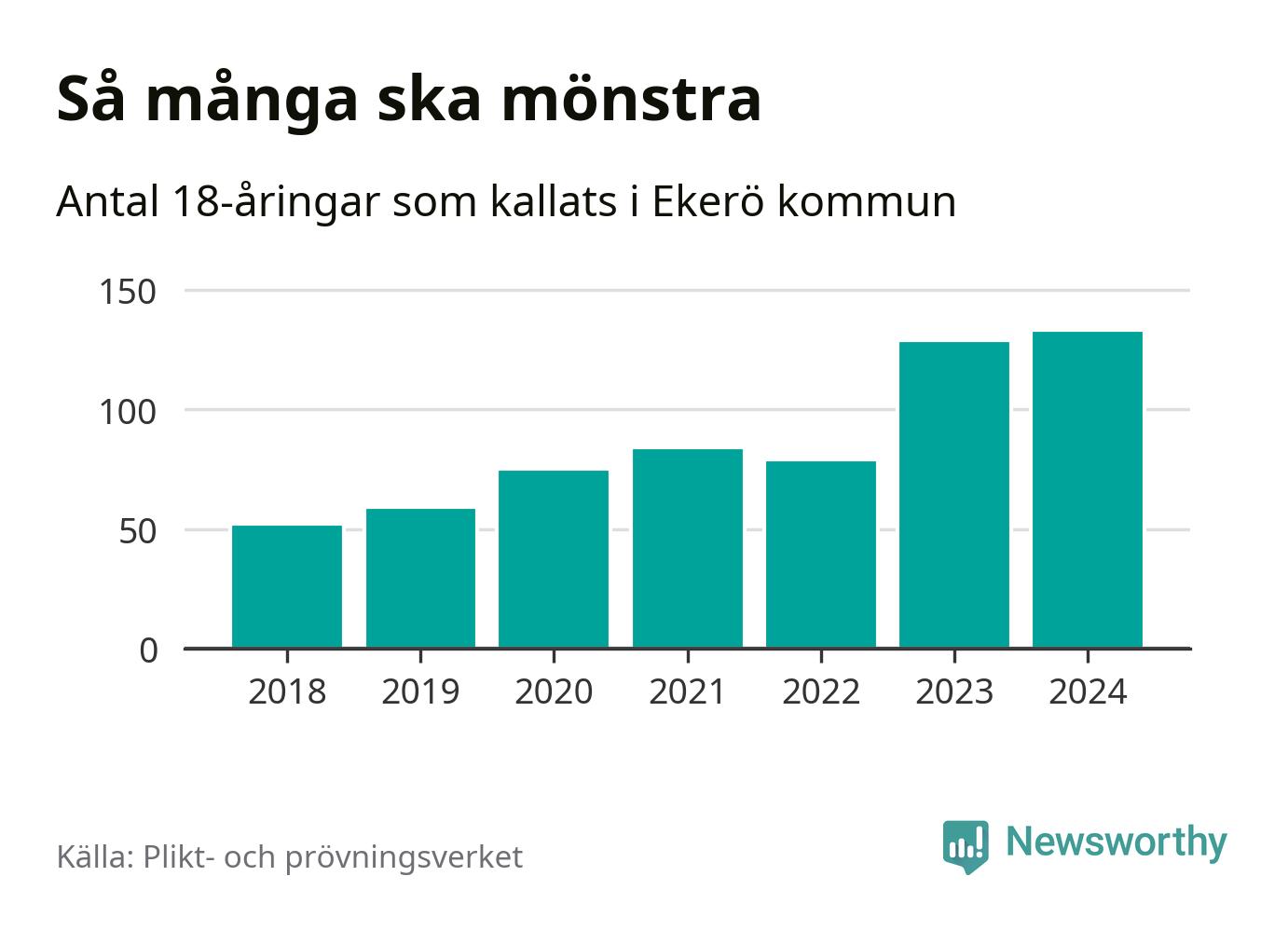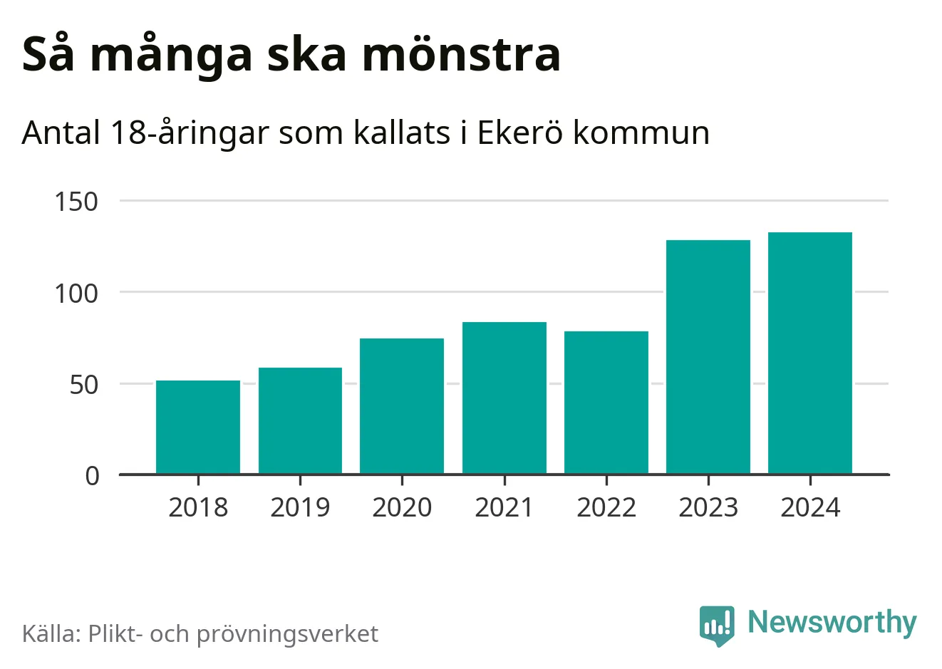 133 personer är det högsta antalet kallade i Ekerö sedan 2018, som är första året med statistik på kommunnivå (värnplikten återinfördes 2017), och fyra mönstrande mer än 2023. 2018 kallades som jämförelse 52 artonåringar från Ekerö till mönstring. Det motsvarade ungefär 15 procent av årskullen född år 2000. Totalt från Stockholms län kallas 6 488 personer födda 2006 i år.