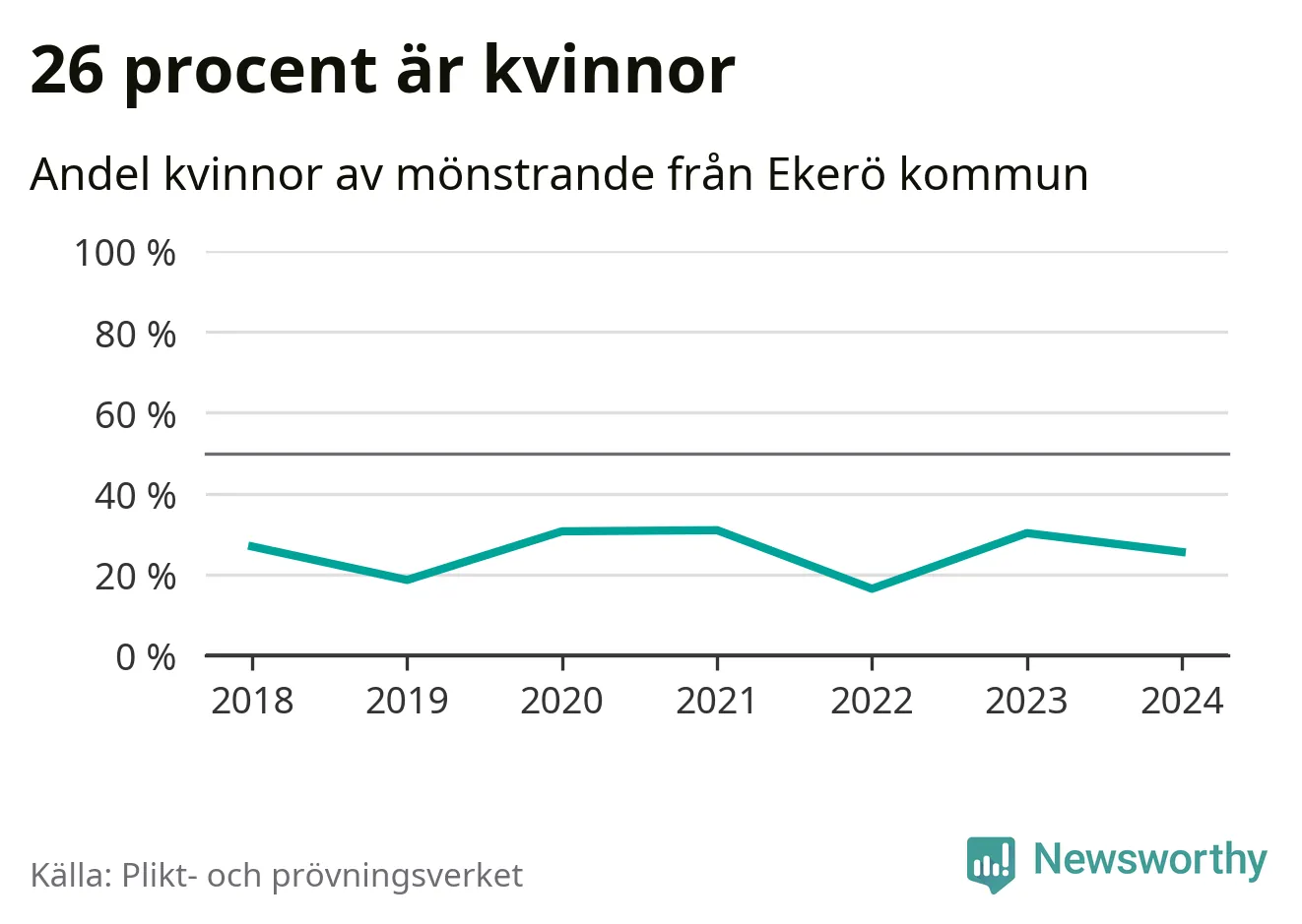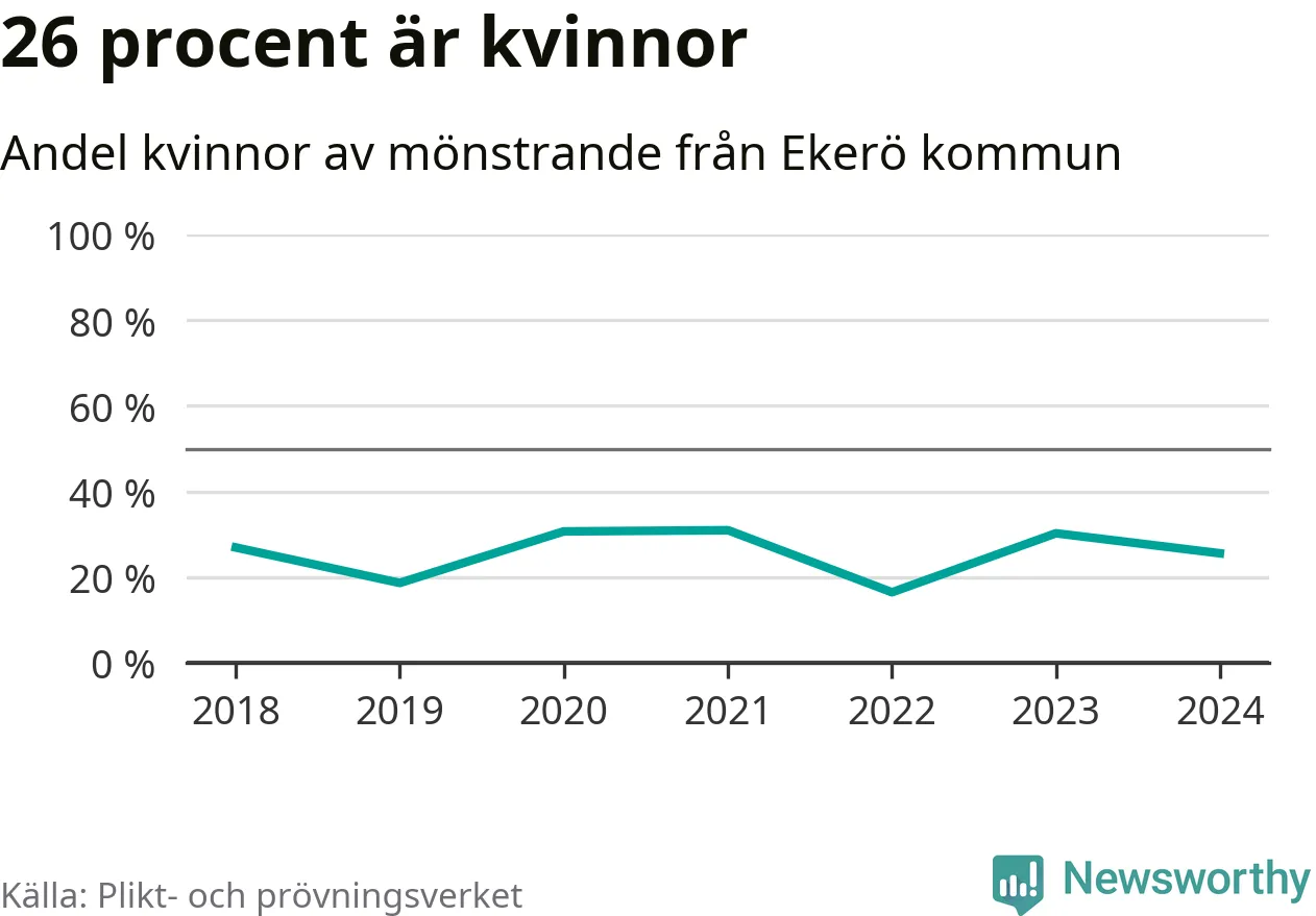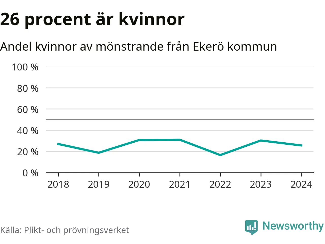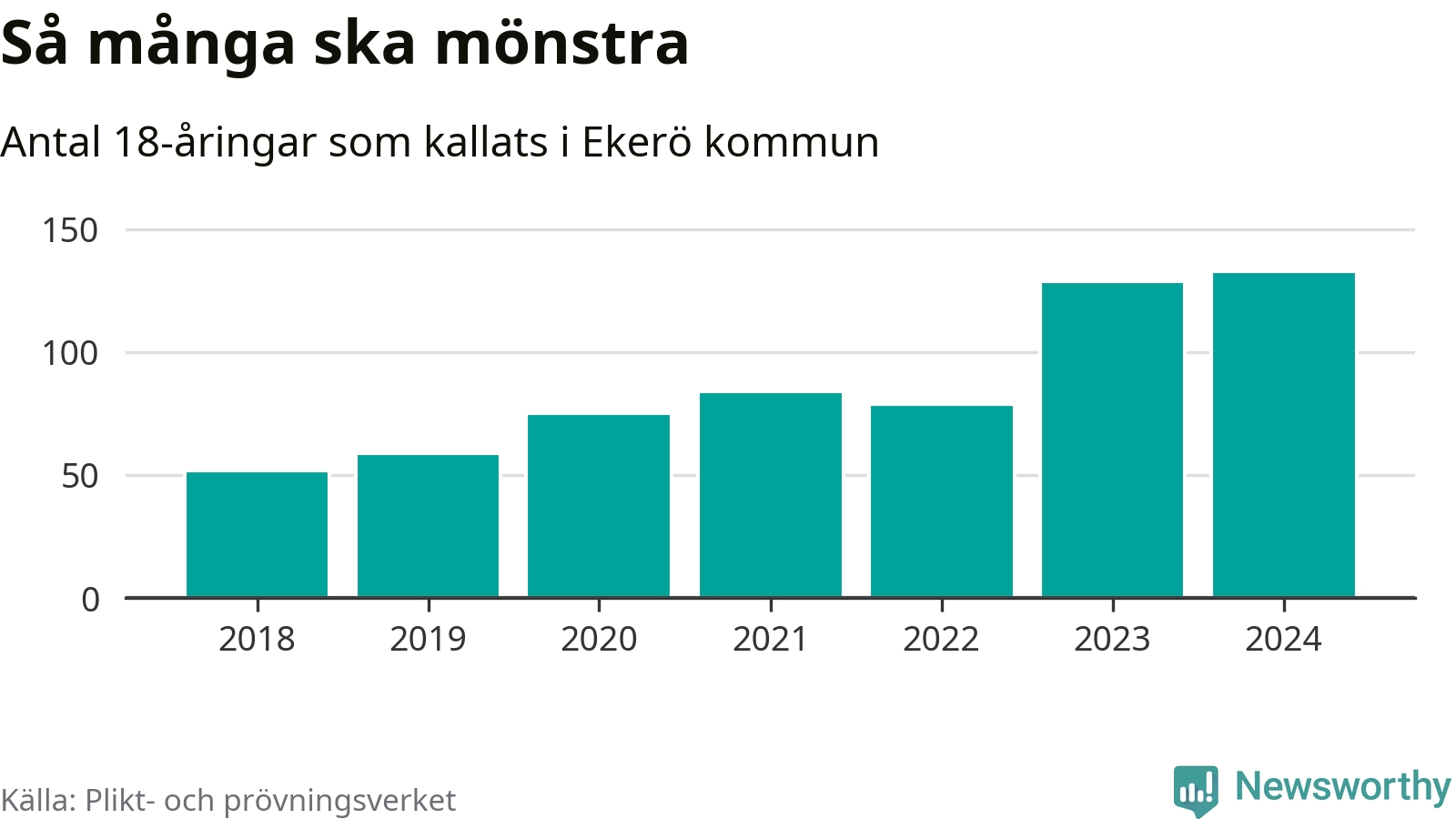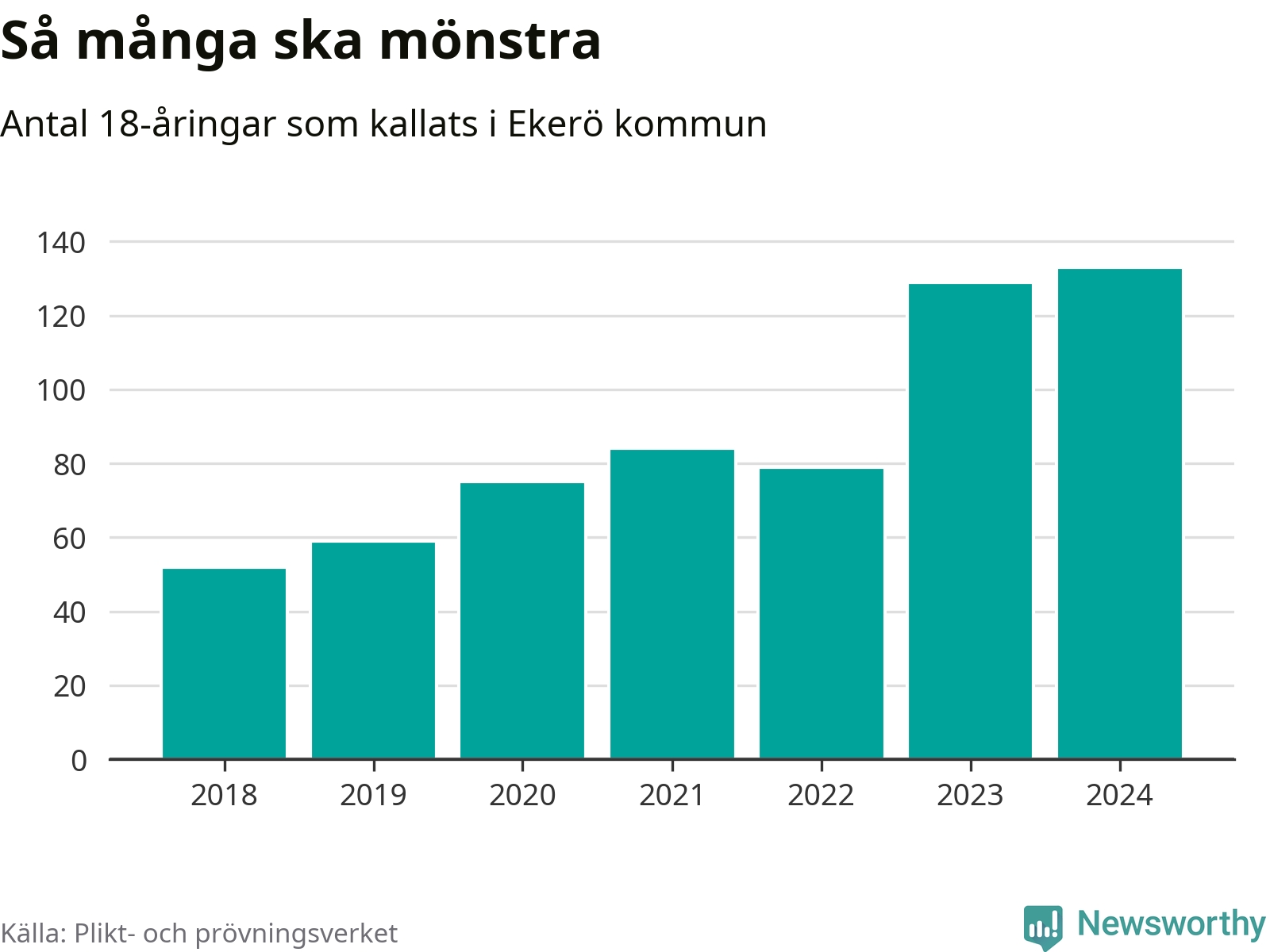 133 personer är det högsta antalet kallade i Ekerö sedan 2018, som är första året med statistik på kommunnivå (värnplikten återinfördes 2017), och fyra mönstrande mer än 2023. 2018 kallades som jämförelse 52 artonåringar från Ekerö till mönstring. Det motsvarade ungefär 15 procent av årskullen född år 2000. Totalt från Stockholms län kallas 6 488 personer födda 2006 i år.
