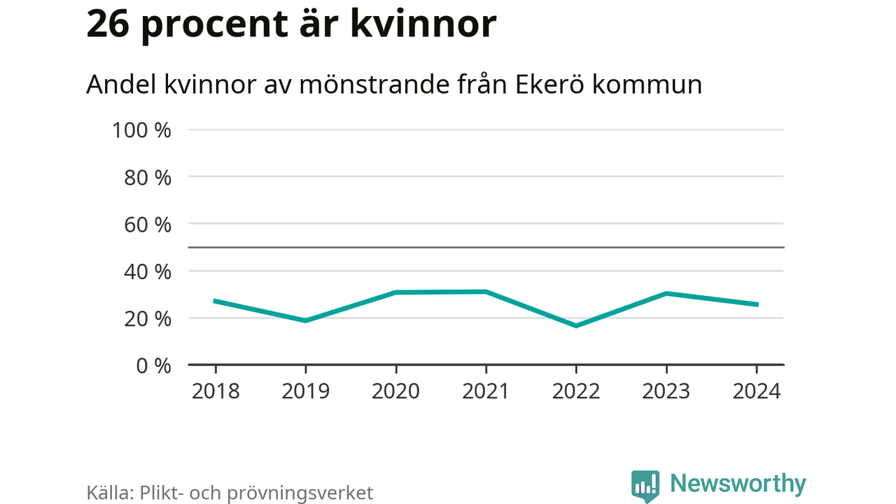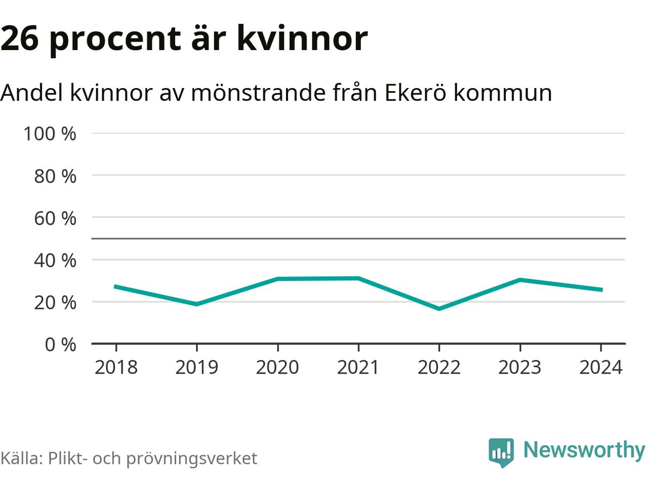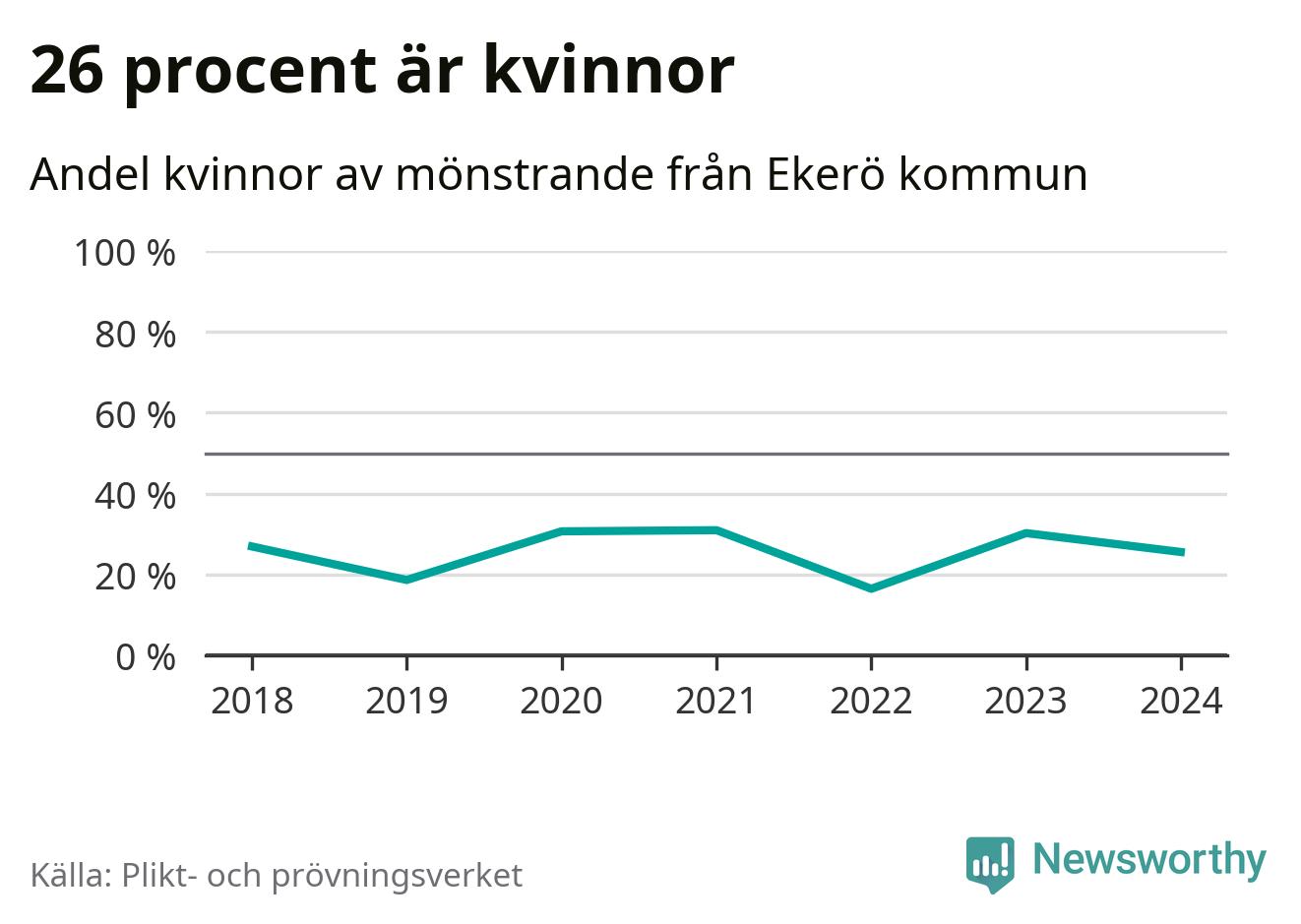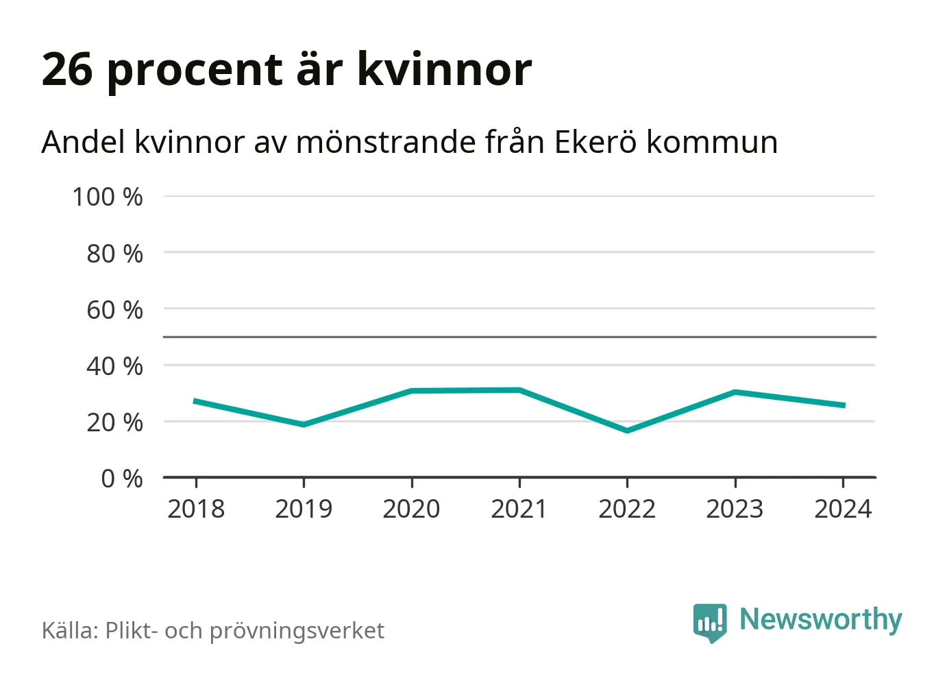 34 av de som kallats till mönstring från Ekerö är kvinnor, vilket motsvarar 26 procent av de mönstrande. Som mest har 39 kvinnor kallats från kommunen (2023). I riket som helhet är 30 procent av de mönstrande tjejer.