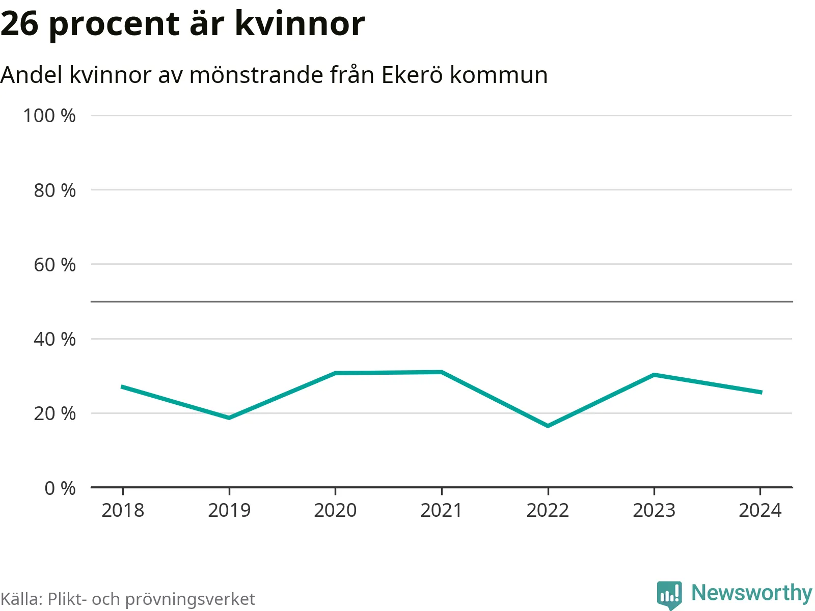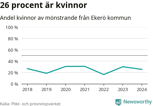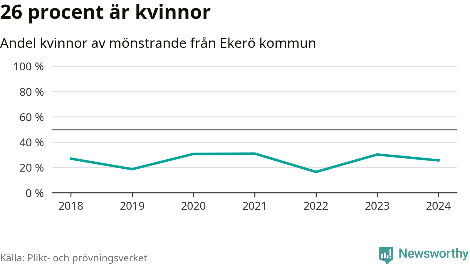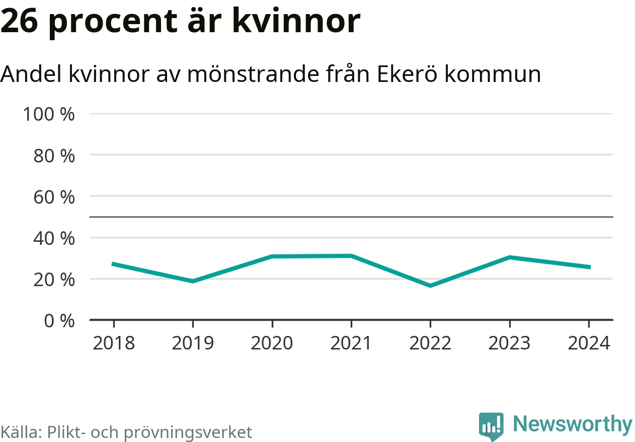 34 av de som kallats till mönstring från Ekerö är kvinnor, vilket motsvarar 26 procent av de mönstrande. Som mest har 39 kvinnor kallats från kommunen (2023). I riket som helhet är 30 procent av de mönstrande tjejer.