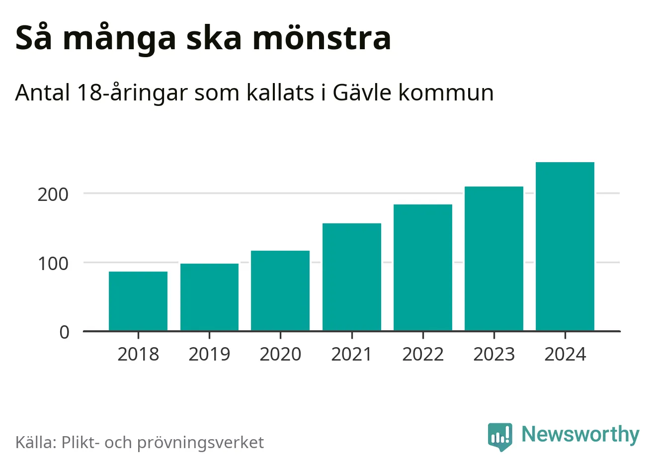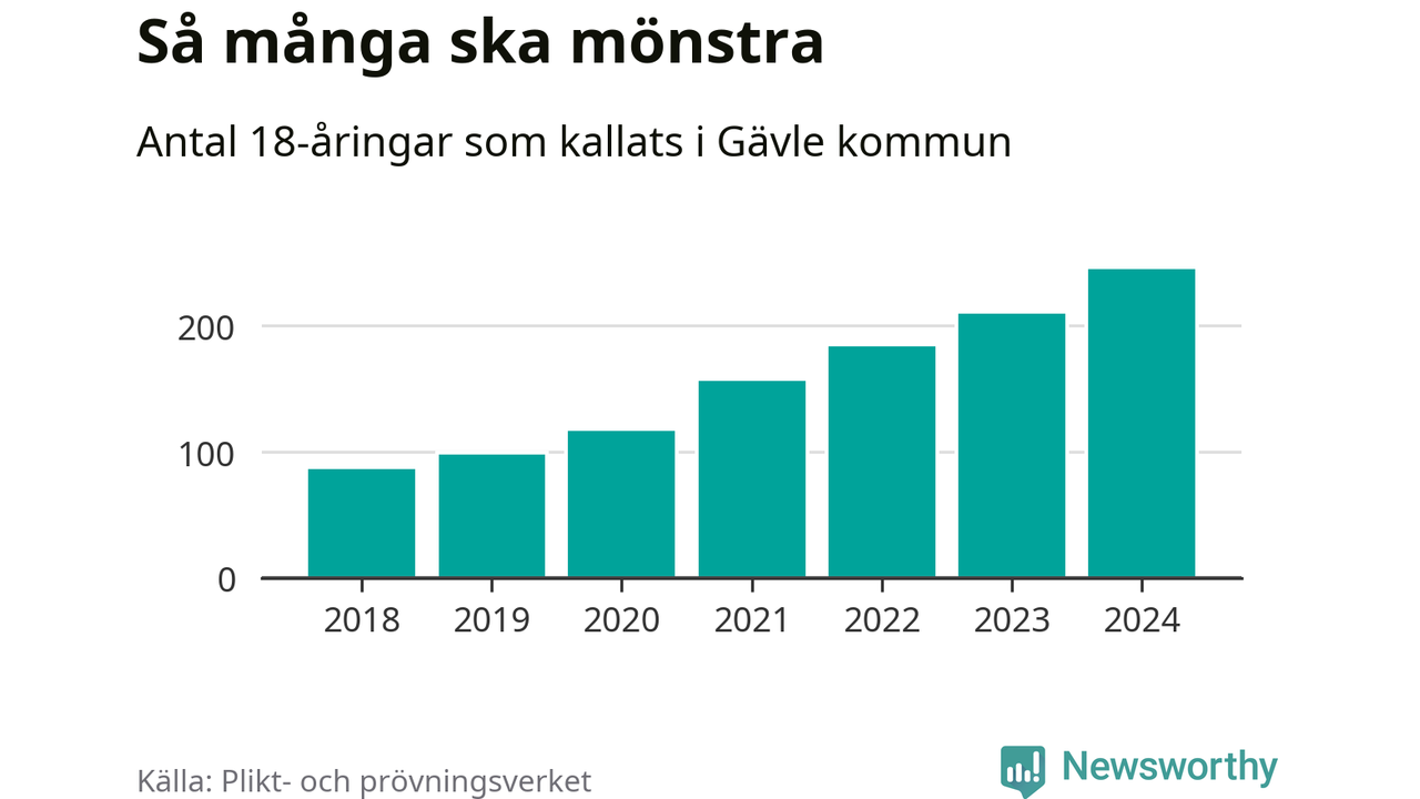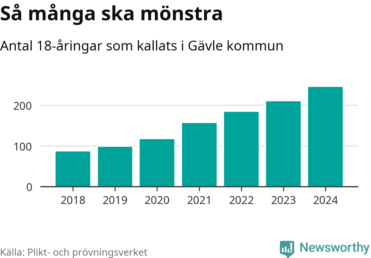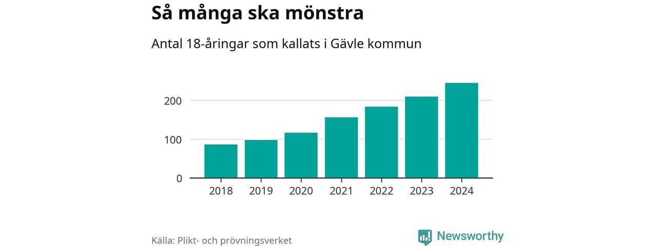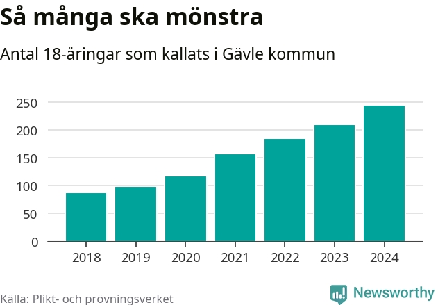 Antalet kallade i Gävle har ökat varje år sedan 2018, som är första året med statistik på kommunnivå (värnplikten återinfördes 2017), och jämfört med 2023 är det 35 fler i år. 2018 kallades som jämförelse 88 artonåringar från Gävle till mönstring. Det motsvarade ungefär 8 procent av årskullen född år 2000. Totalt från Gävleborgs län kallas 715 personer födda 2006 i år.