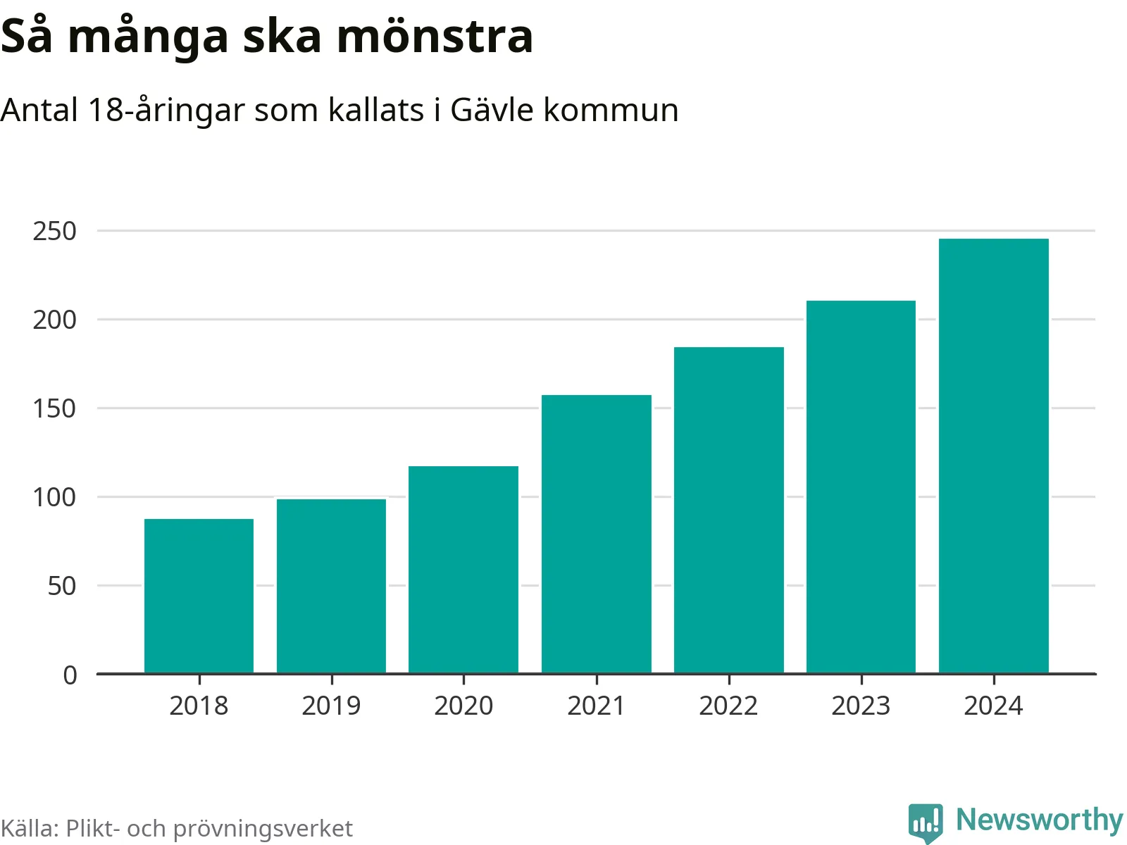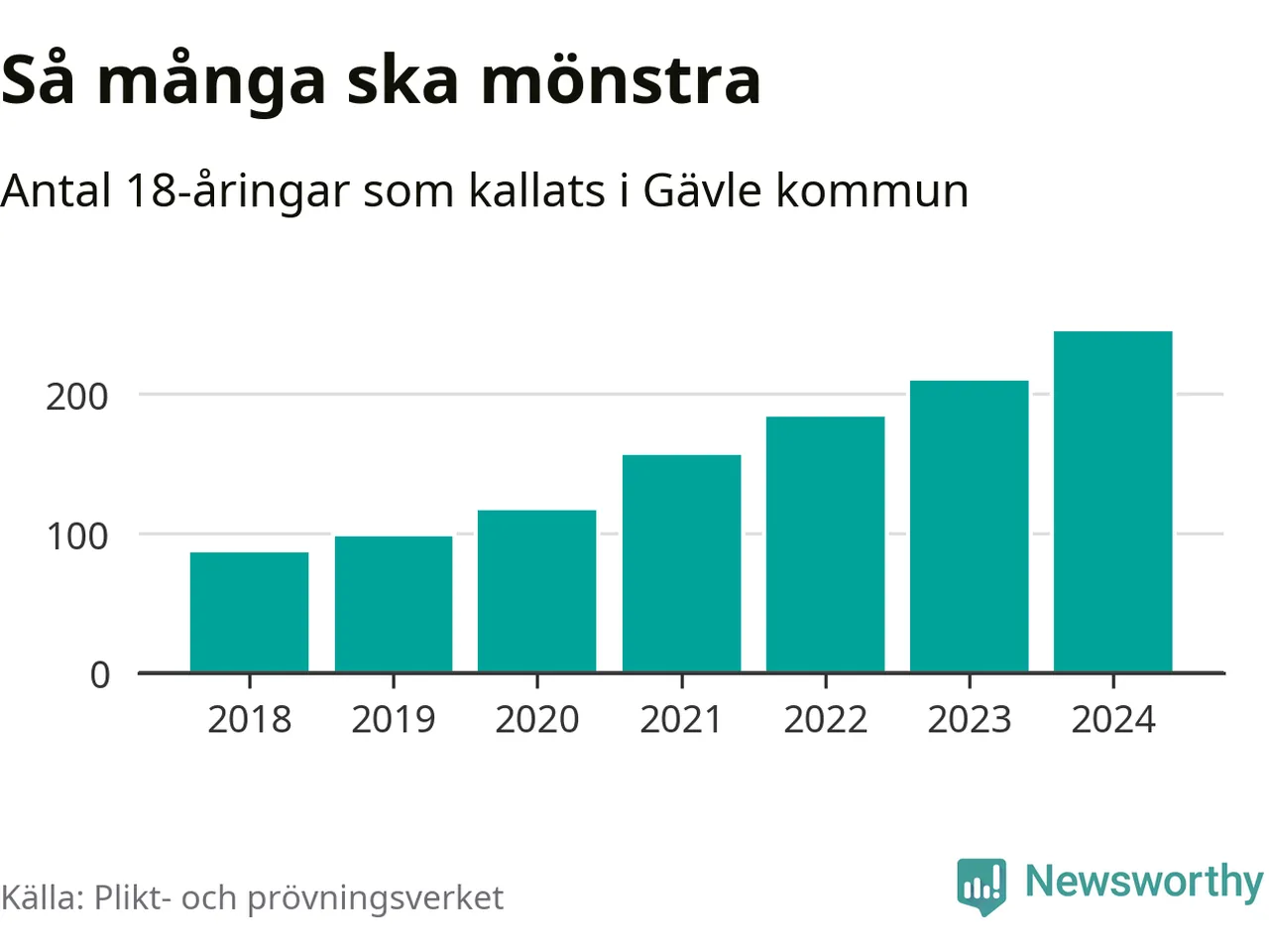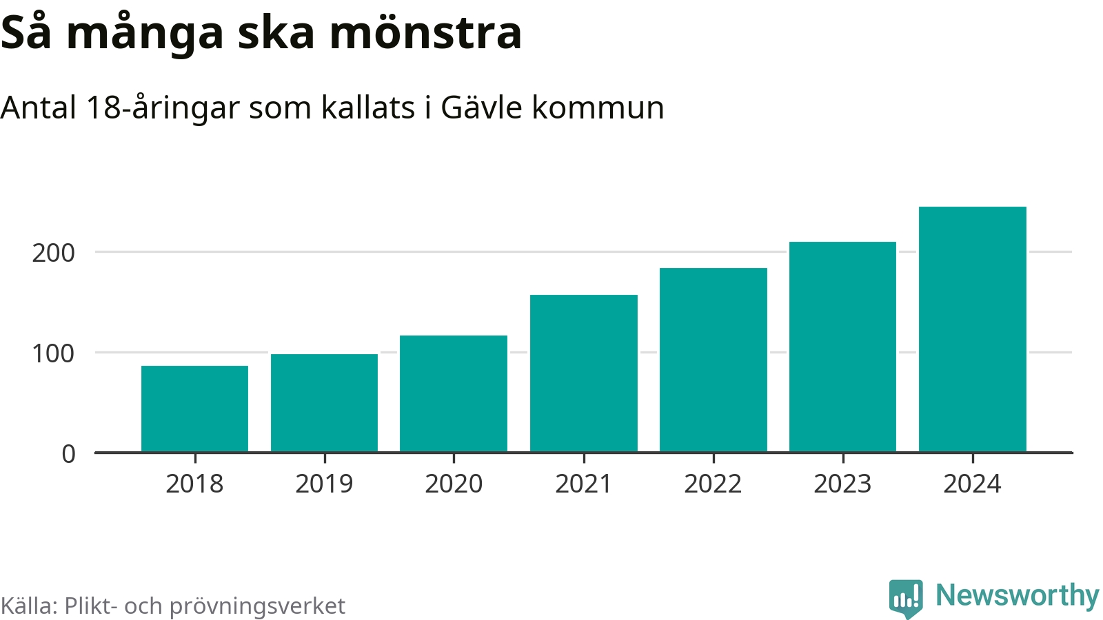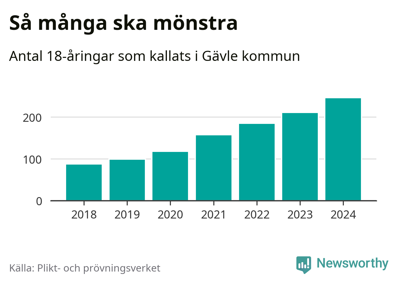 Antalet kallade i Gävle har ökat varje år sedan 2018, som är första året med statistik på kommunnivå (värnplikten återinfördes 2017), och jämfört med 2023 är det 35 fler i år. 2018 kallades som jämförelse 88 artonåringar från Gävle till mönstring. Det motsvarade ungefär 8 procent av årskullen född år 2000. Totalt från Gävleborgs län kallas 715 personer födda 2006 i år.