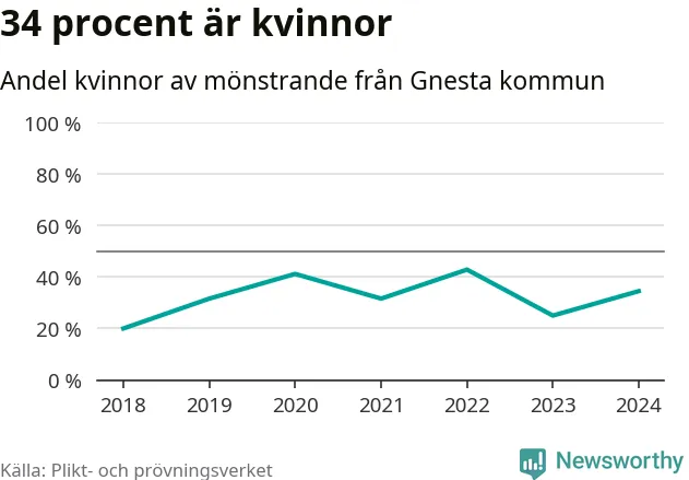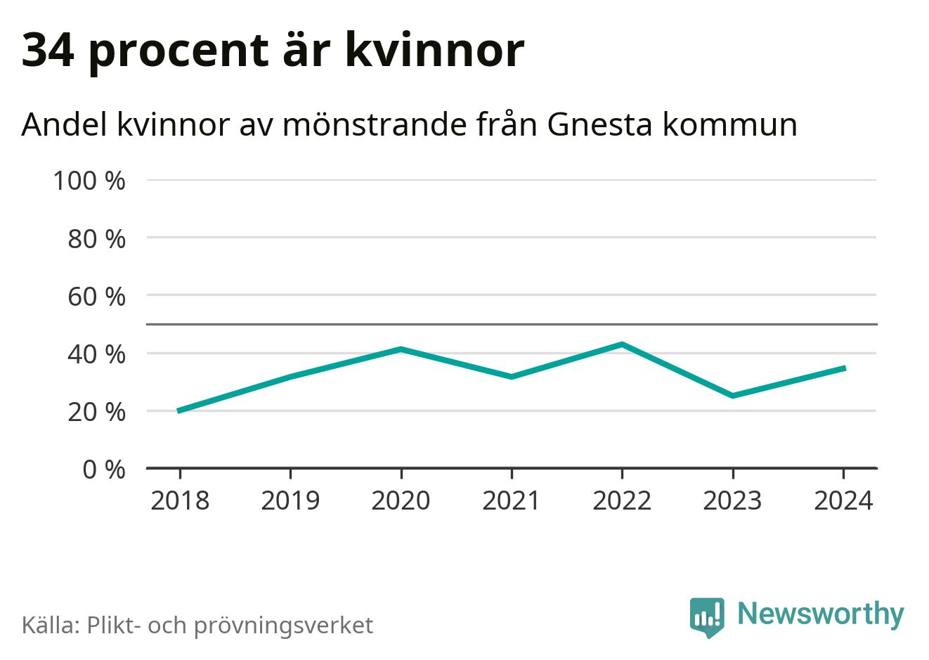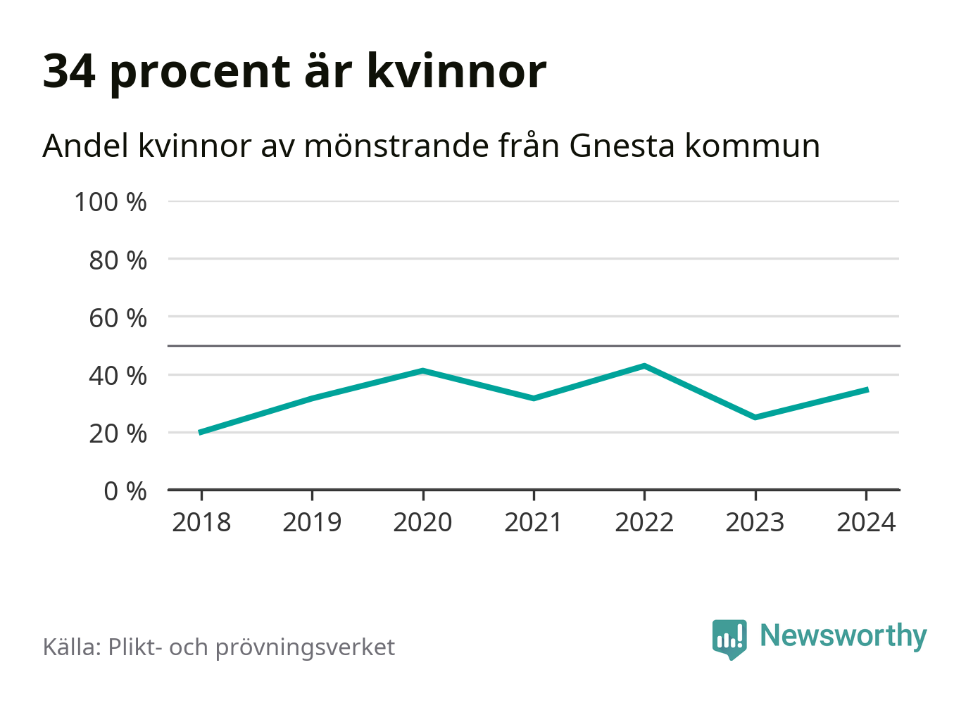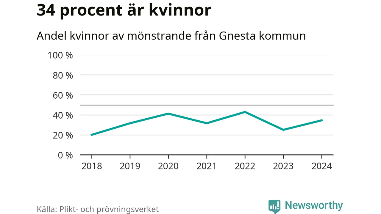 Tio av de som kallats till mönstring från Gnesta är kvinnor, vilket motsvarar 34 procent av de mönstrande. I absoluta tal är det fler kvinnor än något år sedan värnplikten återinfördes, men 2022 var en större andel av de mönstrande från kommunen kvinnor (43 procent). I riket som helhet är 30 procent av de mönstrande tjejer.