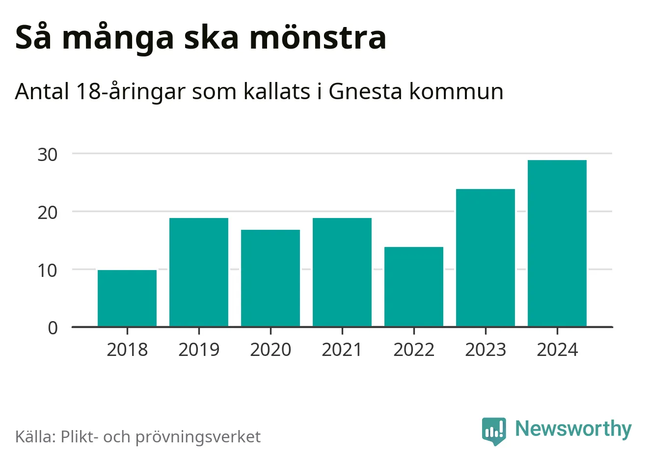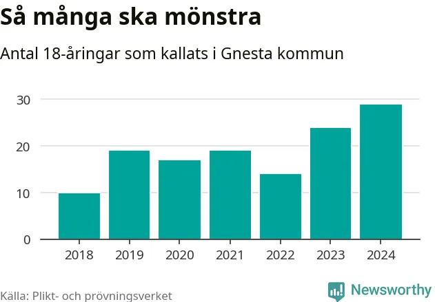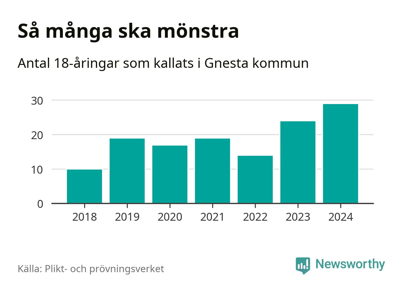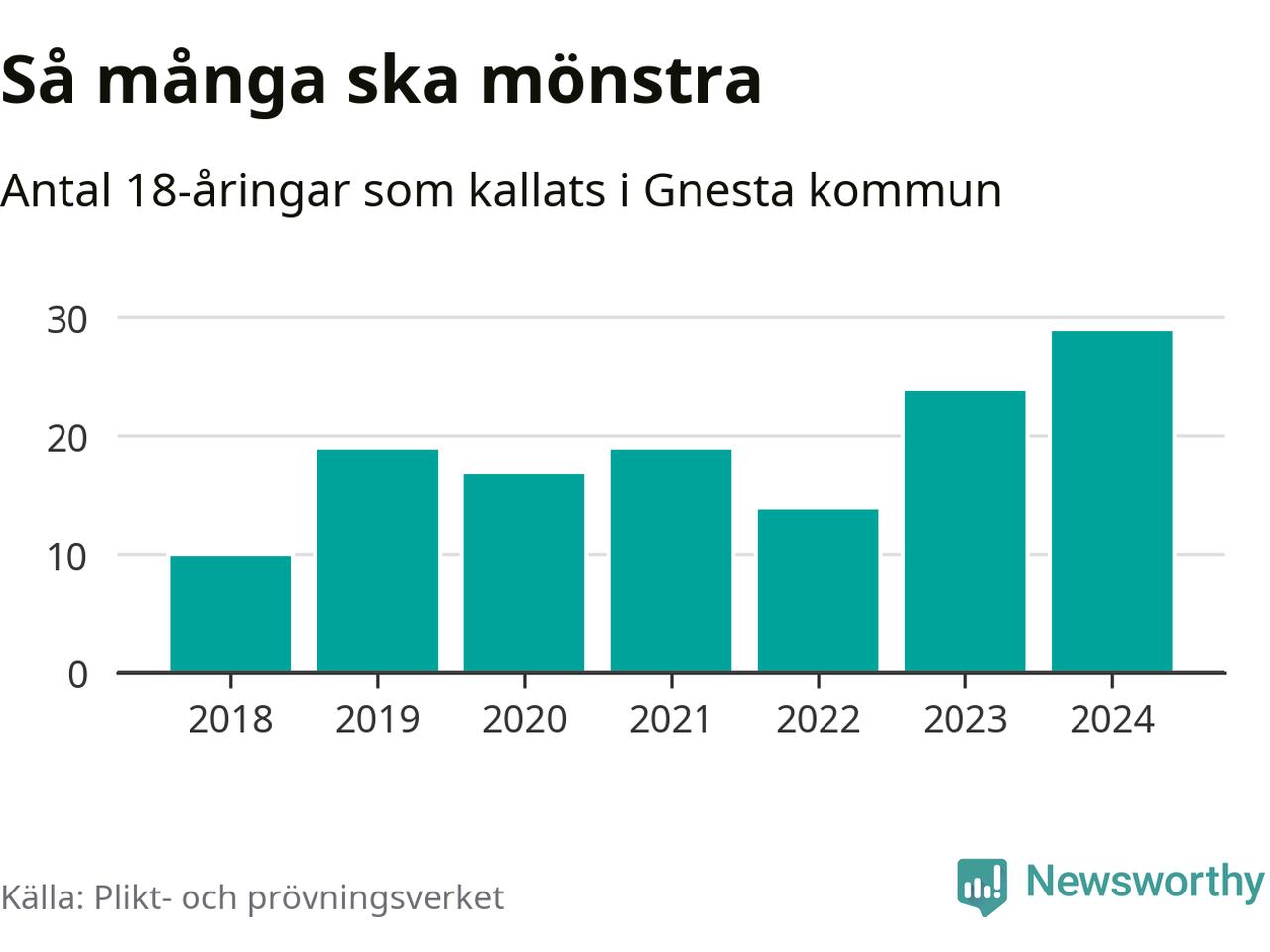 29 personer är det högsta antalet kallade i Gnesta sedan 2018, som är första året med statistik på kommunnivå (värnplikten återinfördes 2017), och fem mönstrande mer än 2023. 2018 kallades som jämförelse tio 18-åringar från Gnesta till mönstring. Det motsvarade ungefär 9 procent av årskullen född år 2000. Totalt från Södermanlands län kallas 817 personer födda 2006 i år.