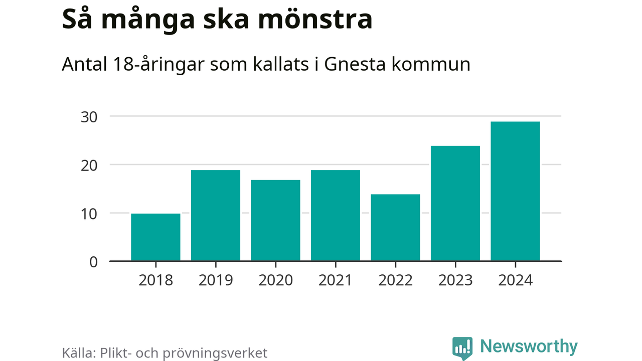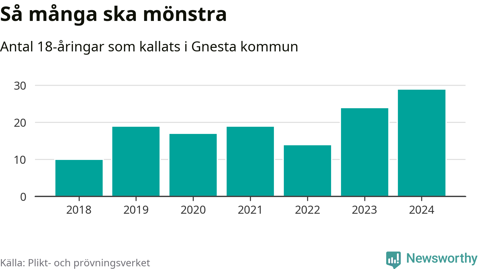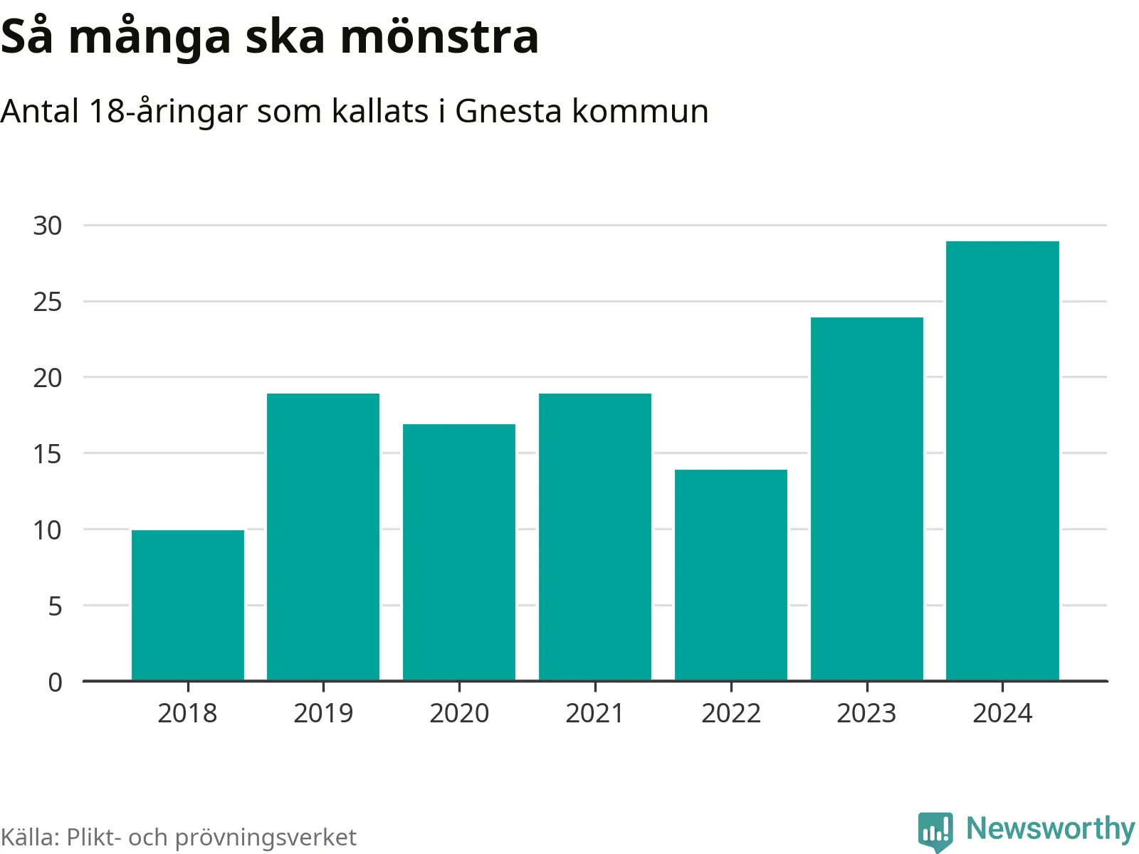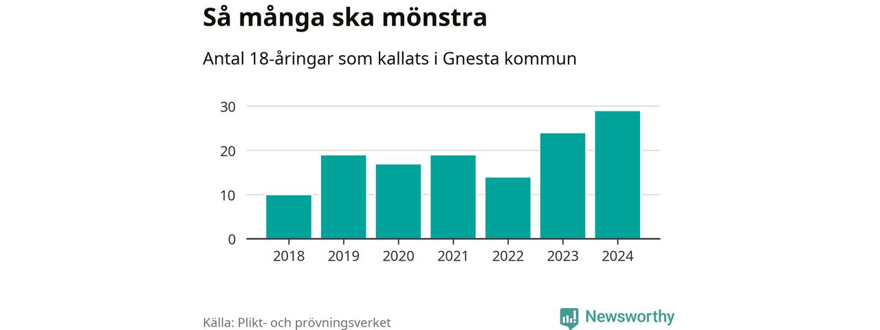 29 personer är det högsta antalet kallade i Gnesta sedan 2018, som är första året med statistik på kommunnivå (värnplikten återinfördes 2017), och fem mönstrande mer än 2023. 2018 kallades som jämförelse tio 18-åringar från Gnesta till mönstring. Det motsvarade ungefär 9 procent av årskullen född år 2000. Totalt från Södermanlands län kallas 817 personer födda 2006 i år.