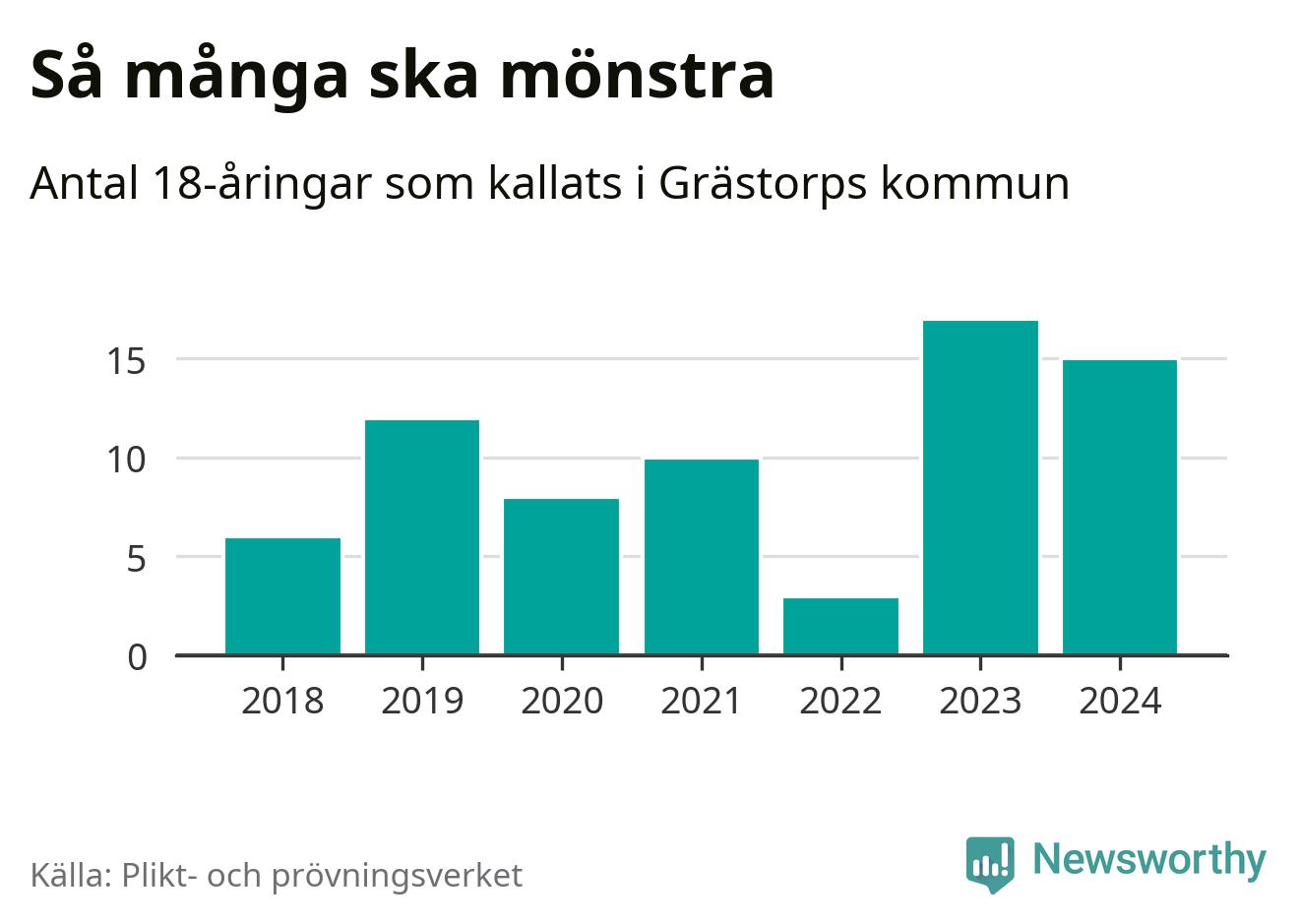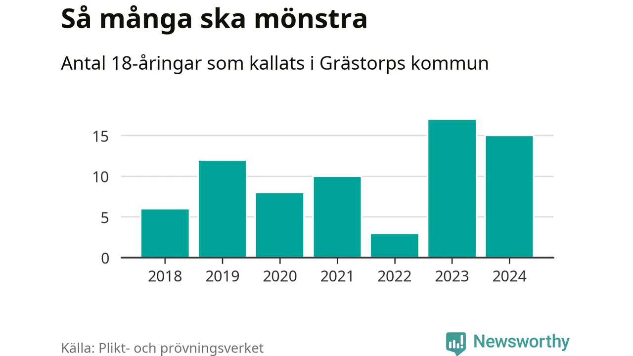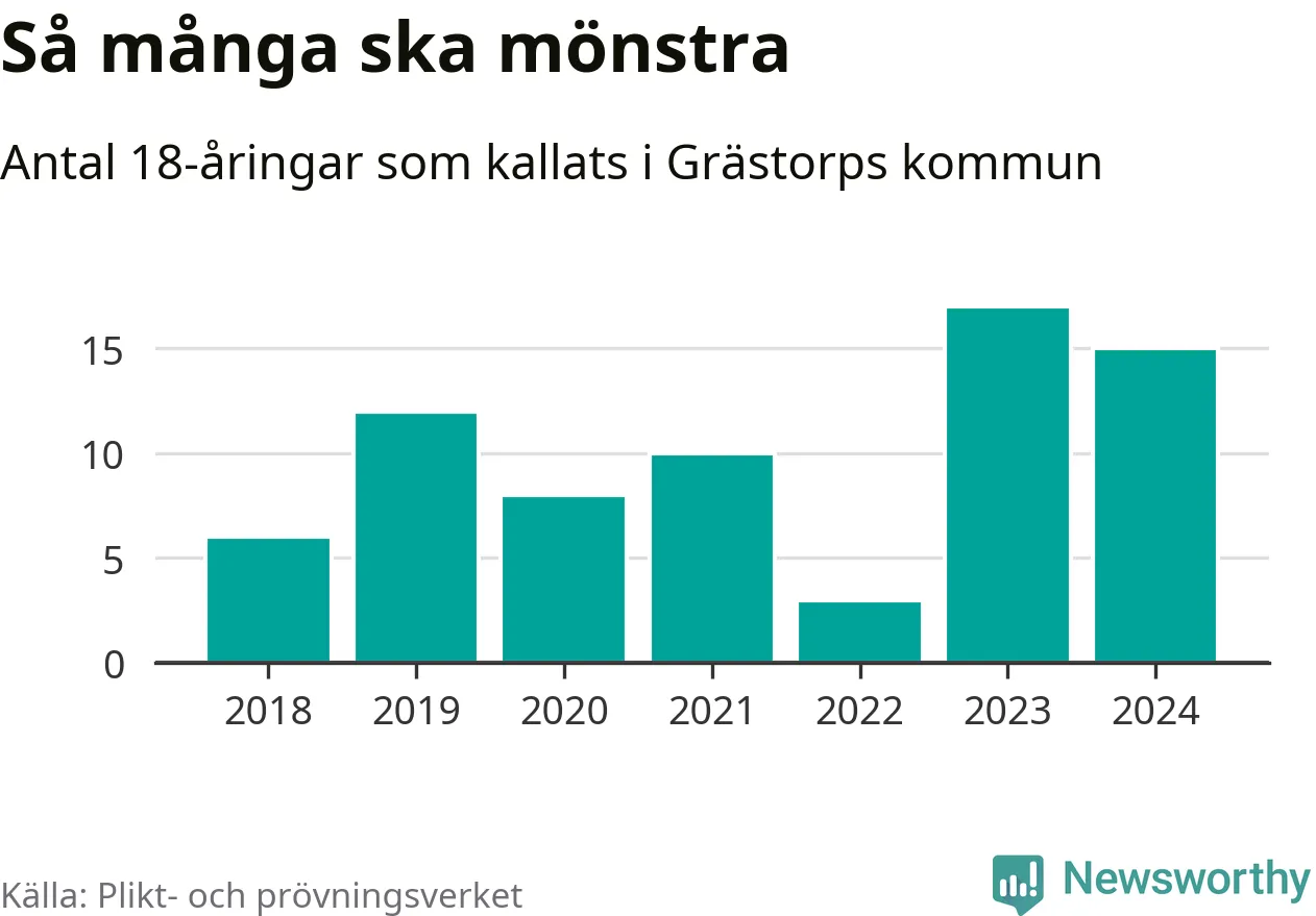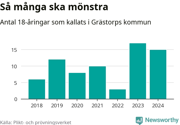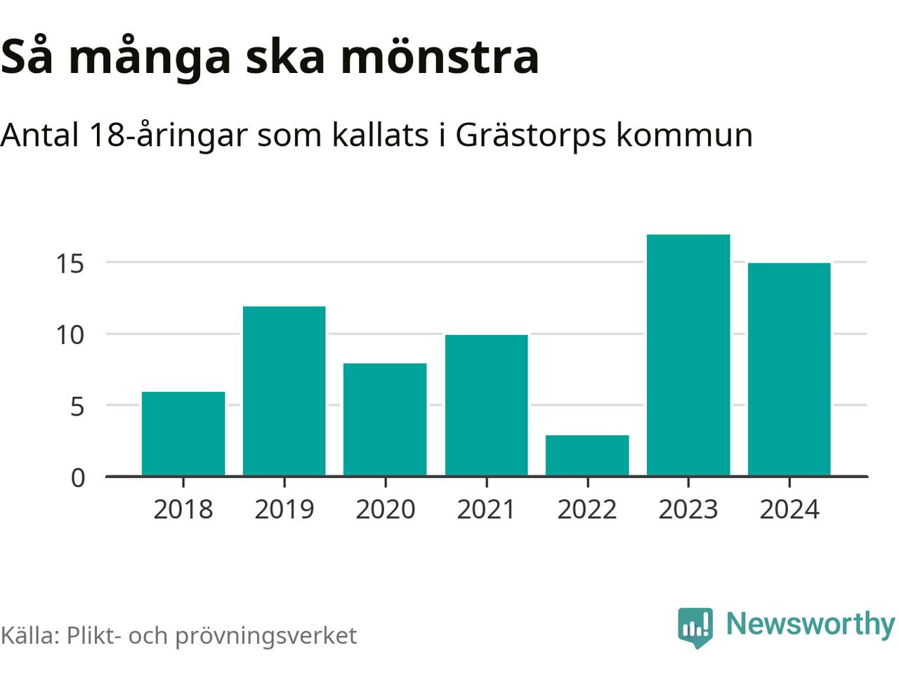 15 personer är två färre än 2023. 2018 kallades som jämförelse sex 18-åringar från Grästorp till mönstring. Det motsvarade ungefär 11 procent av årskullen född år 2000. Totalt från Västra Götalands län kallas 4 562 personer födda 2006 i år.