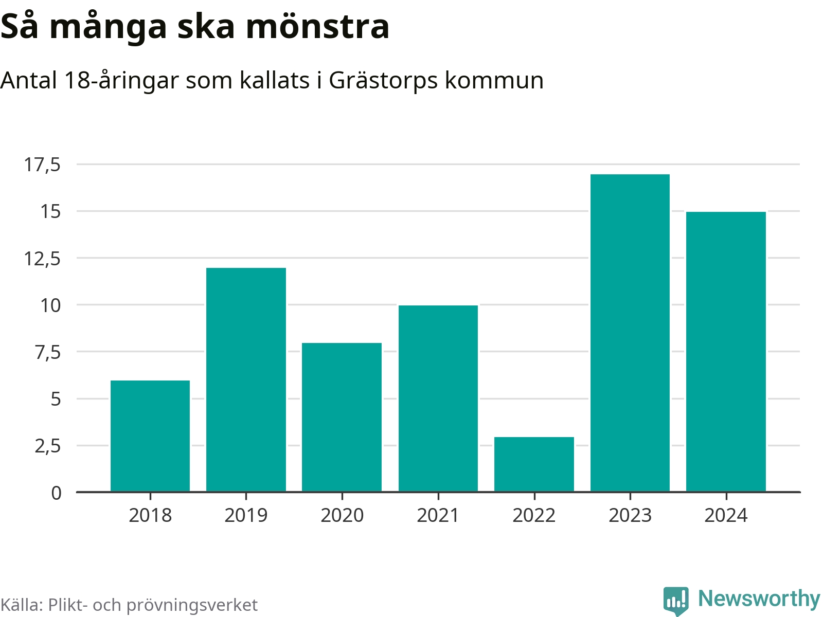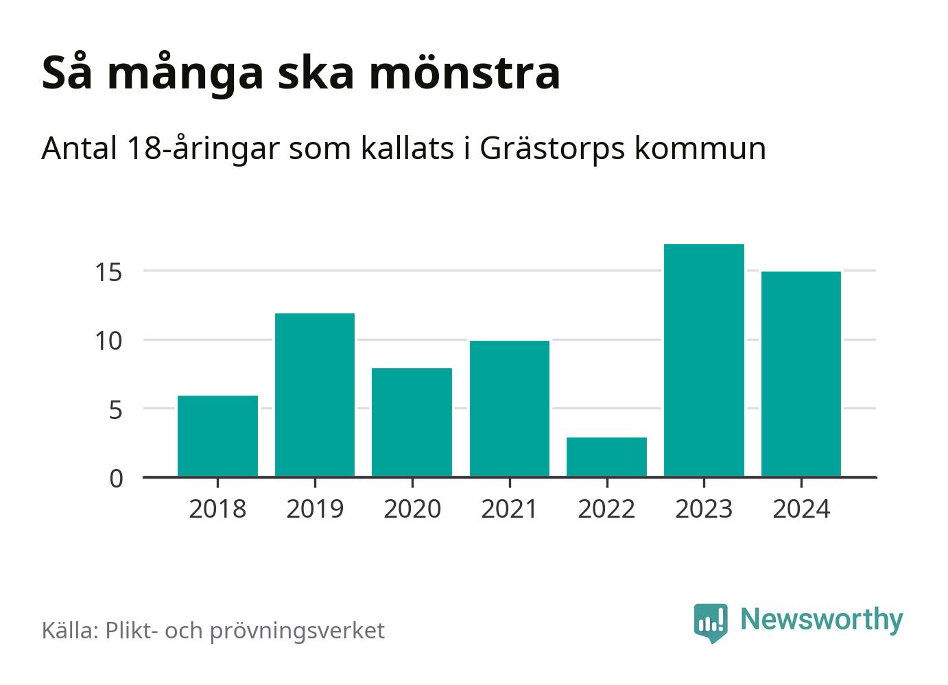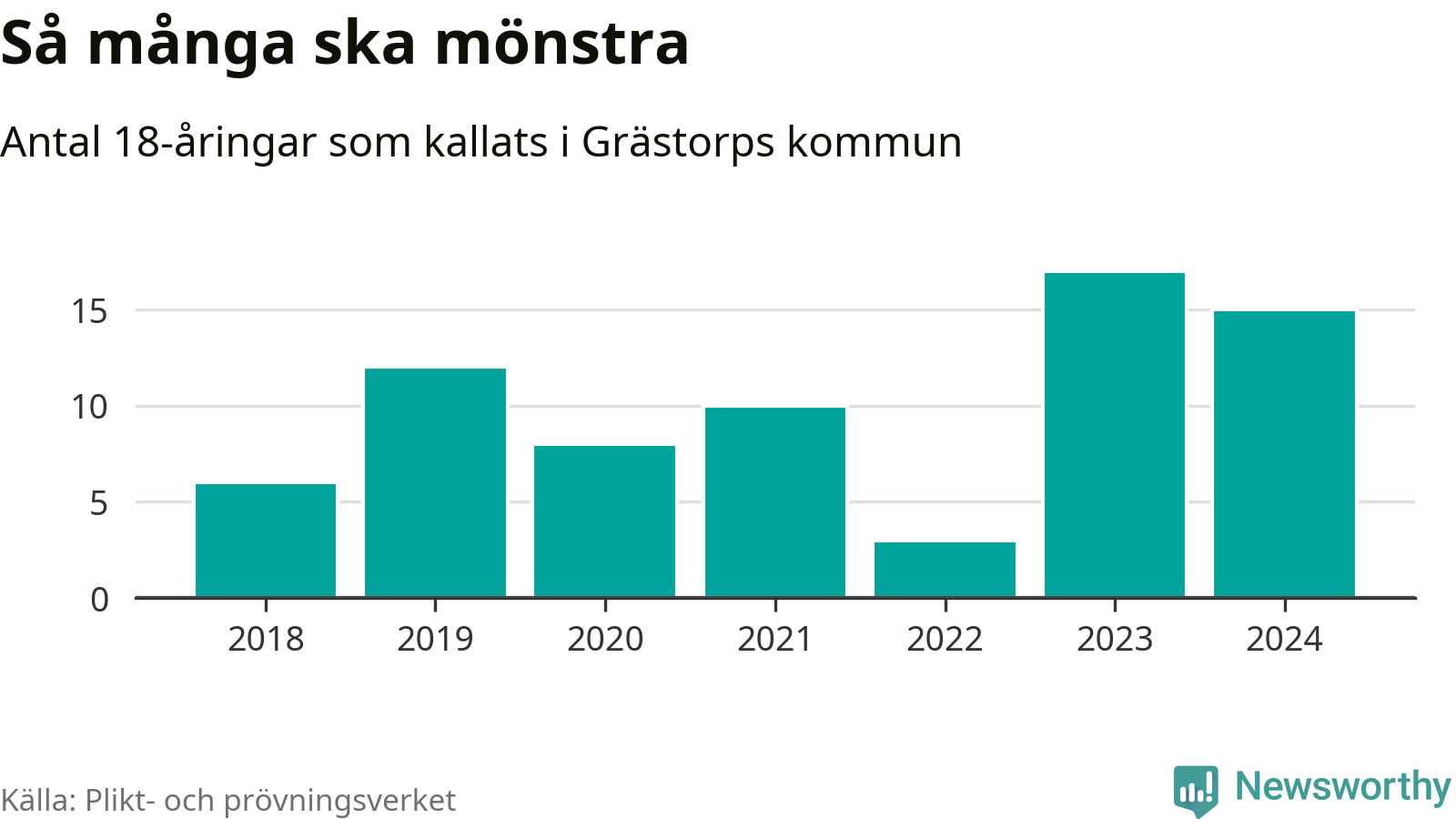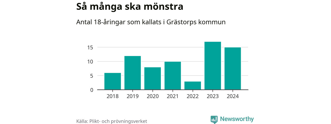 15 personer är två färre än 2023. 2018 kallades som jämförelse sex 18-åringar från Grästorp till mönstring. Det motsvarade ungefär 11 procent av årskullen född år 2000. Totalt från Västra Götalands län kallas 4 562 personer födda 2006 i år.