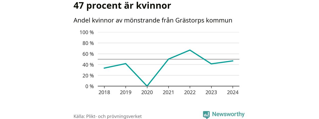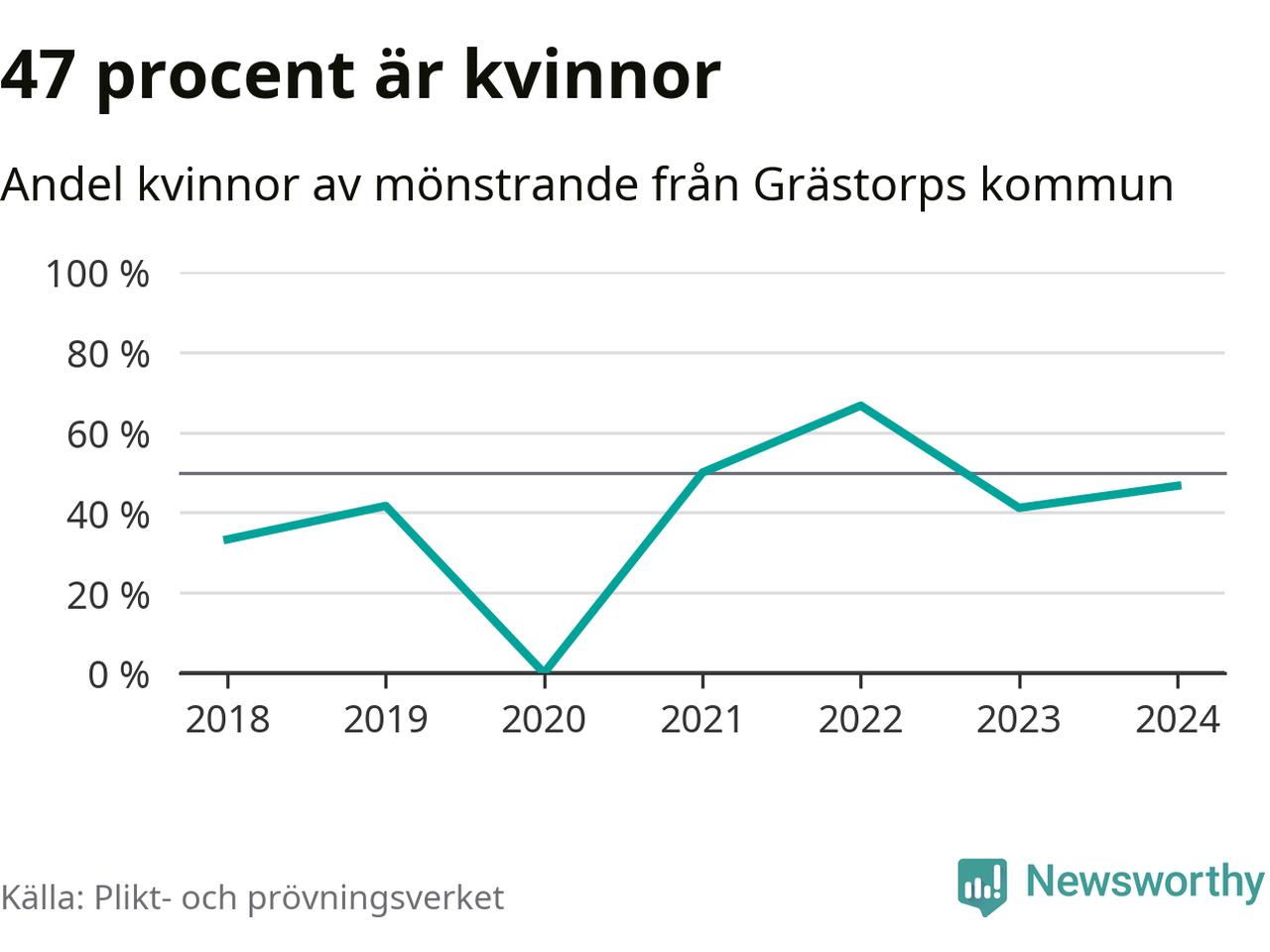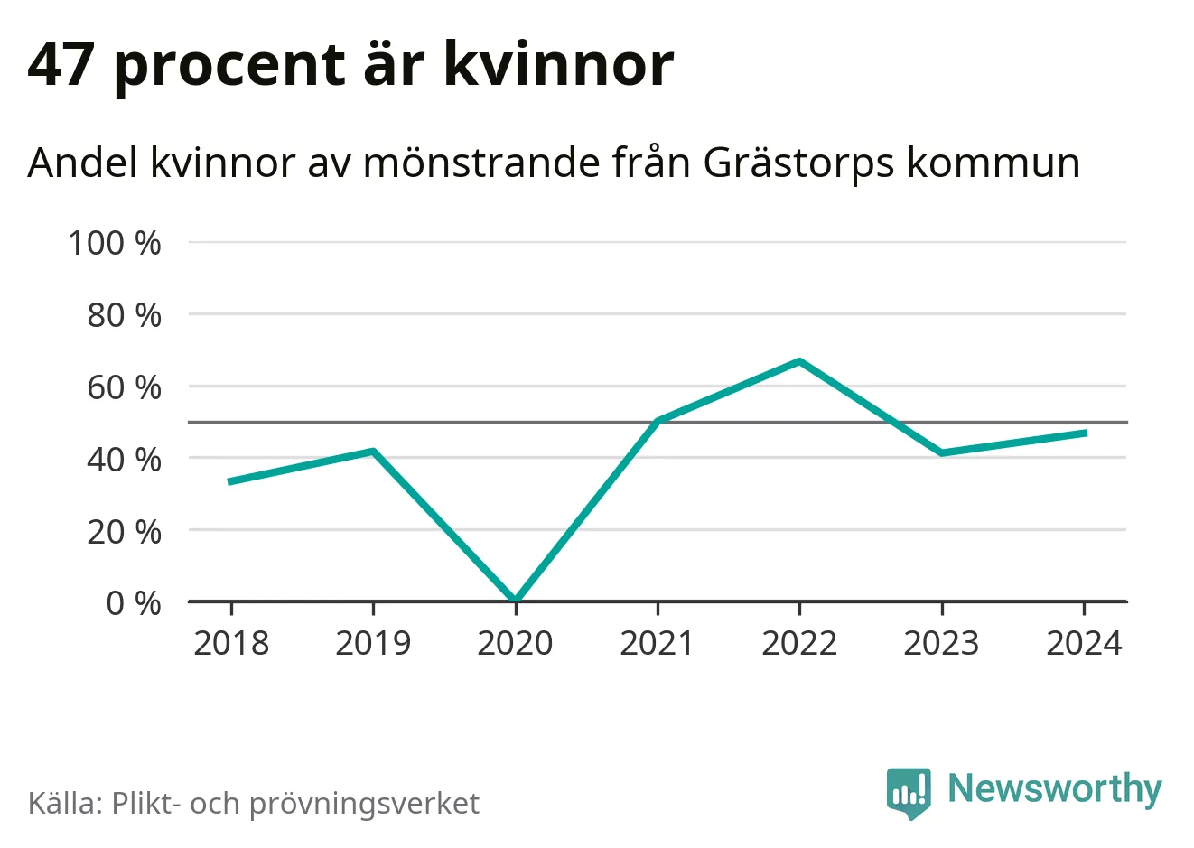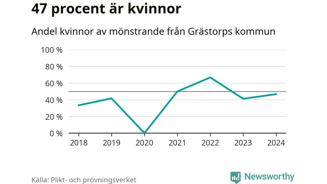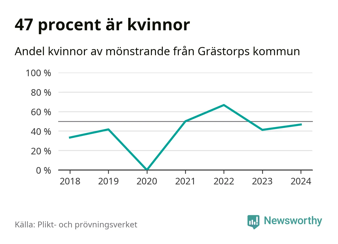 Sju av de som kallats till mönstring från Grästorp är kvinnor, vilket motsvarar 47 procent av de mönstrande. I absoluta tal är det fler kvinnor än något år sedan värnplikten återinfördes, men 2022 var en större andel av de mönstrande från kommunen kvinnor (67 procent). I riket som helhet är 30 procent av de mönstrande tjejer.
