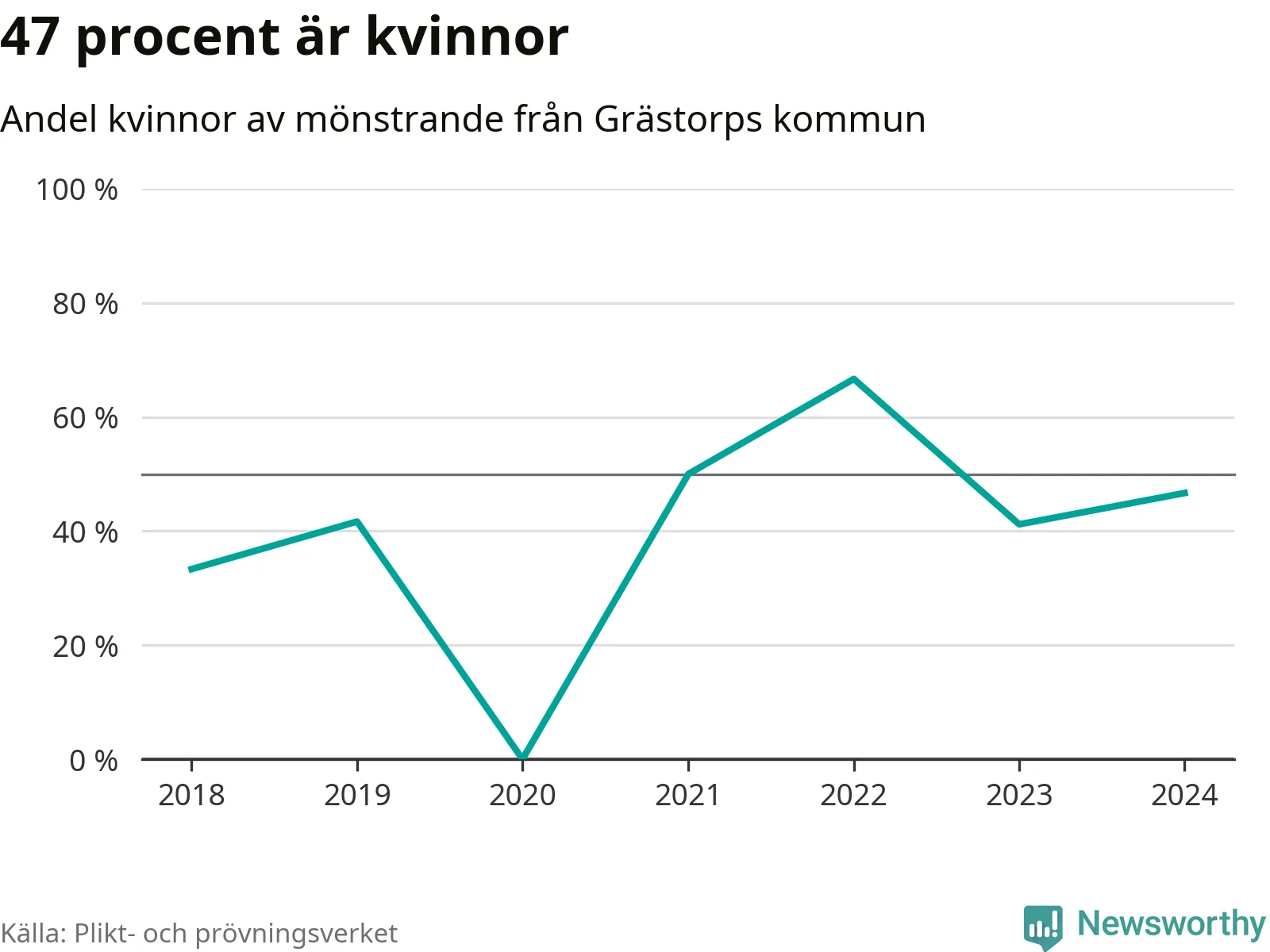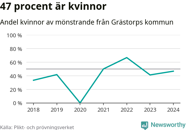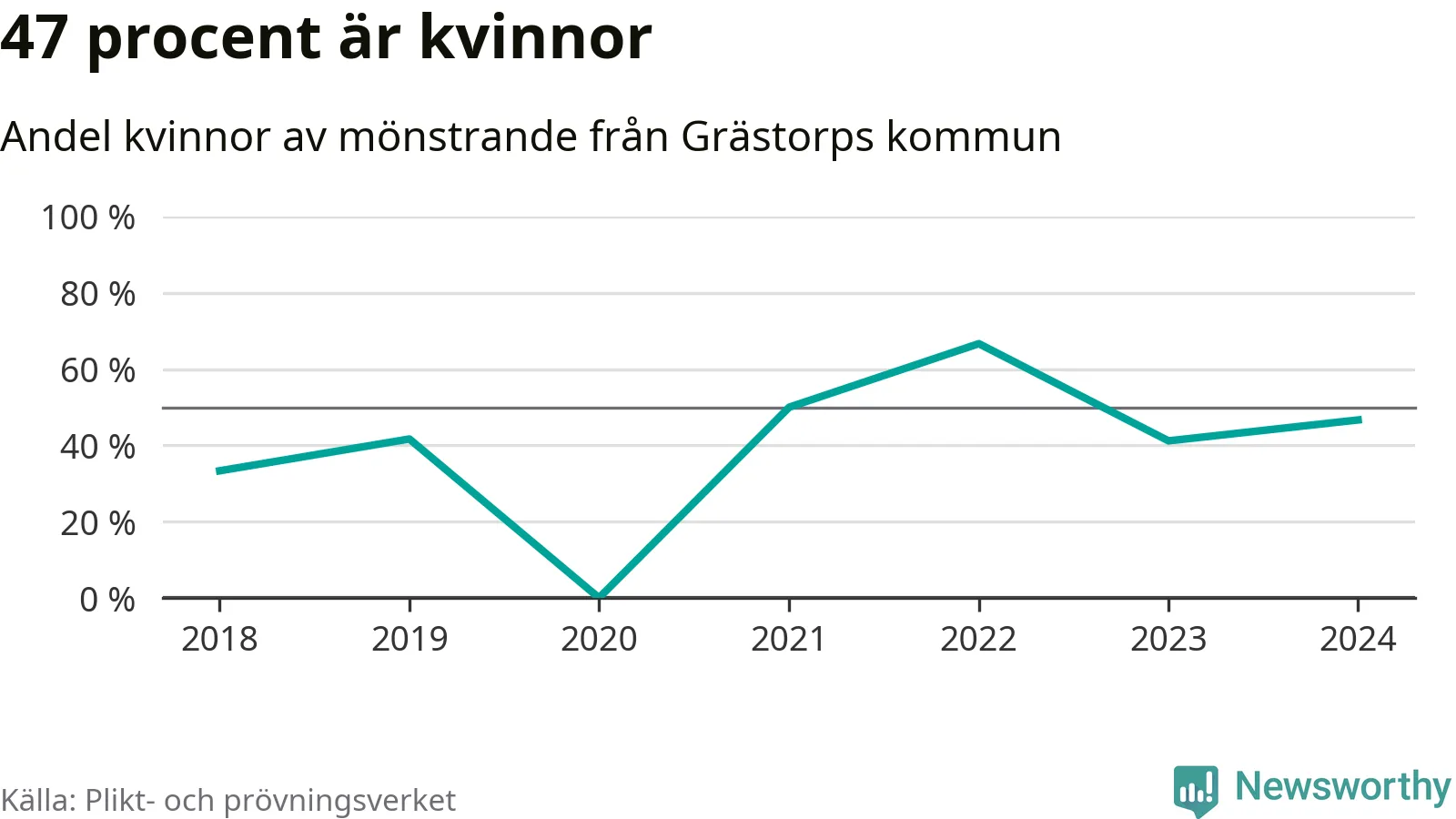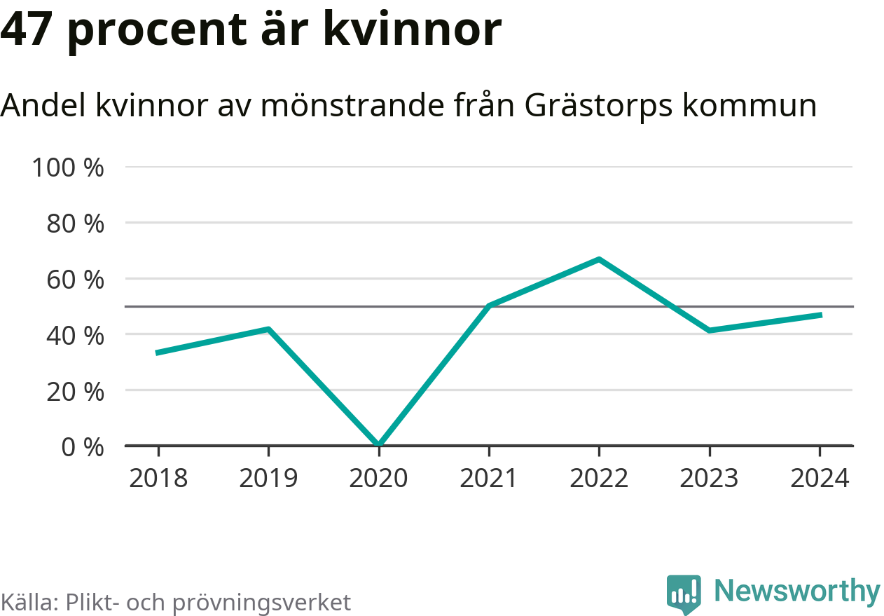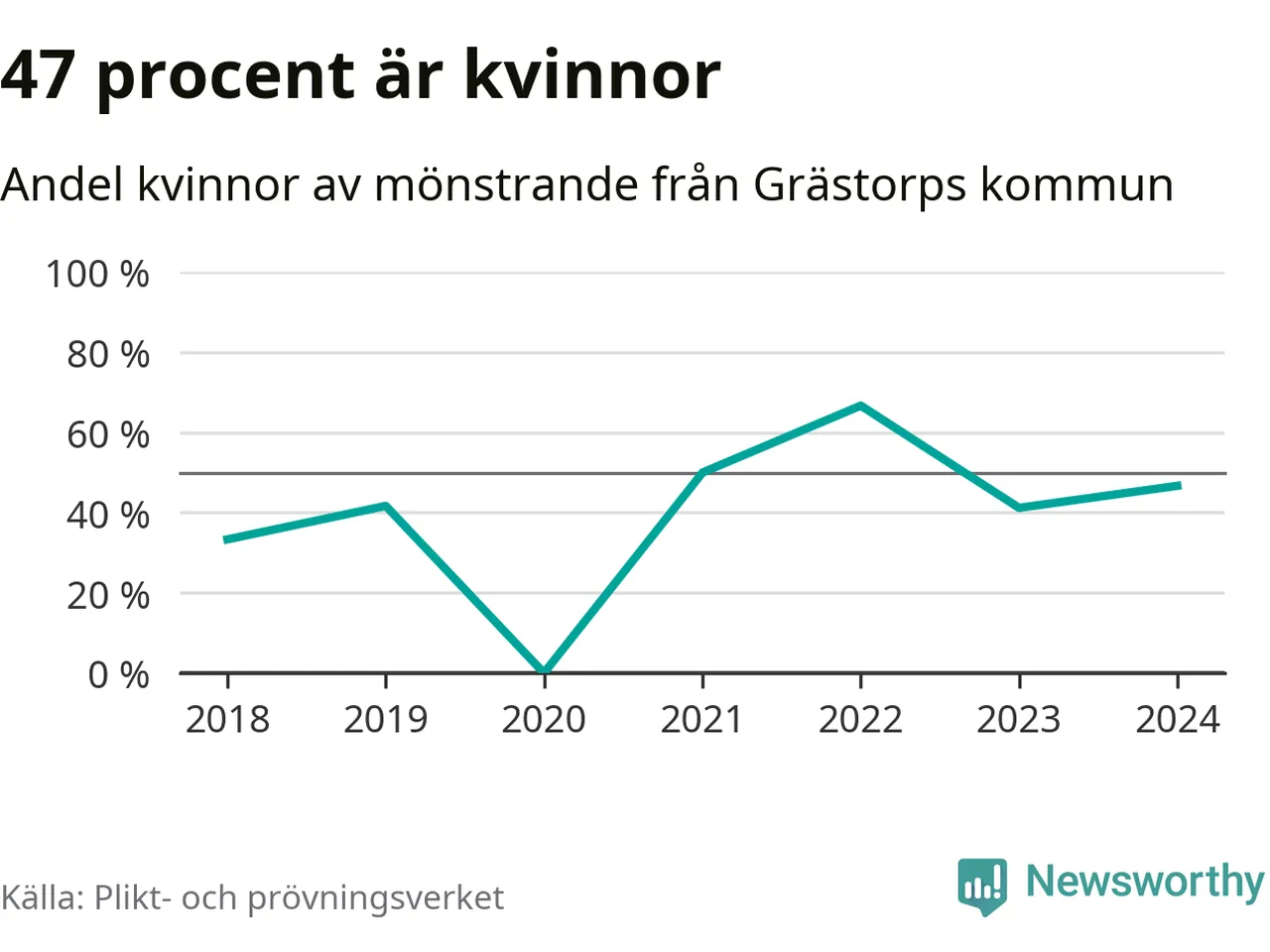 Sju av de som kallats till mönstring från Grästorp är kvinnor, vilket motsvarar 47 procent av de mönstrande. I absoluta tal är det fler kvinnor än något år sedan värnplikten återinfördes, men 2022 var en större andel av de mönstrande från kommunen kvinnor (67 procent). I riket som helhet är 30 procent av de mönstrande tjejer.