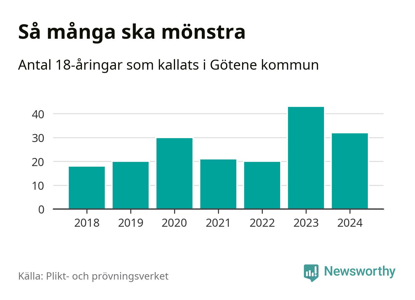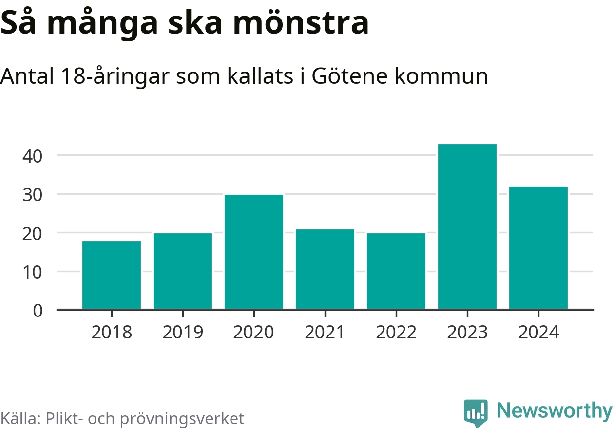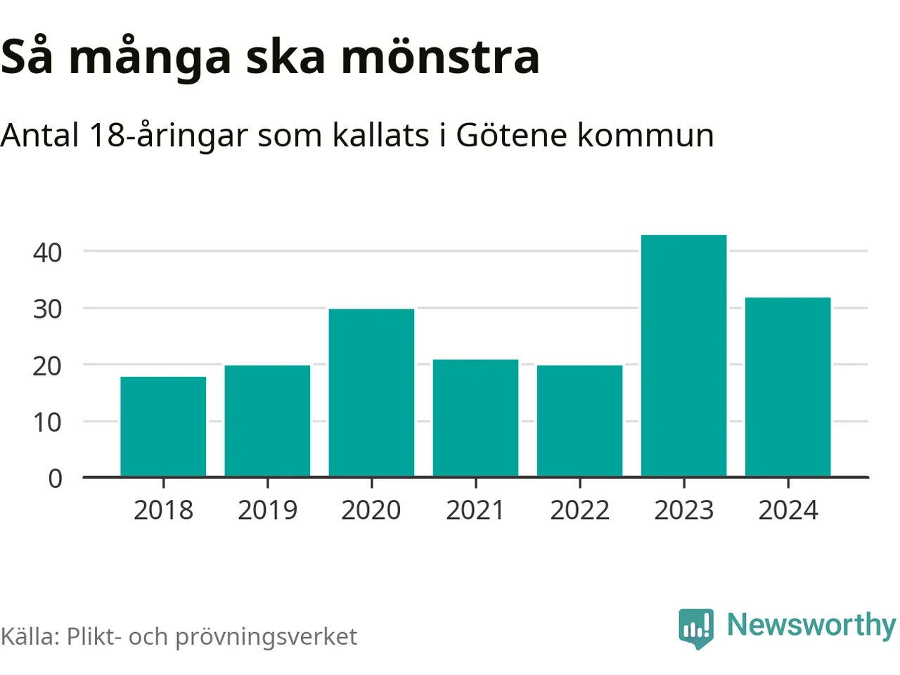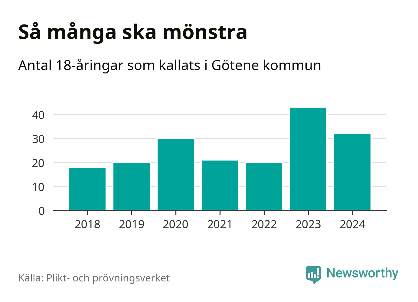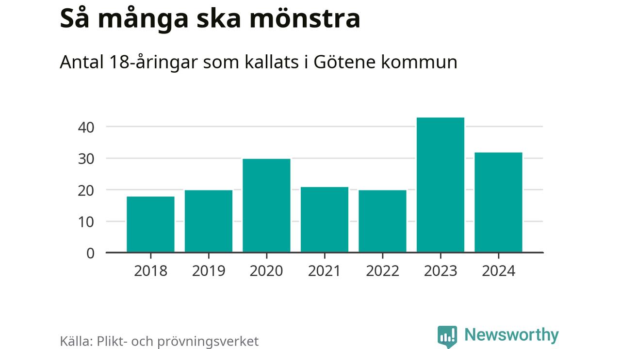 32 personer är elva färre än 2023. 2018 kallades som jämförelse 18 artonåringar från Götene till mönstring. Det motsvarade ungefär 12 procent av årskullen född år 2000. Totalt från Västra Götalands län kallas 4 562 personer födda 2006 i år.