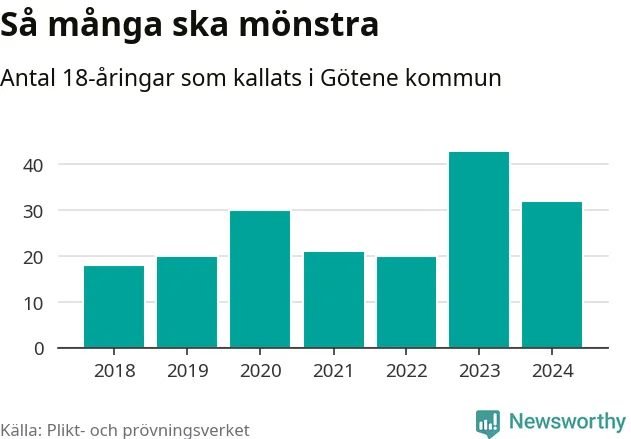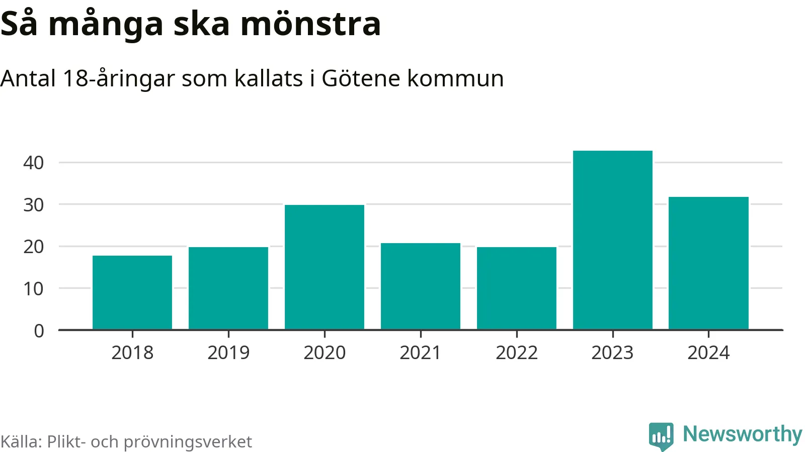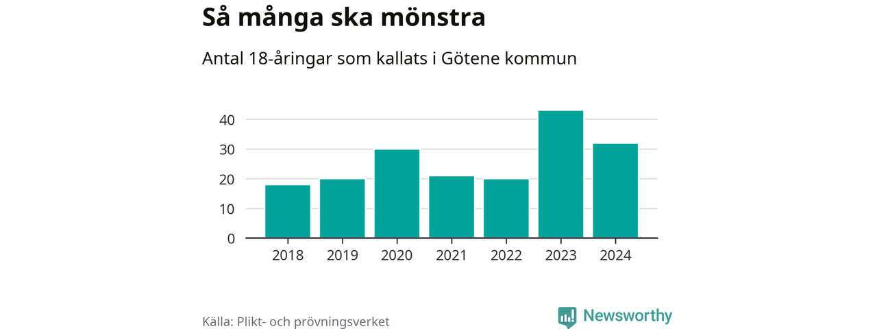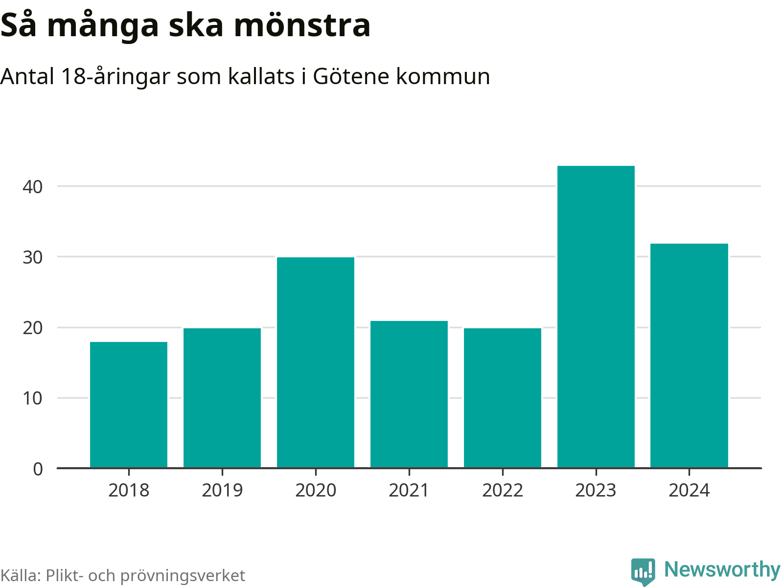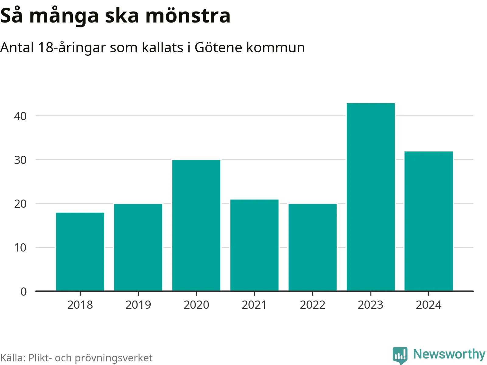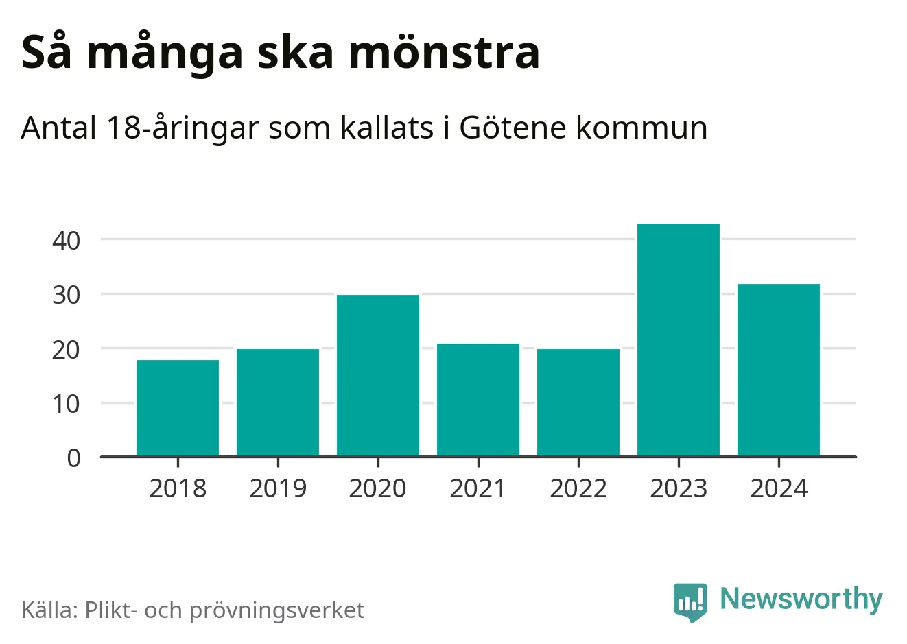 32 personer är elva färre än 2023. 2018 kallades som jämförelse 18 artonåringar från Götene till mönstring. Det motsvarade ungefär 12 procent av årskullen född år 2000. Totalt från Västra Götalands län kallas 4 562 personer födda 2006 i år.