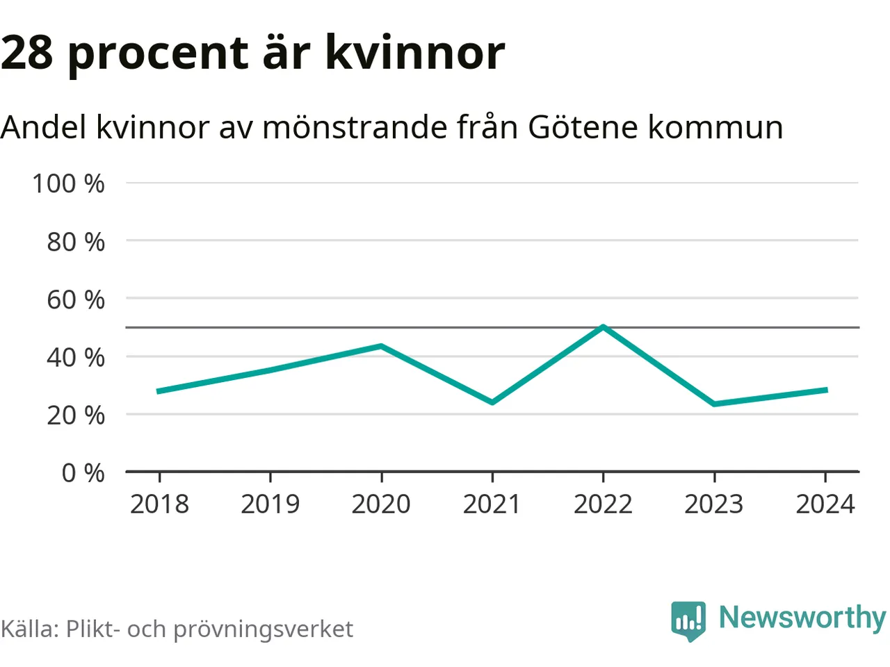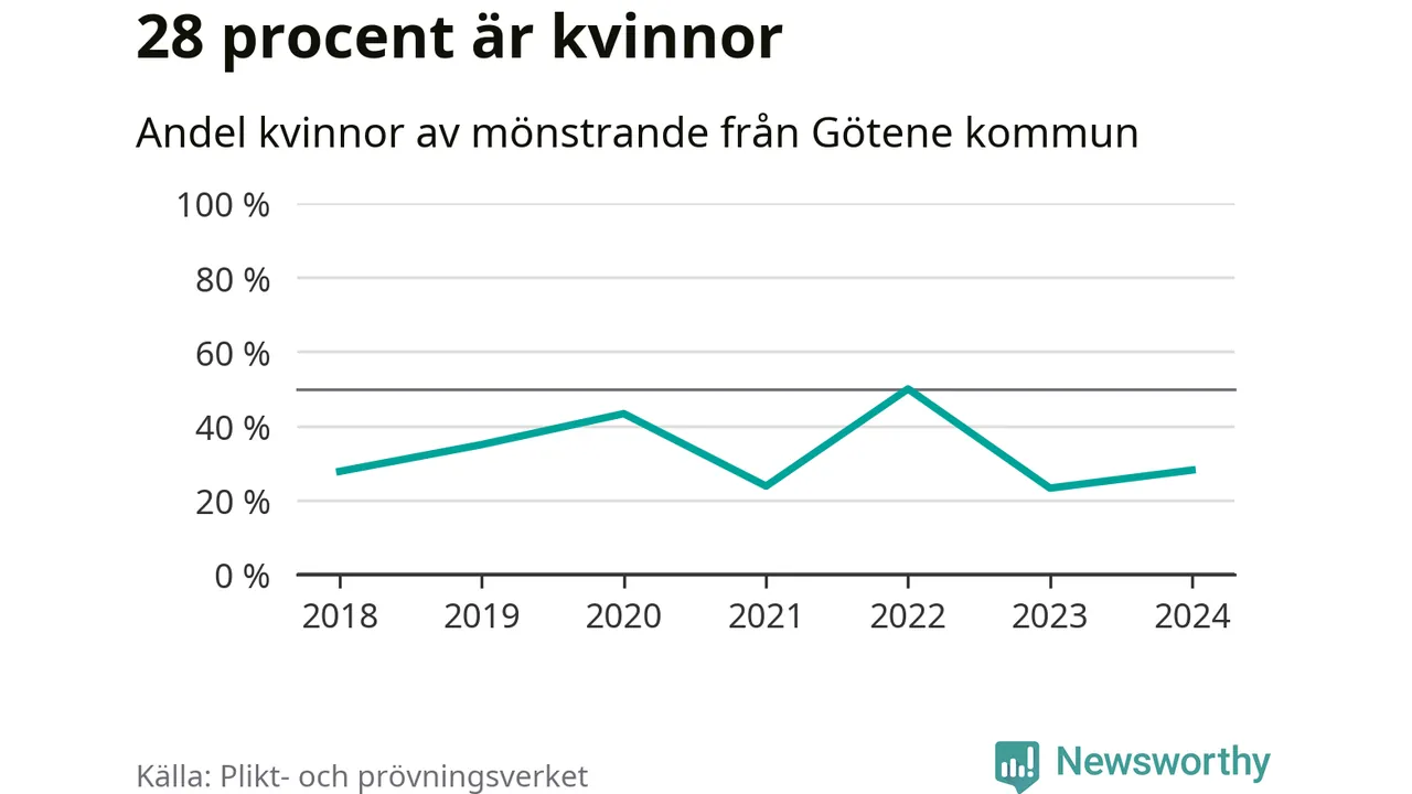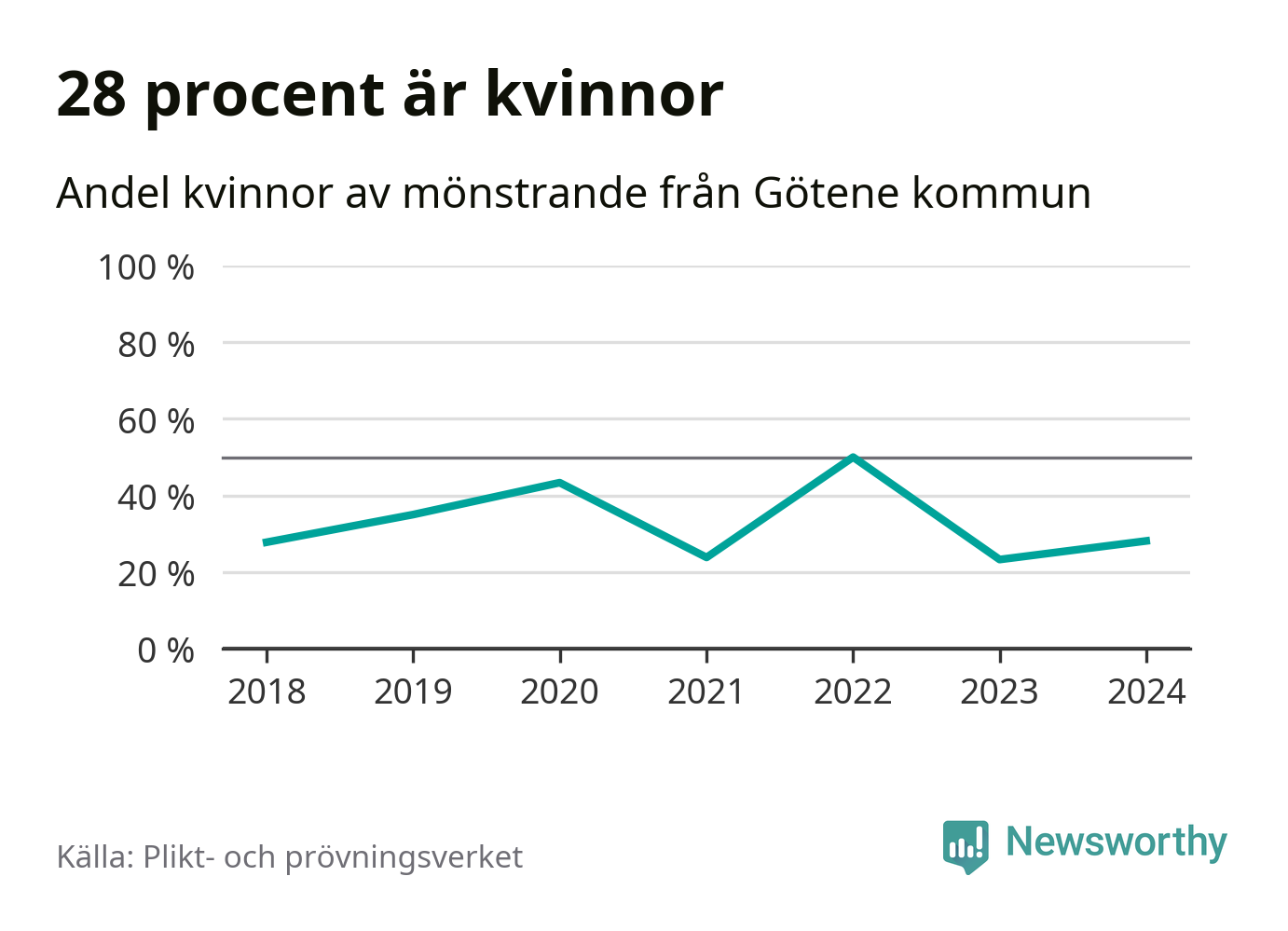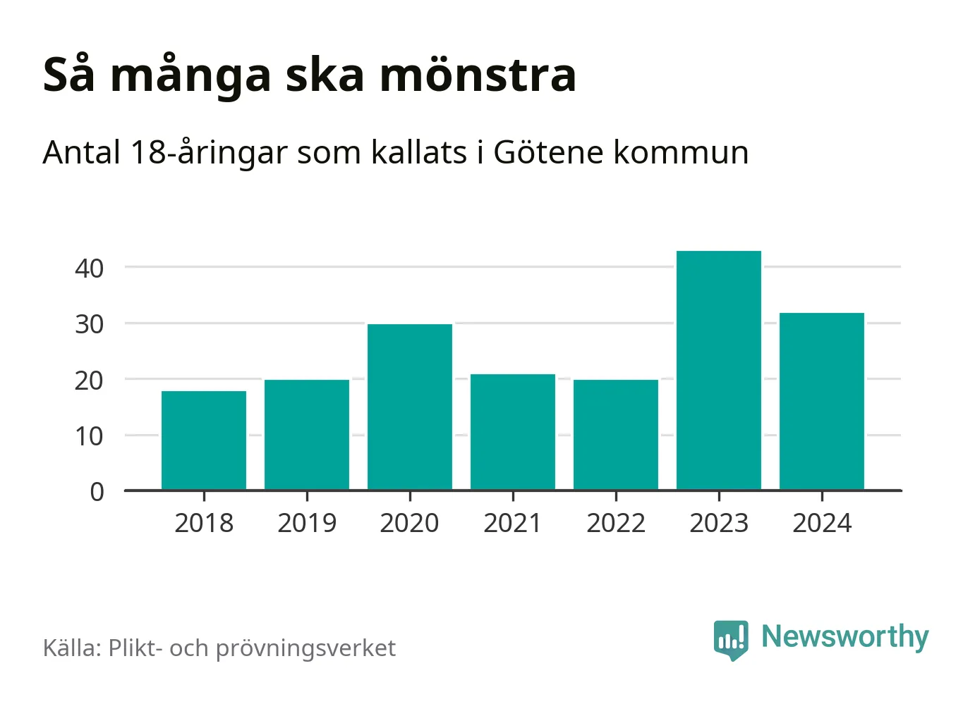 Nu kallas 27 900 svenskar födda 2006 till mönstring. Och 32 av dem kommer från Götene, enligt ny statistik från Plikt- och prövningsverket. Det innebär att nästan var fjärde invånare i åldersgruppen i kommunen kallas till mönstring. Det är ungefär lika stor andel som i Västra Götaland totalt. Även i riket som helhet kallas nästan var fjärde person i årskullen.