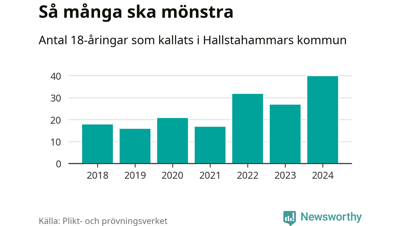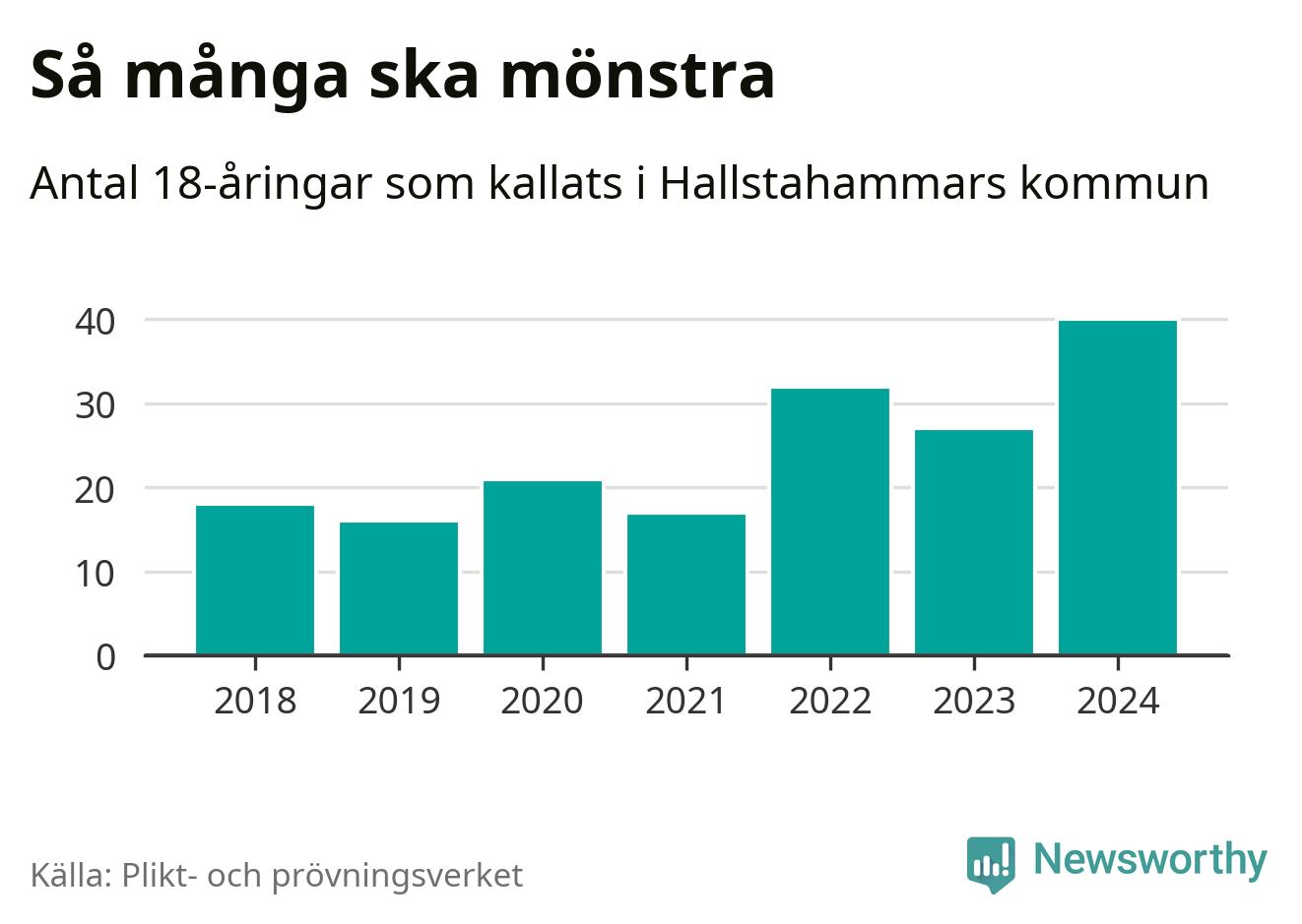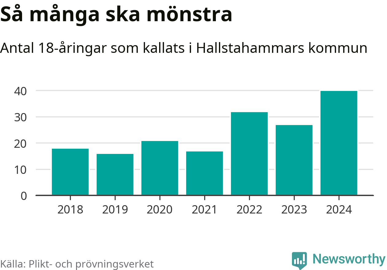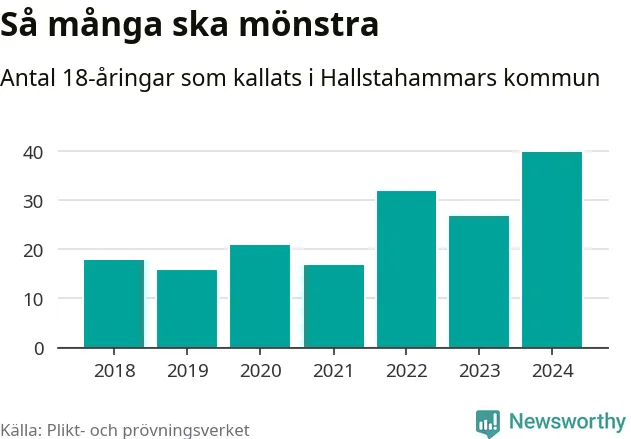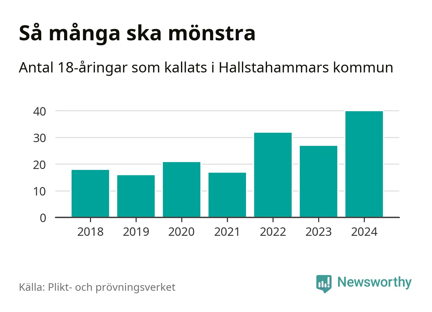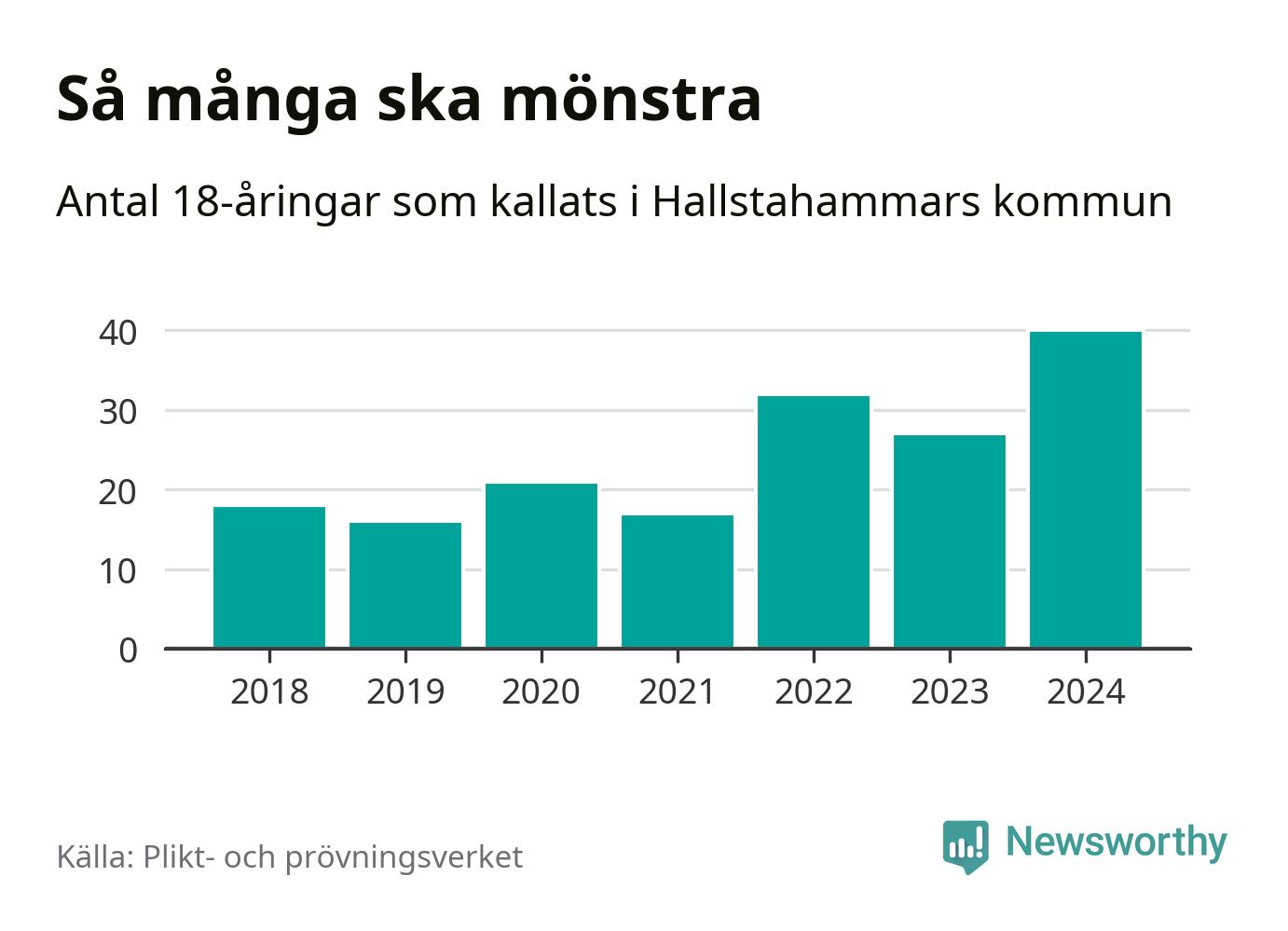 40 personer är det högsta antalet kallade i Hallstahammar sedan 2018, som är första året med statistik på kommunnivå (värnplikten återinfördes 2017), och 13 mönstrande mer än 2023. 2018 kallades som jämförelse 18 artonåringar från Hallstahammar till mönstring. Det motsvarade ungefär 10 procent av årskullen född år 2000. Totalt från Västmanlands län kallas 717 personer födda 2006 i år.