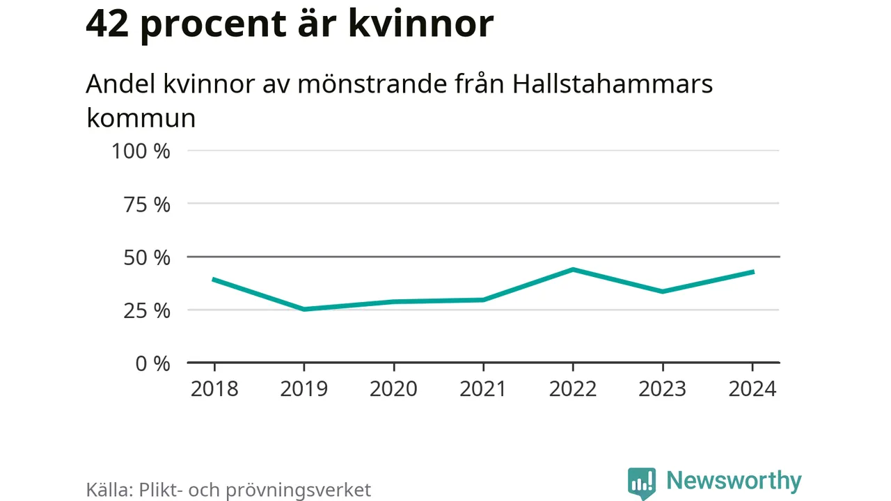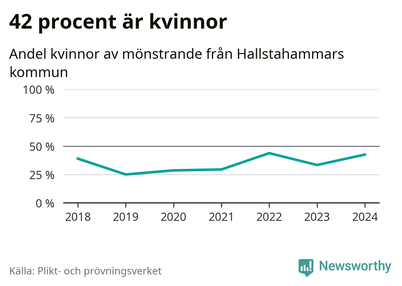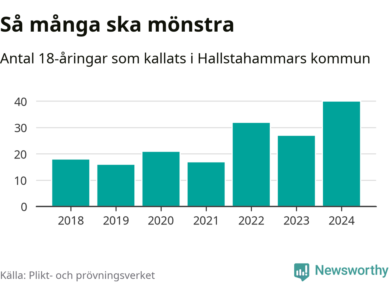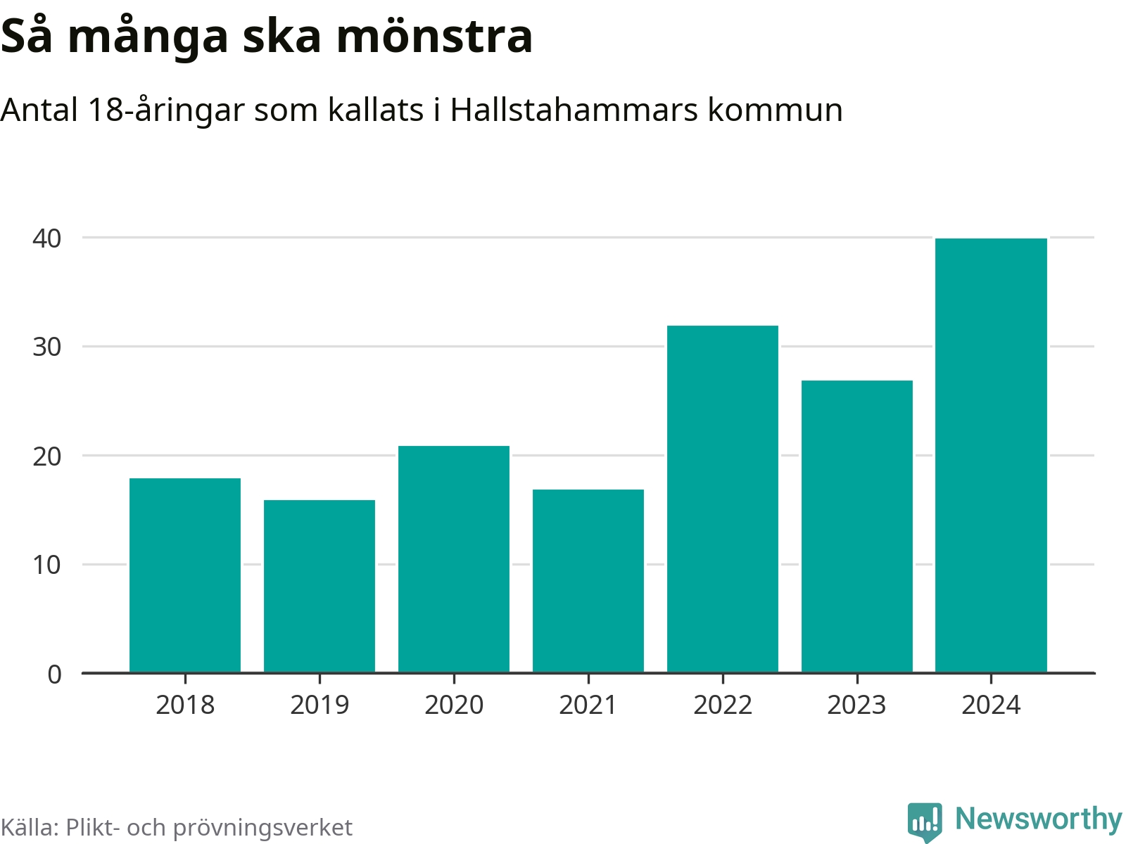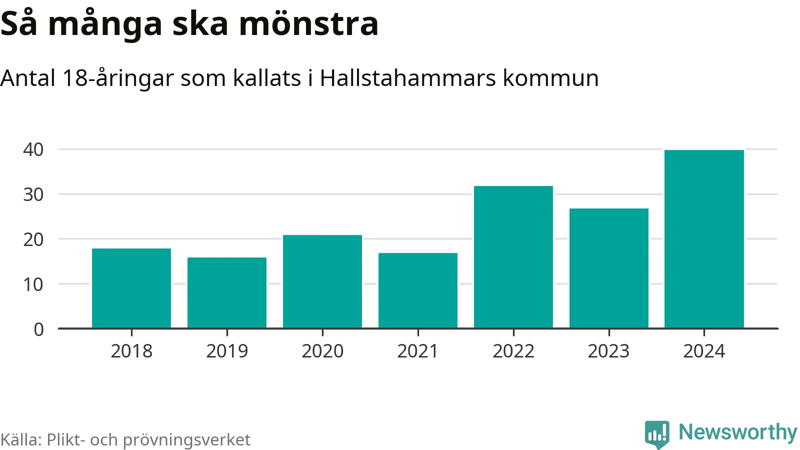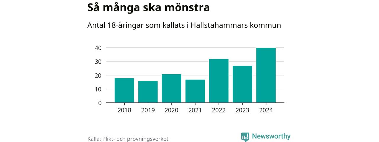 40 personer är det högsta antalet kallade i Hallstahammar sedan 2018, som är första året med statistik på kommunnivå (värnplikten återinfördes 2017), och 13 mönstrande mer än 2023. 2018 kallades som jämförelse 18 artonåringar från Hallstahammar till mönstring. Det motsvarade ungefär 10 procent av årskullen född år 2000. Totalt från Västmanlands län kallas 717 personer födda 2006 i år.
