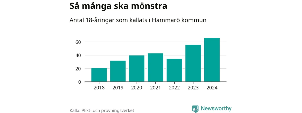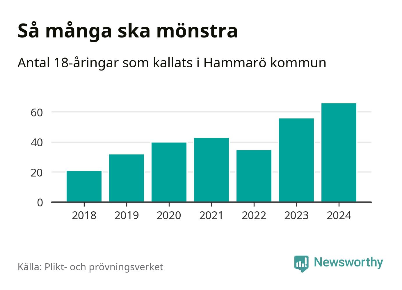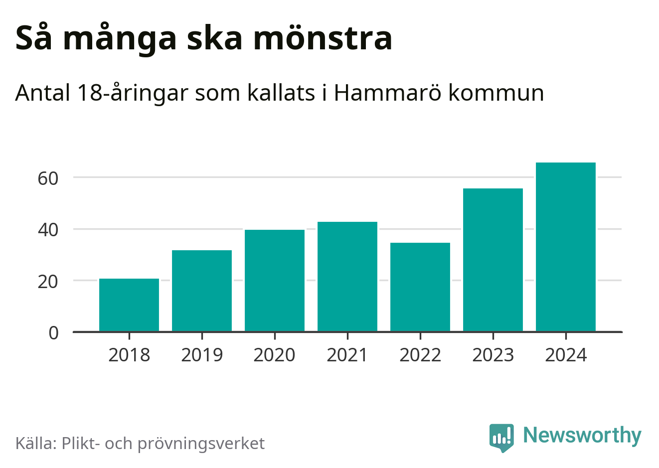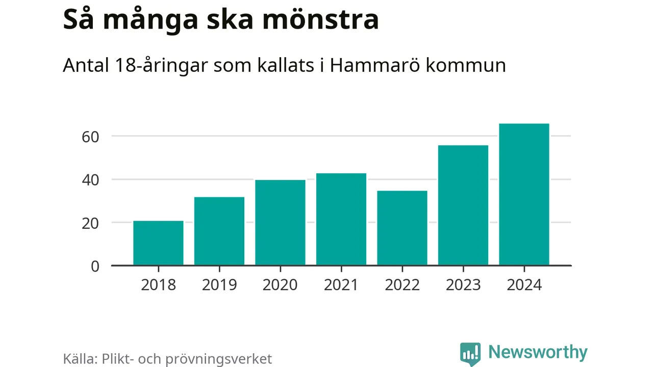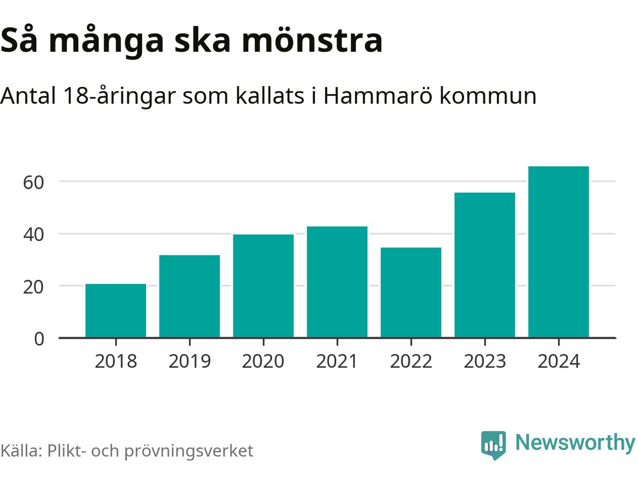 66 personer är det högsta antalet kallade på Hammarö sedan 2018, som är första året med statistik på kommunnivå (värnplikten återinfördes 2017), och tio mönstrande mer än 2023. 2018 kallades som jämförelse 21 artonåringar från Hammarö till mönstring. Det motsvarade ungefär 10 procent av årskullen född år 2000. Totalt från Värmlands län kallas 705 personer födda 2006 i år.