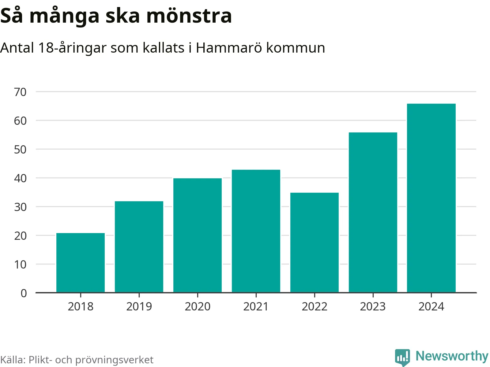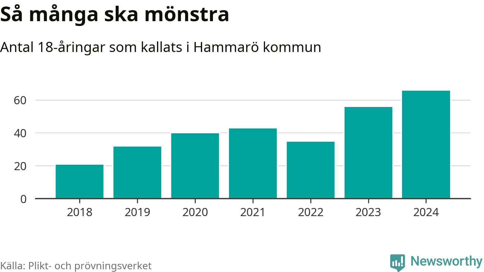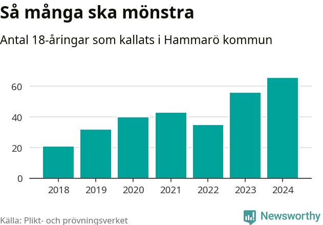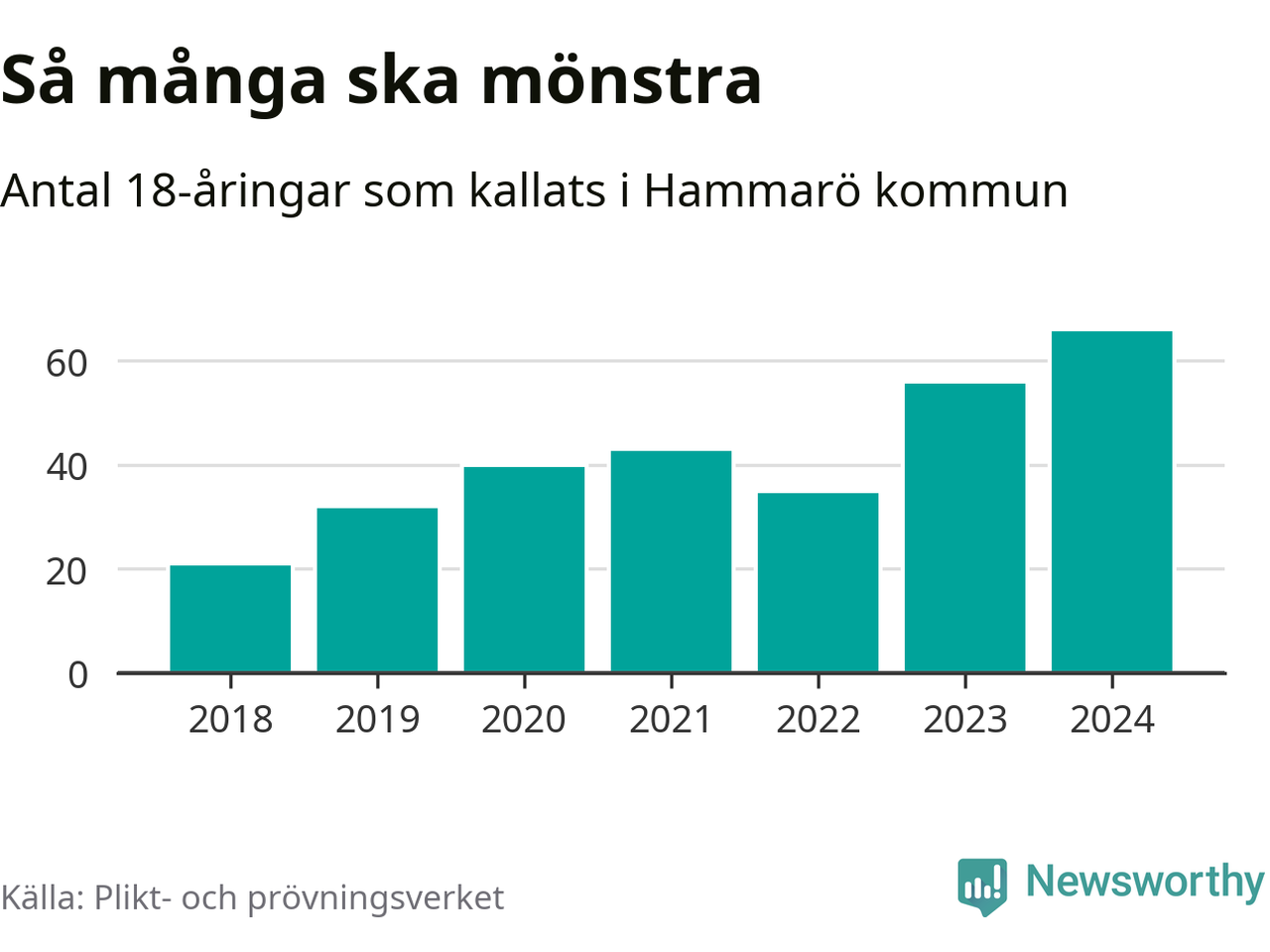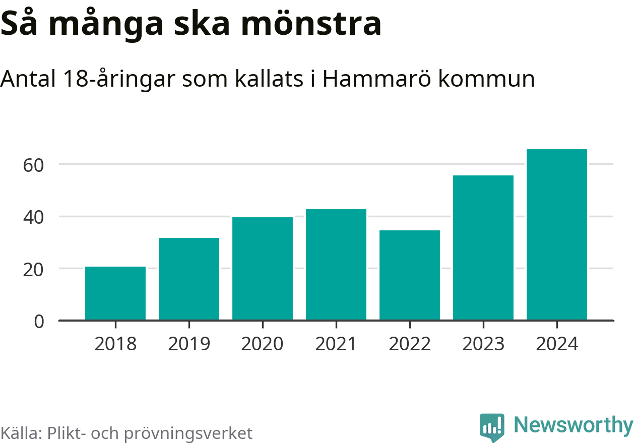 66 personer är det högsta antalet kallade på Hammarö sedan 2018, som är första året med statistik på kommunnivå (värnplikten återinfördes 2017), och tio mönstrande mer än 2023. 2018 kallades som jämförelse 21 artonåringar från Hammarö till mönstring. Det motsvarade ungefär 10 procent av årskullen född år 2000. Totalt från Värmlands län kallas 705 personer födda 2006 i år.