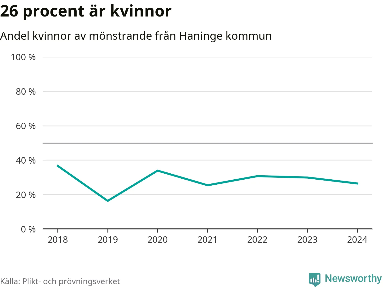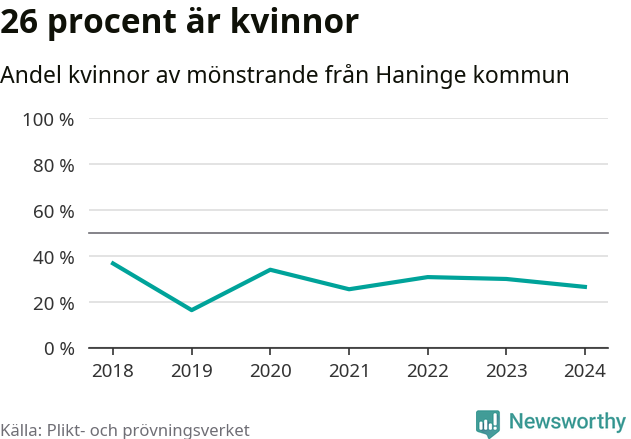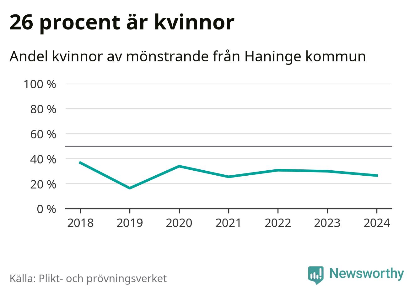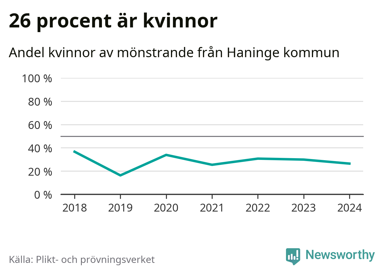 61 av de som kallats till mönstring från Haninge är kvinnor, vilket motsvarar 26 procent av de mönstrande. Som mest har 63 kvinnor kallats från kommunen (2023). I riket som helhet är 30 procent av de mönstrande tjejer.