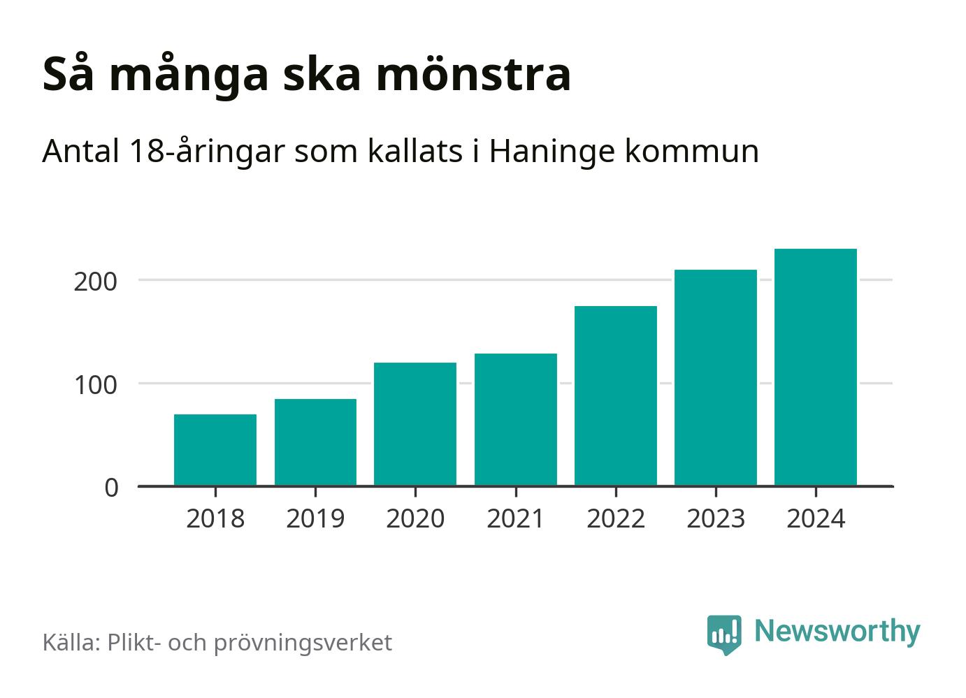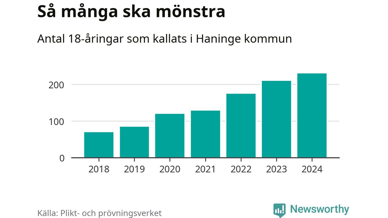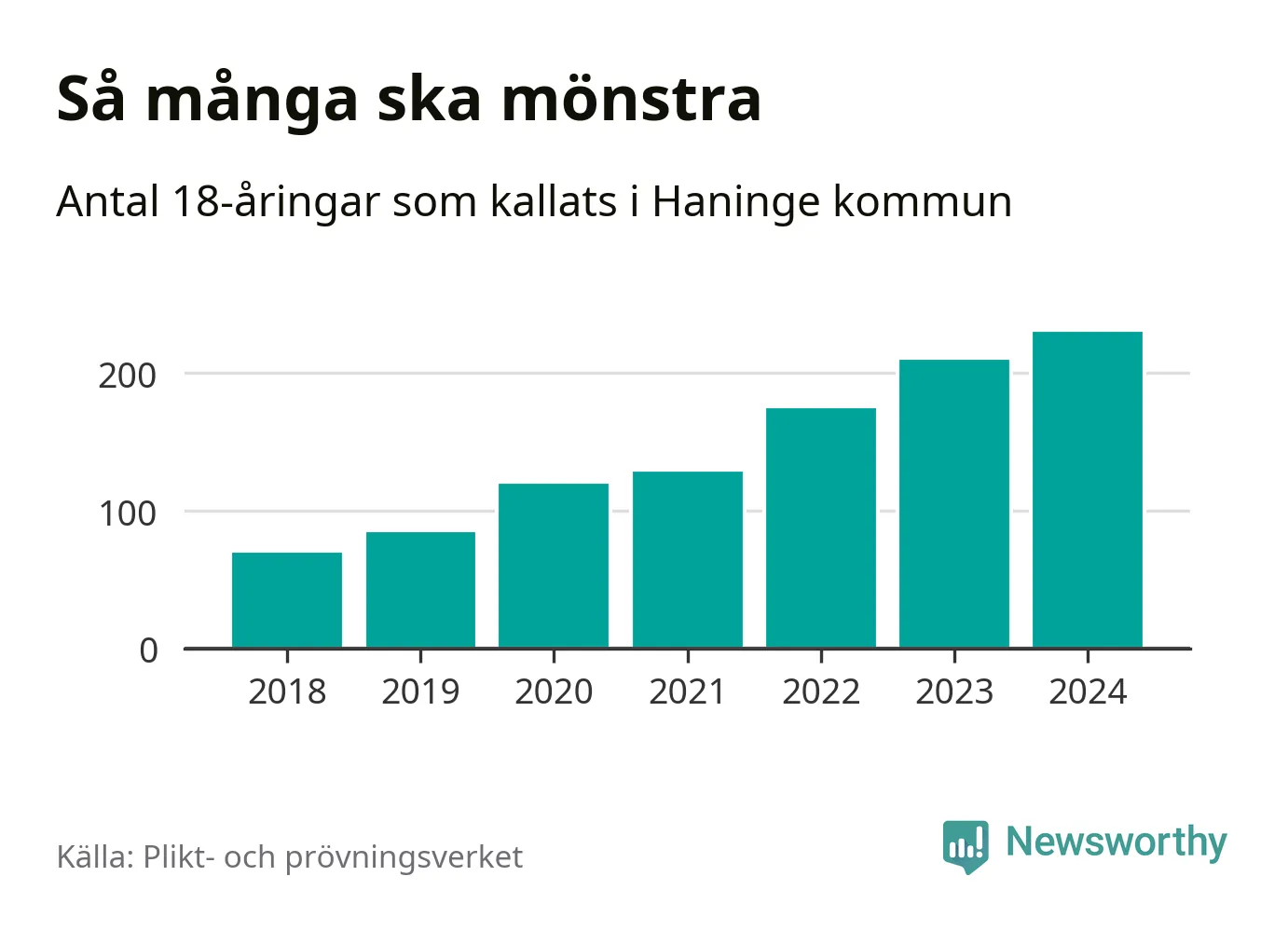 Antalet kallade i Haninge har ökat varje år sedan 2018, som är första året med statistik på kommunnivå (värnplikten återinfördes 2017), och jämfört med 2023 är det 20 fler i år. 2018 kallades som jämförelse 71 artonåringar från Haninge till mönstring. Det motsvarade ungefär 7 procent av årskullen född år 2000. Totalt från Stockholms län kallas 6 488 personer födda 2006 i år.
