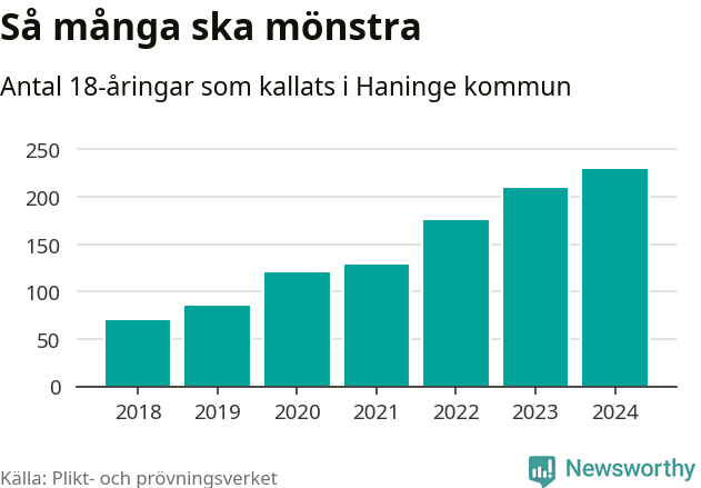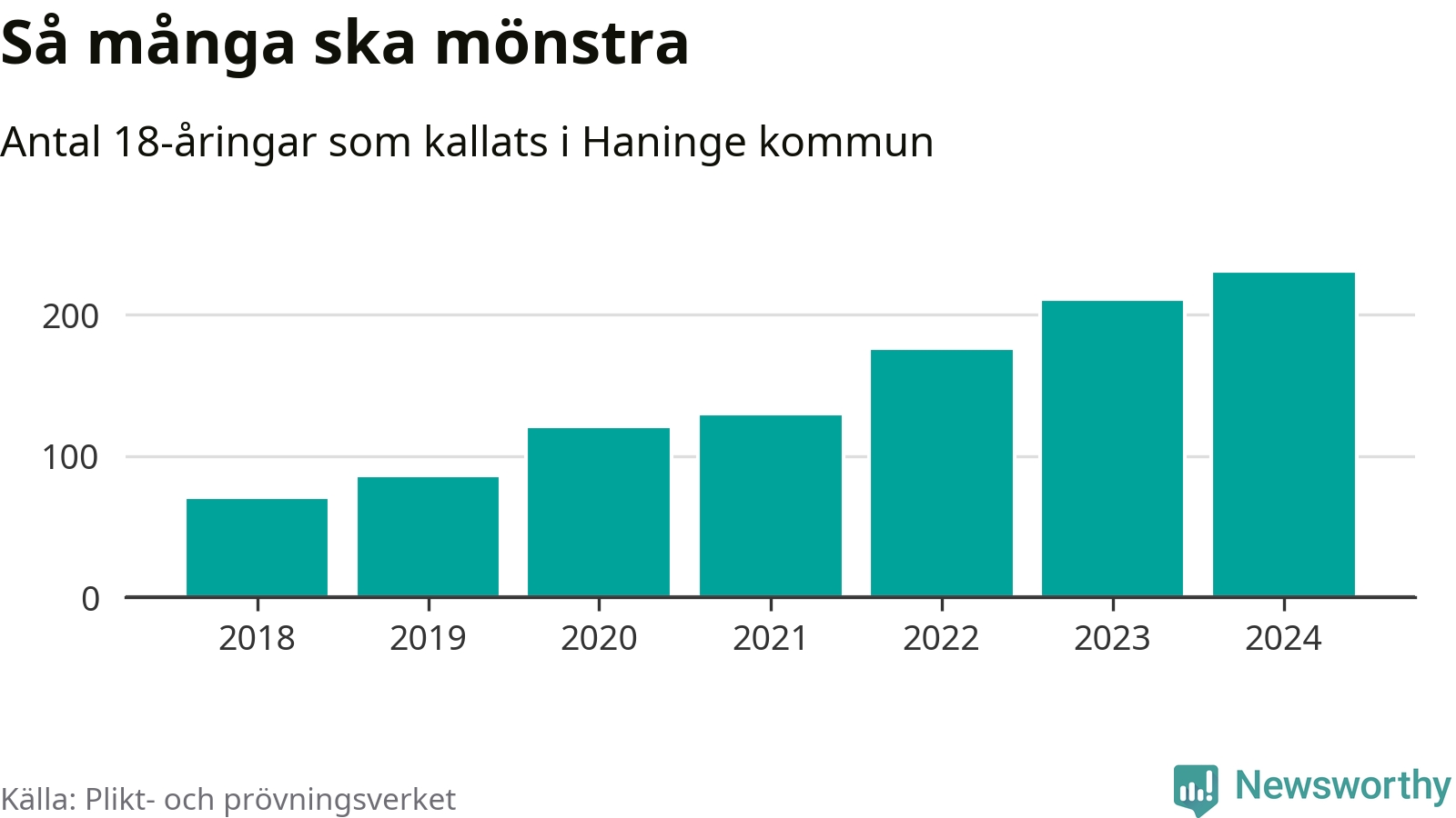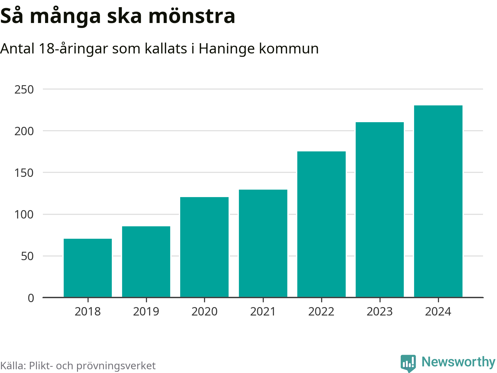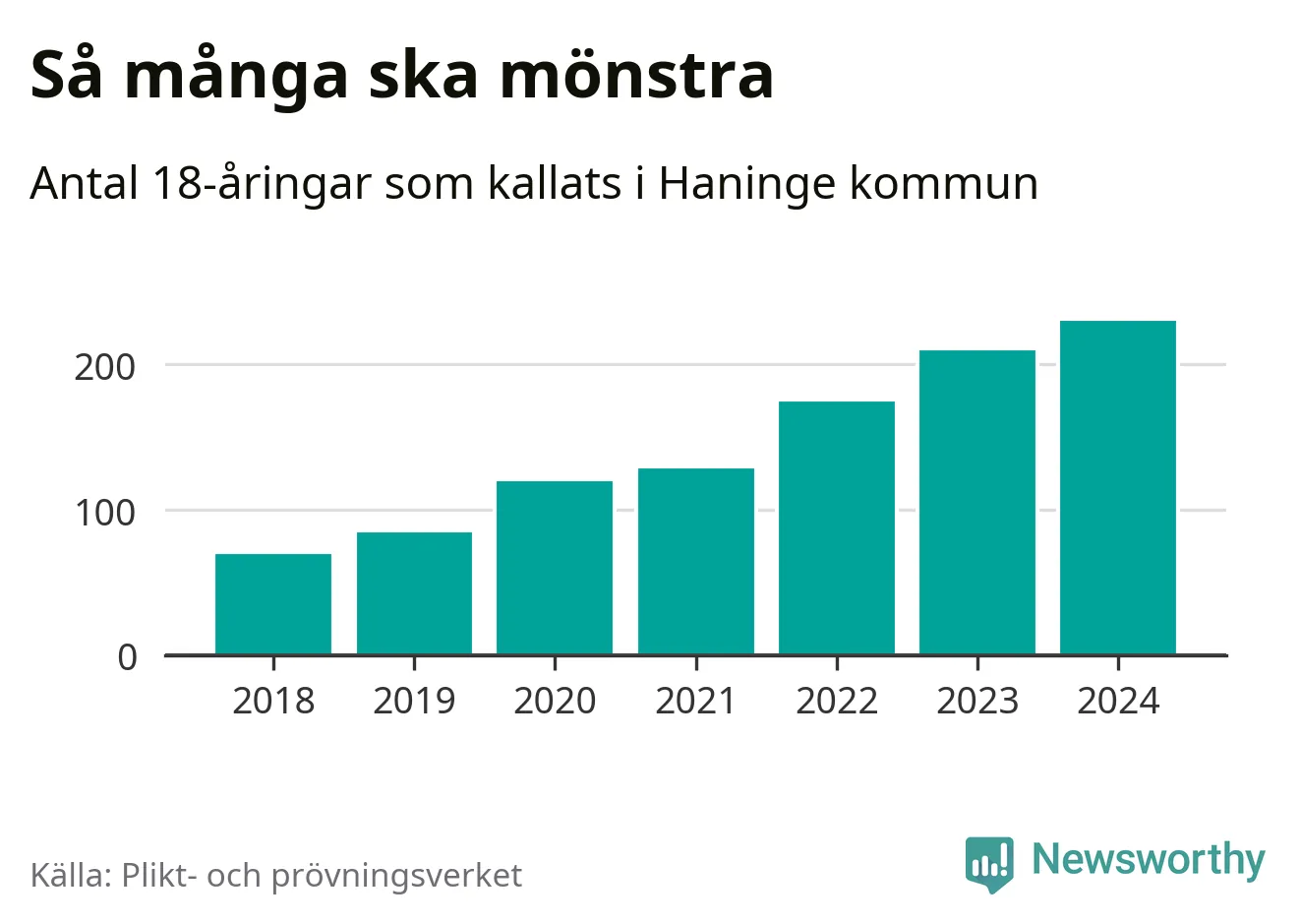 Antalet kallade i Haninge har ökat varje år sedan 2018, som är första året med statistik på kommunnivå (värnplikten återinfördes 2017), och jämfört med 2023 är det 20 fler i år. 2018 kallades som jämförelse 71 artonåringar från Haninge till mönstring. Det motsvarade ungefär 7 procent av årskullen född år 2000. Totalt från Stockholms län kallas 6 488 personer födda 2006 i år.