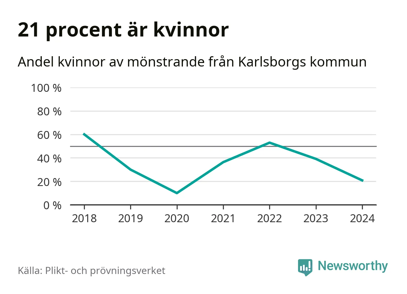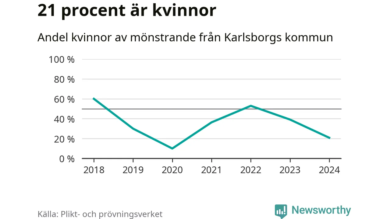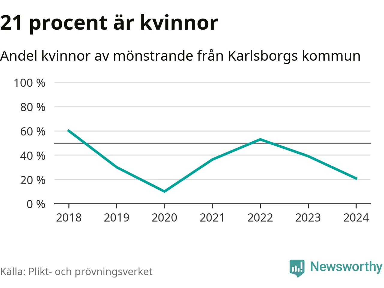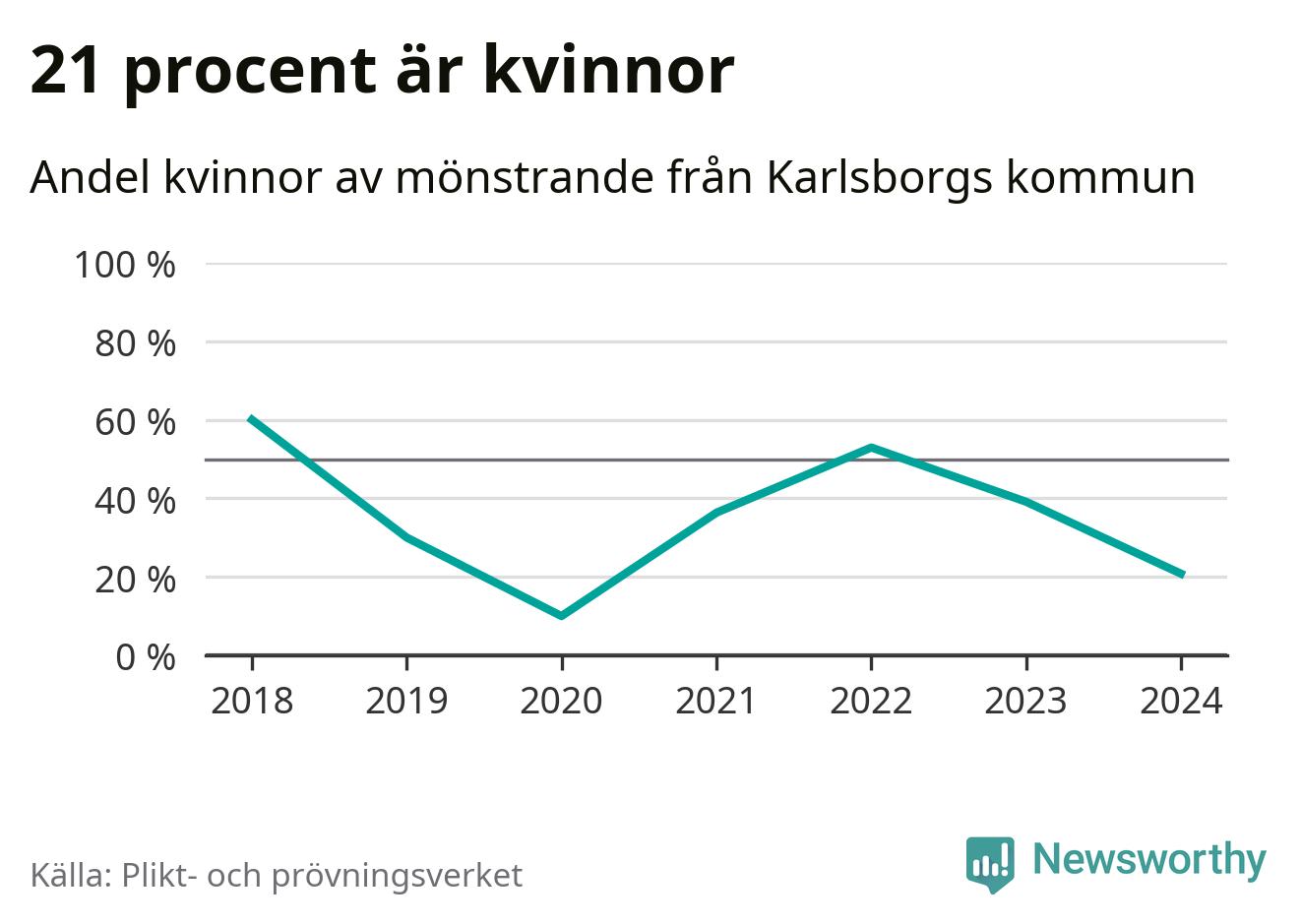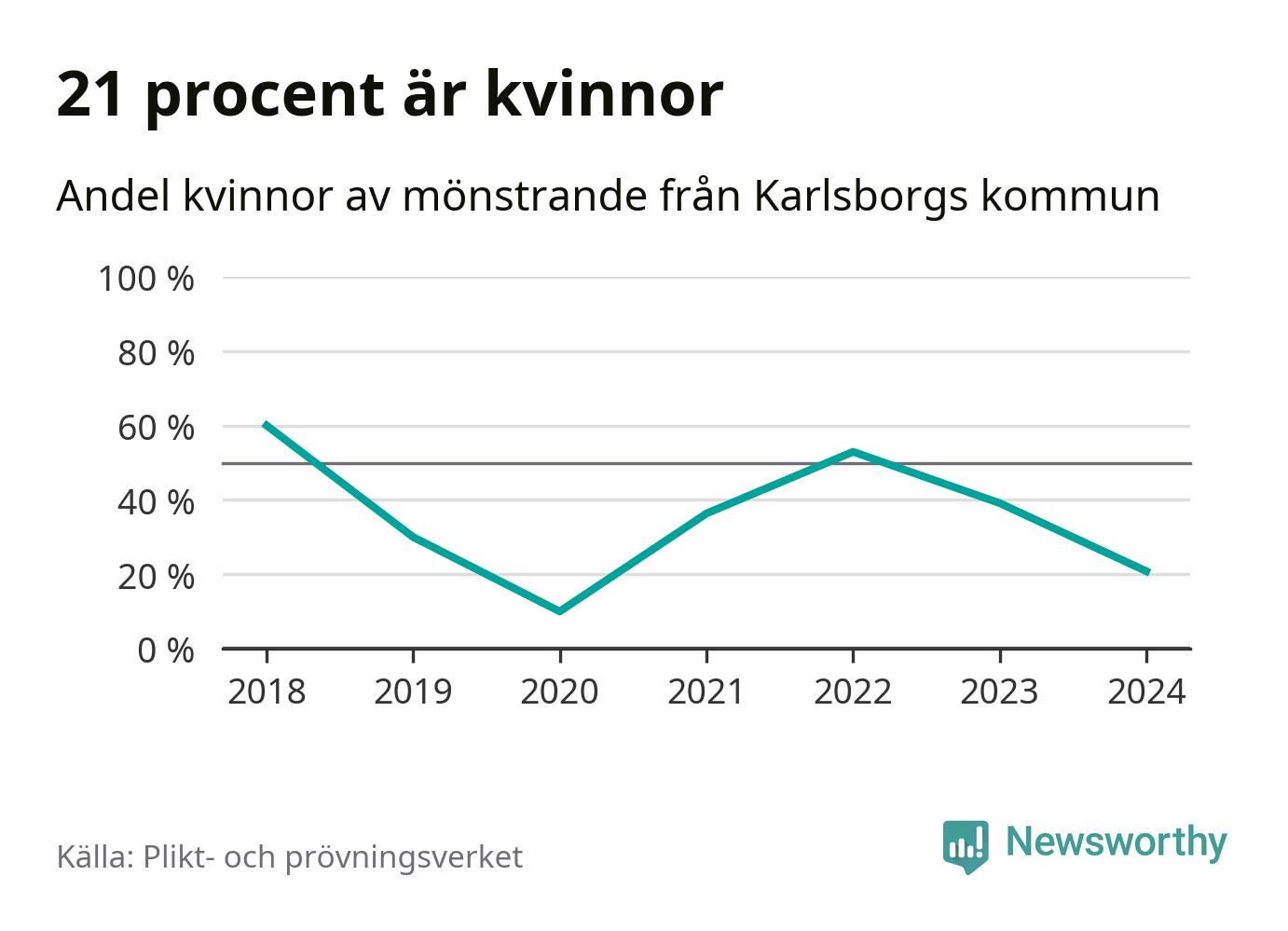 Fem av de som kallats till mönstring från Karlsborg är kvinnor, vilket motsvarar 21 procent av de mönstrande. Som mest har nio kvinnor kallats från kommunen (2023 och 2022). I riket som helhet är 30 procent av de mönstrande tjejer.