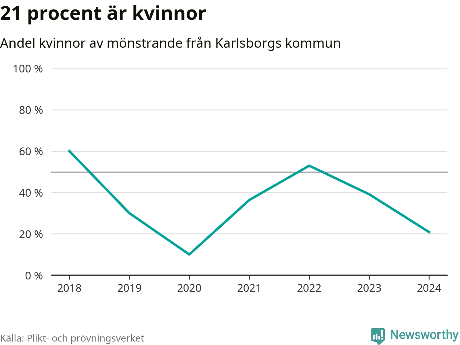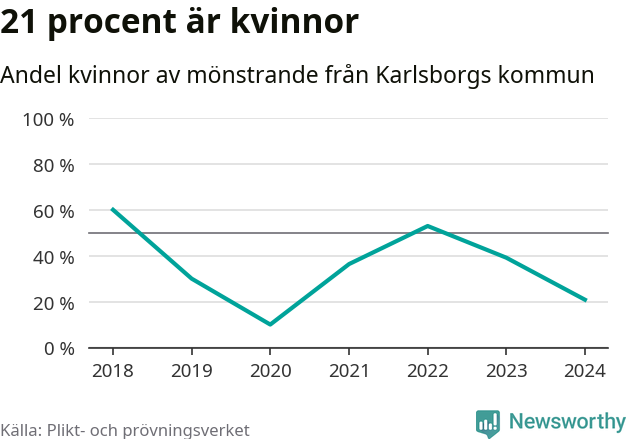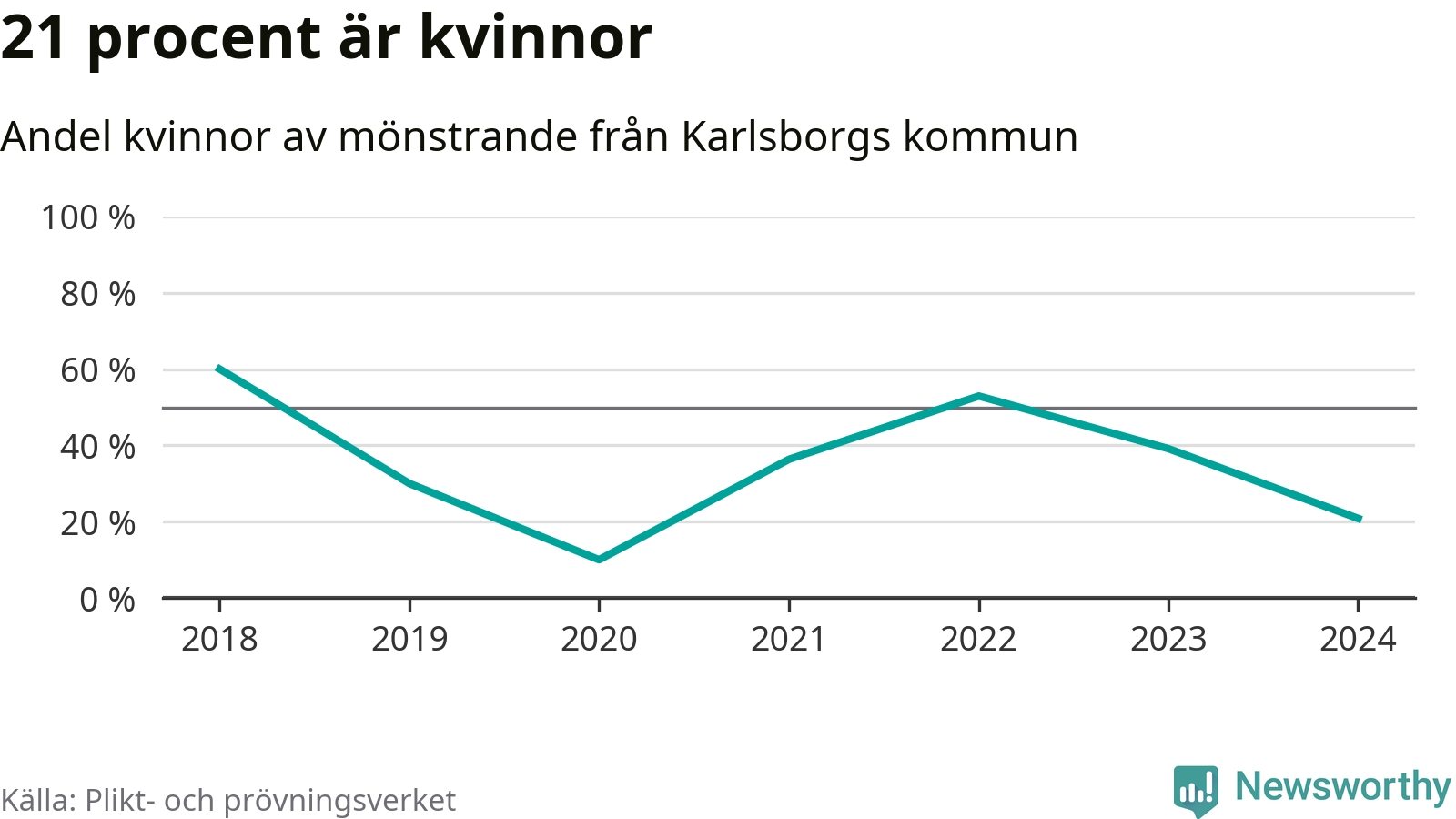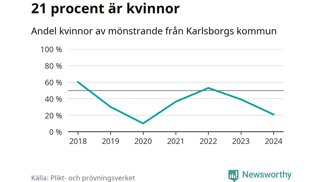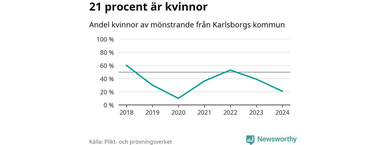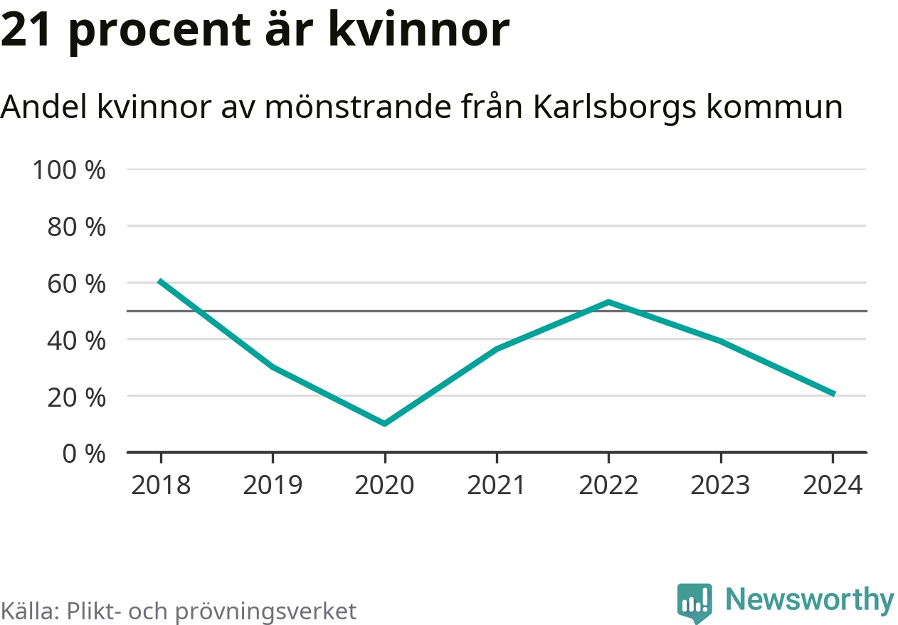 Fem av de som kallats till mönstring från Karlsborg är kvinnor, vilket motsvarar 21 procent av de mönstrande. Som mest har nio kvinnor kallats från kommunen (2023 och 2022). I riket som helhet är 30 procent av de mönstrande tjejer.