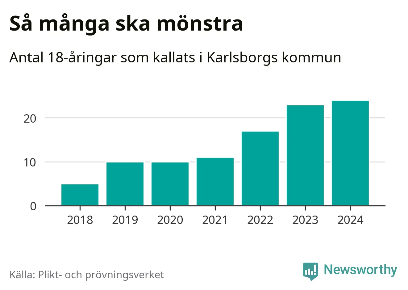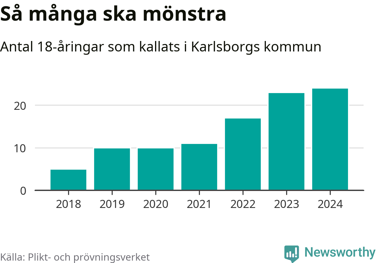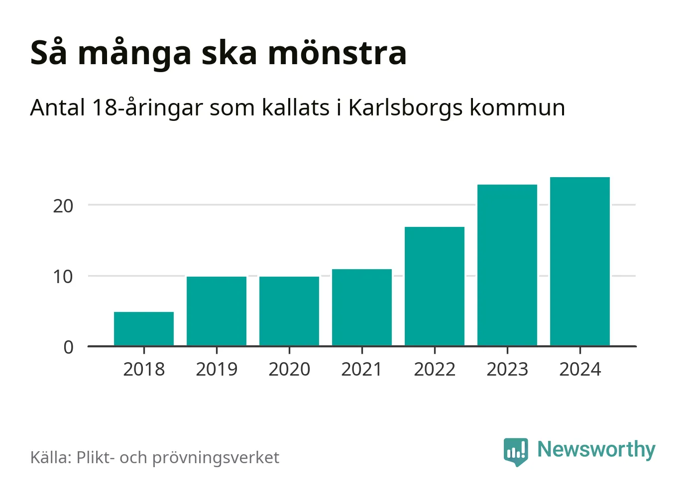 24 personer är det högsta antalet kallade i Karlsborg sedan 2018, som är första året med statistik på kommunnivå (värnplikten återinfördes 2017), och en mönstrande mer än 2023. 2018 kallades som jämförelse fem 18-åringar från Karlsborg till mönstring. Det motsvarade ungefär 8 procent av årskullen född år 2000. Totalt från Västra Götalands län kallas 4 562 personer födda 2006 i år.