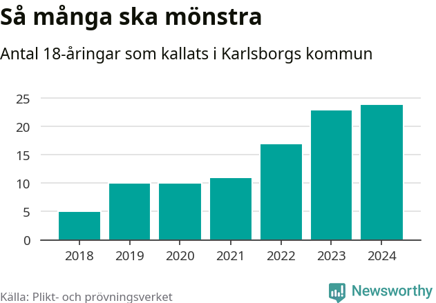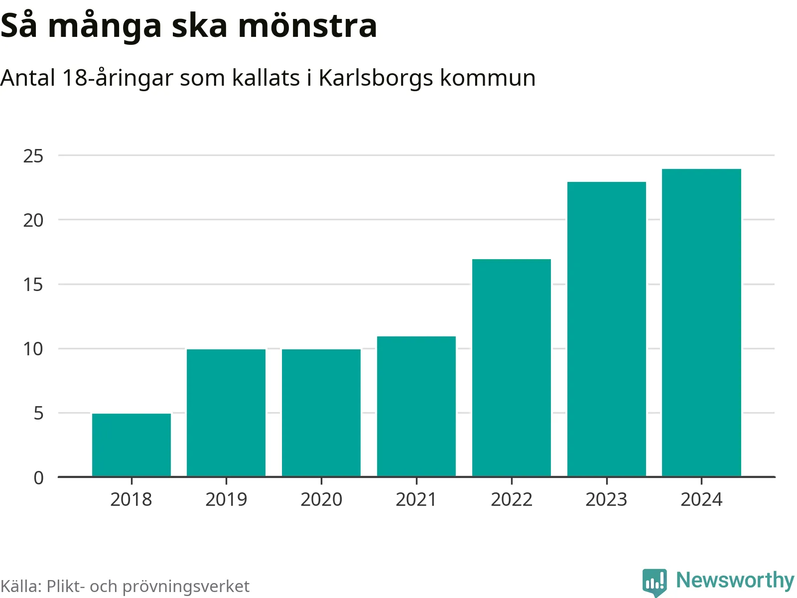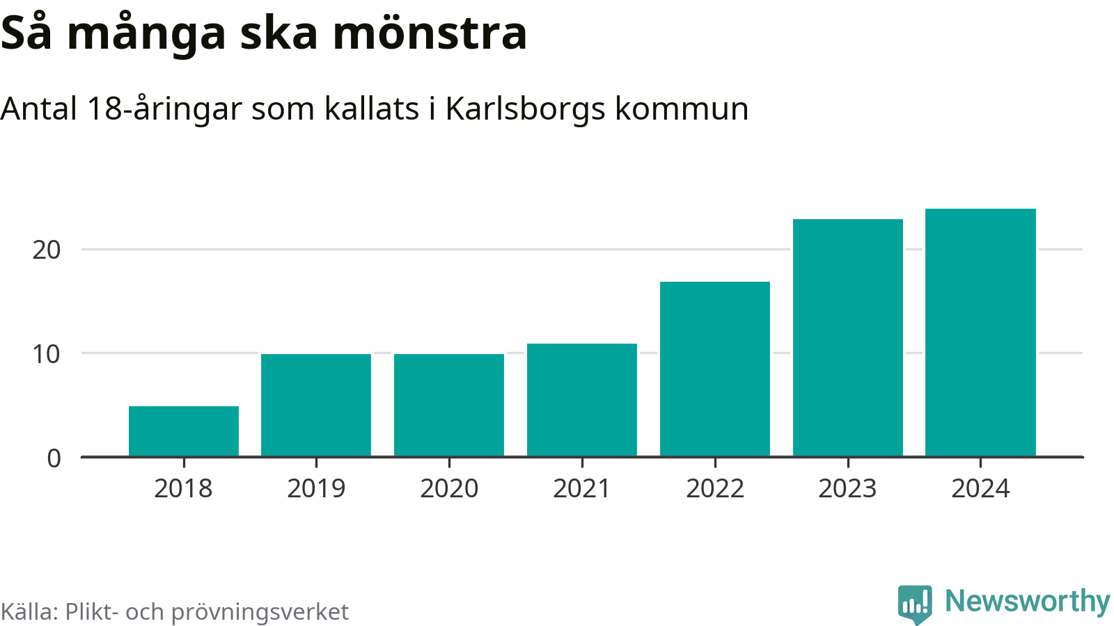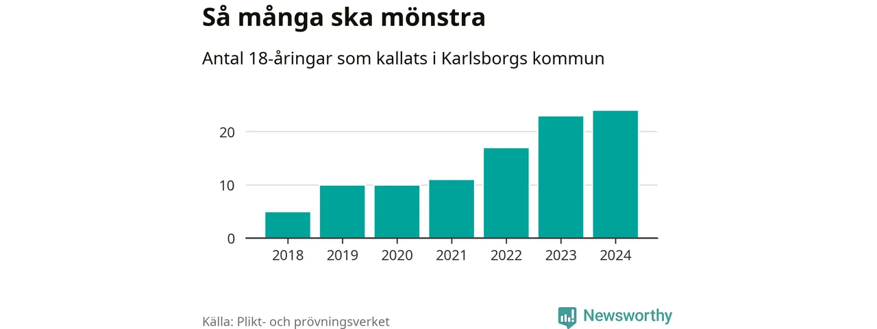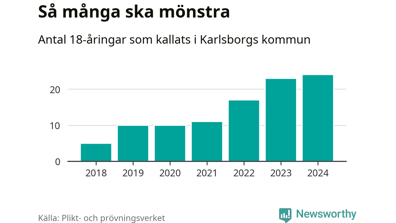24 personer är det högsta antalet kallade i Karlsborg sedan 2018, som är första året med statistik på kommunnivå (värnplikten återinfördes 2017), och en mönstrande mer än 2023. 2018 kallades som jämförelse fem 18-åringar från Karlsborg till mönstring. Det motsvarade ungefär 8 procent av årskullen född år 2000. Totalt från Västra Götalands län kallas 4 562 personer födda 2006 i år.