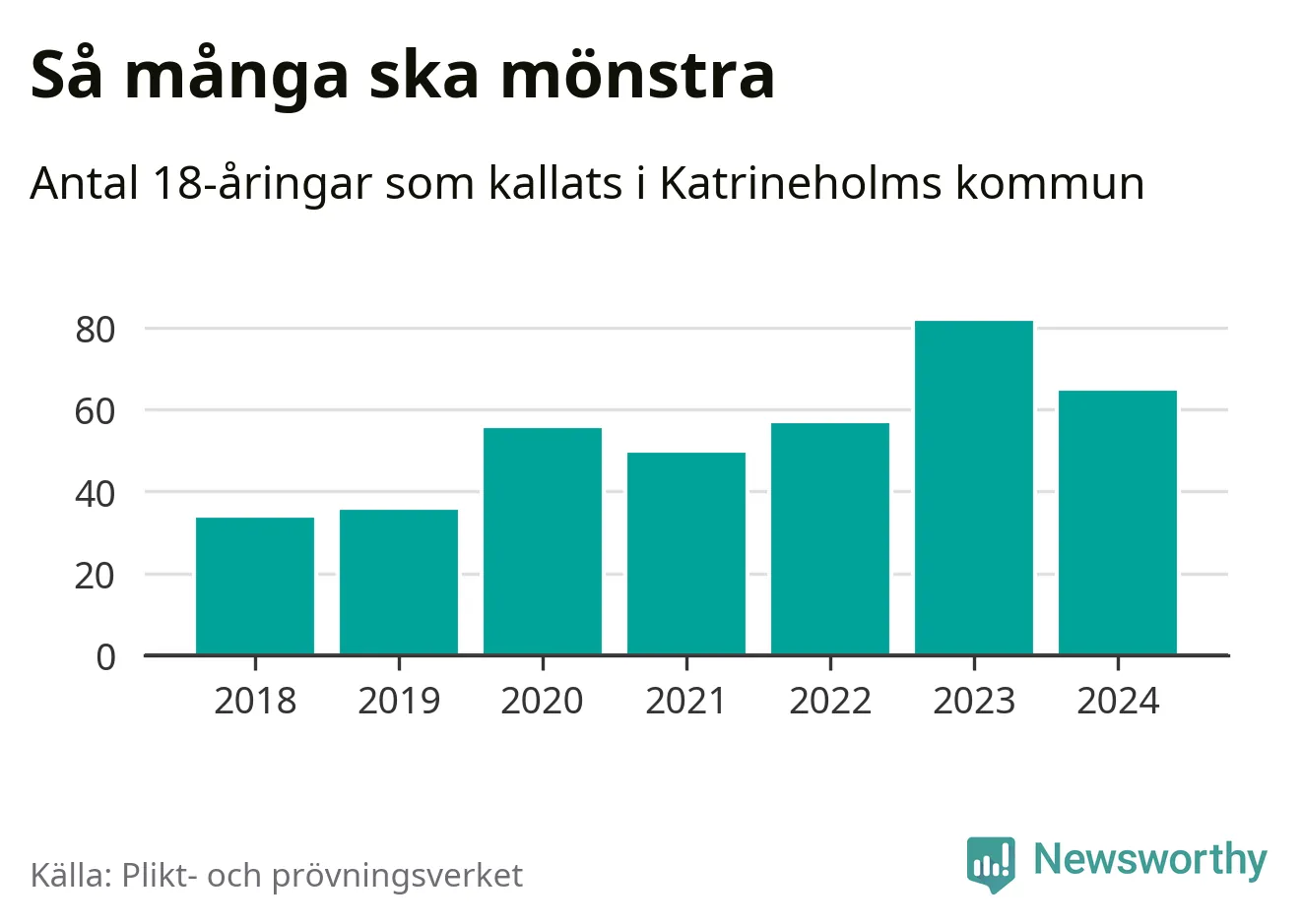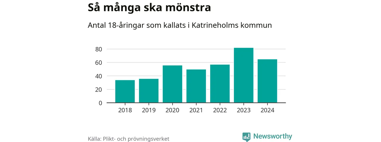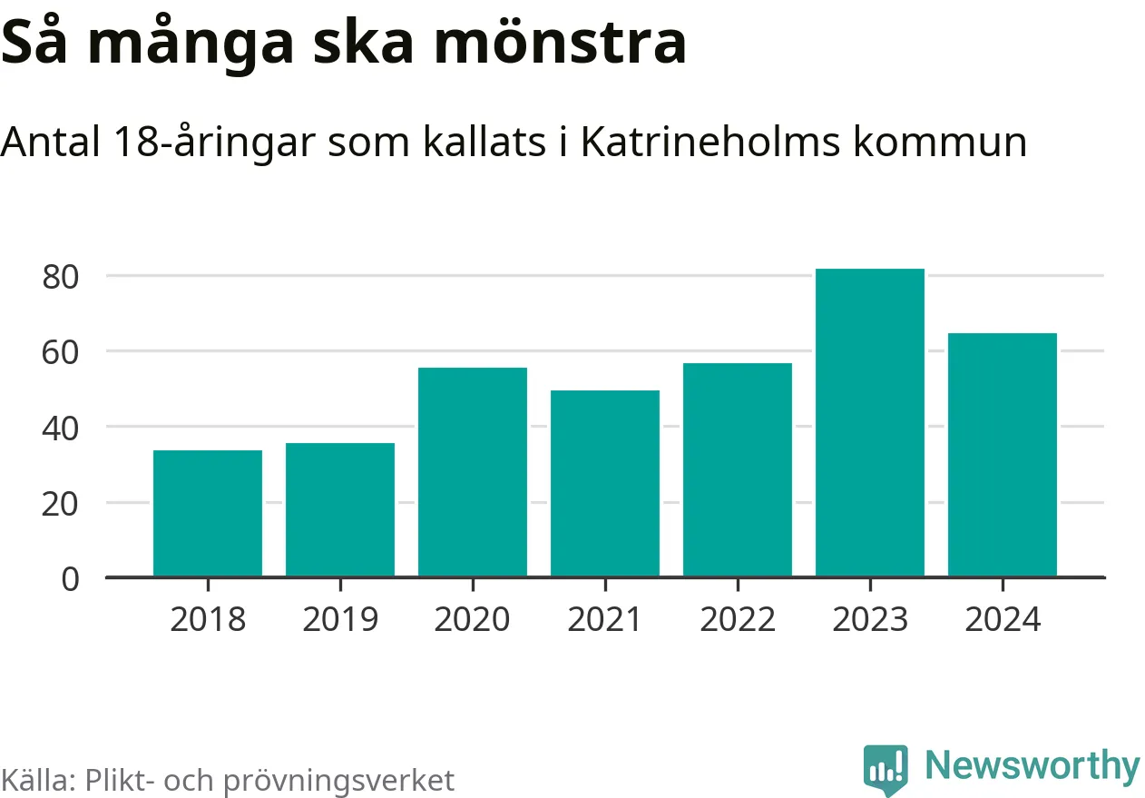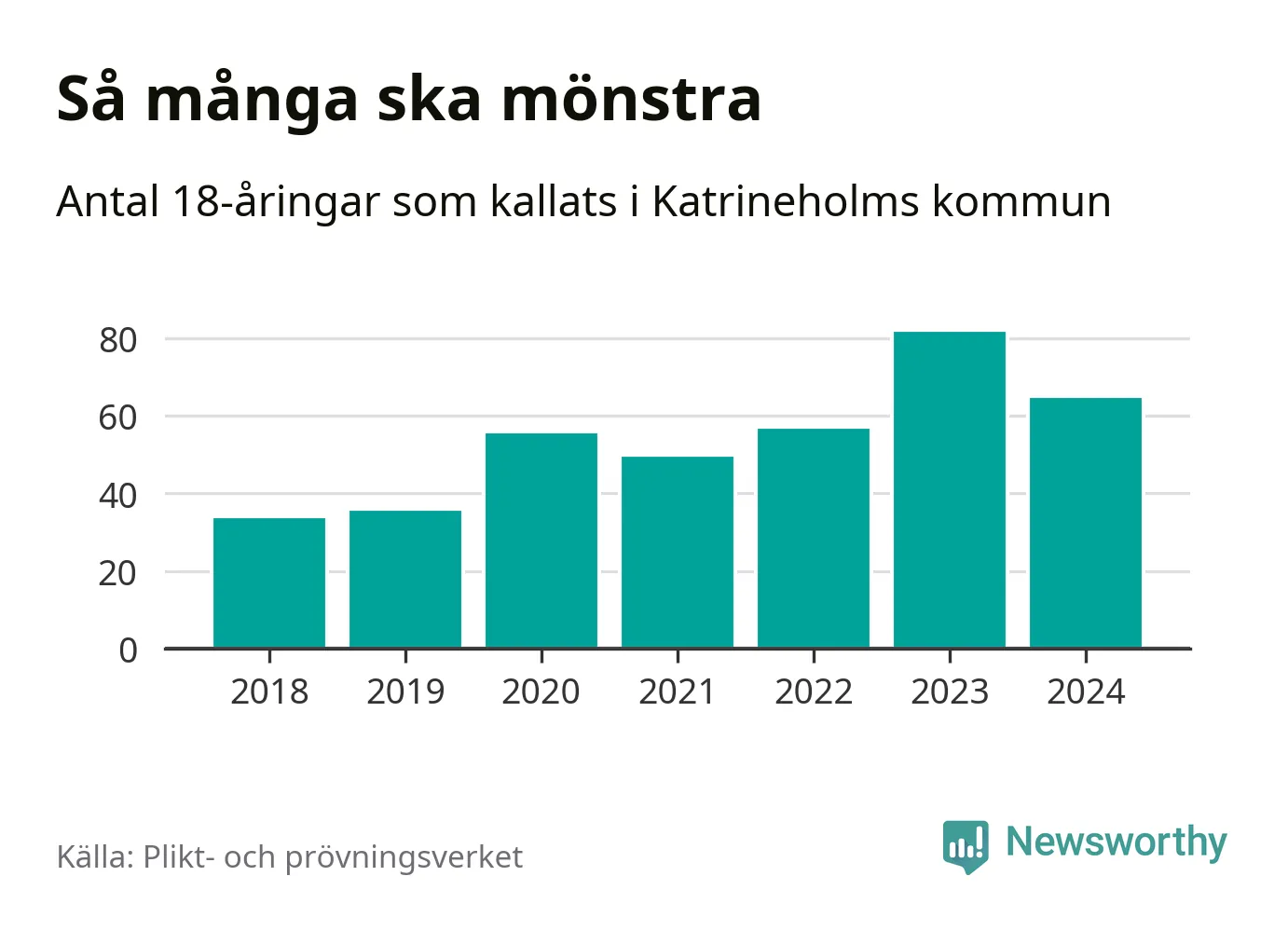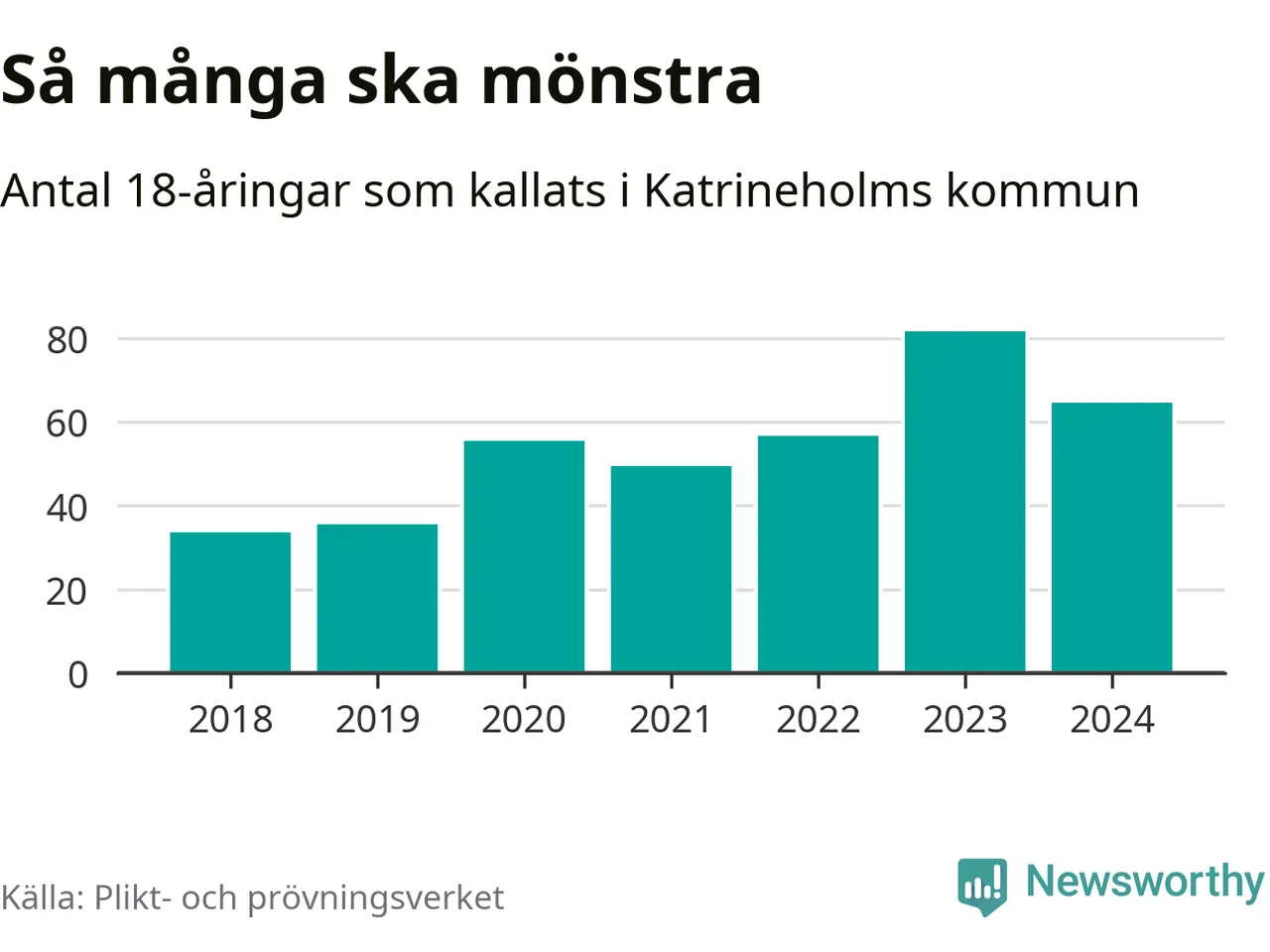 65 personer är 17 färre än 2023. 2018 kallades som jämförelse 34 artonåringar från Katrineholm till mönstring. Det motsvarade ungefär 9 procent av årskullen född år 2000. Totalt från Södermanlands län kallas 817 personer födda 2006 i år.