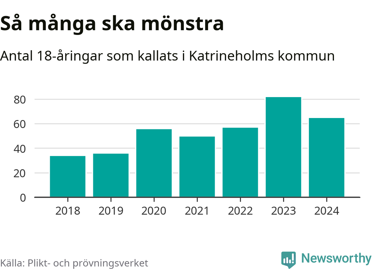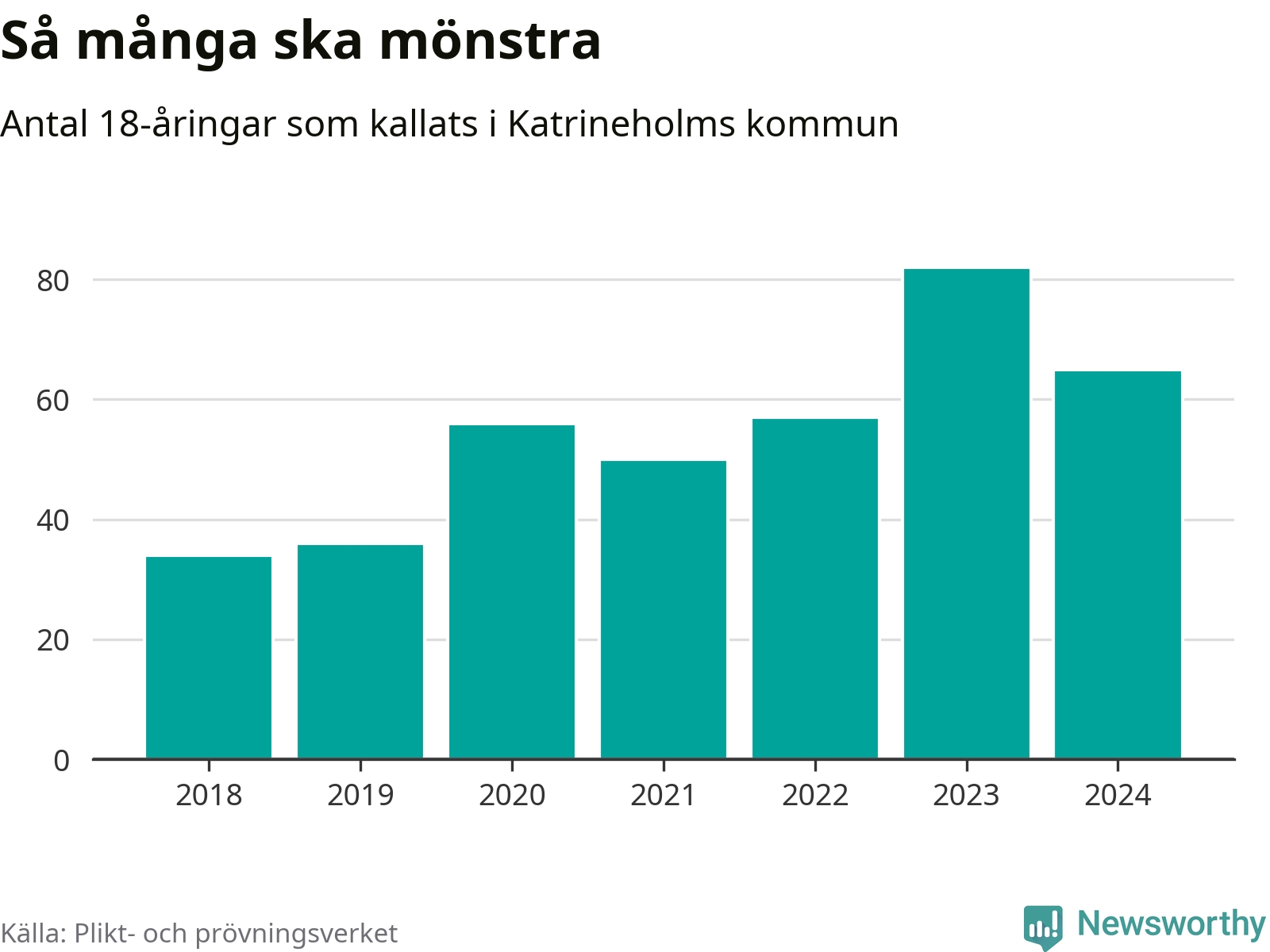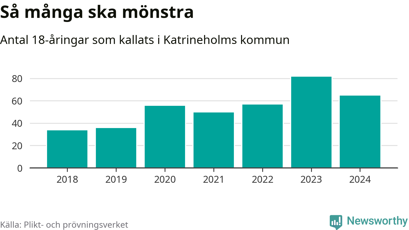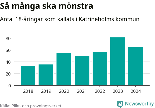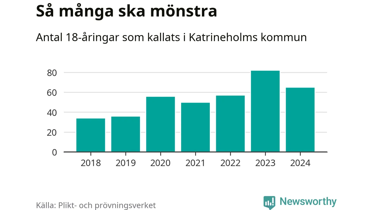 65 personer är 17 färre än 2023. 2018 kallades som jämförelse 34 artonåringar från Katrineholm till mönstring. Det motsvarade ungefär 9 procent av årskullen född år 2000. Totalt från Södermanlands län kallas 817 personer födda 2006 i år.