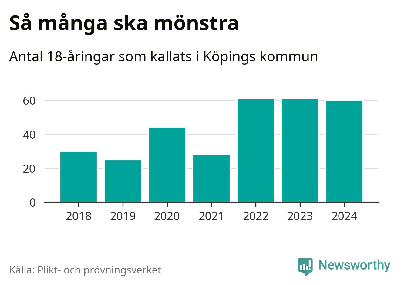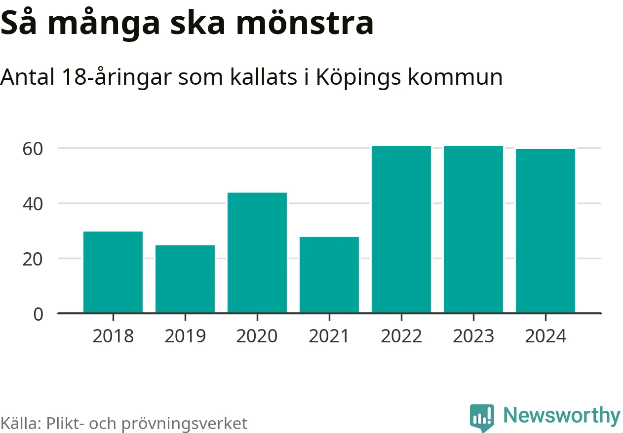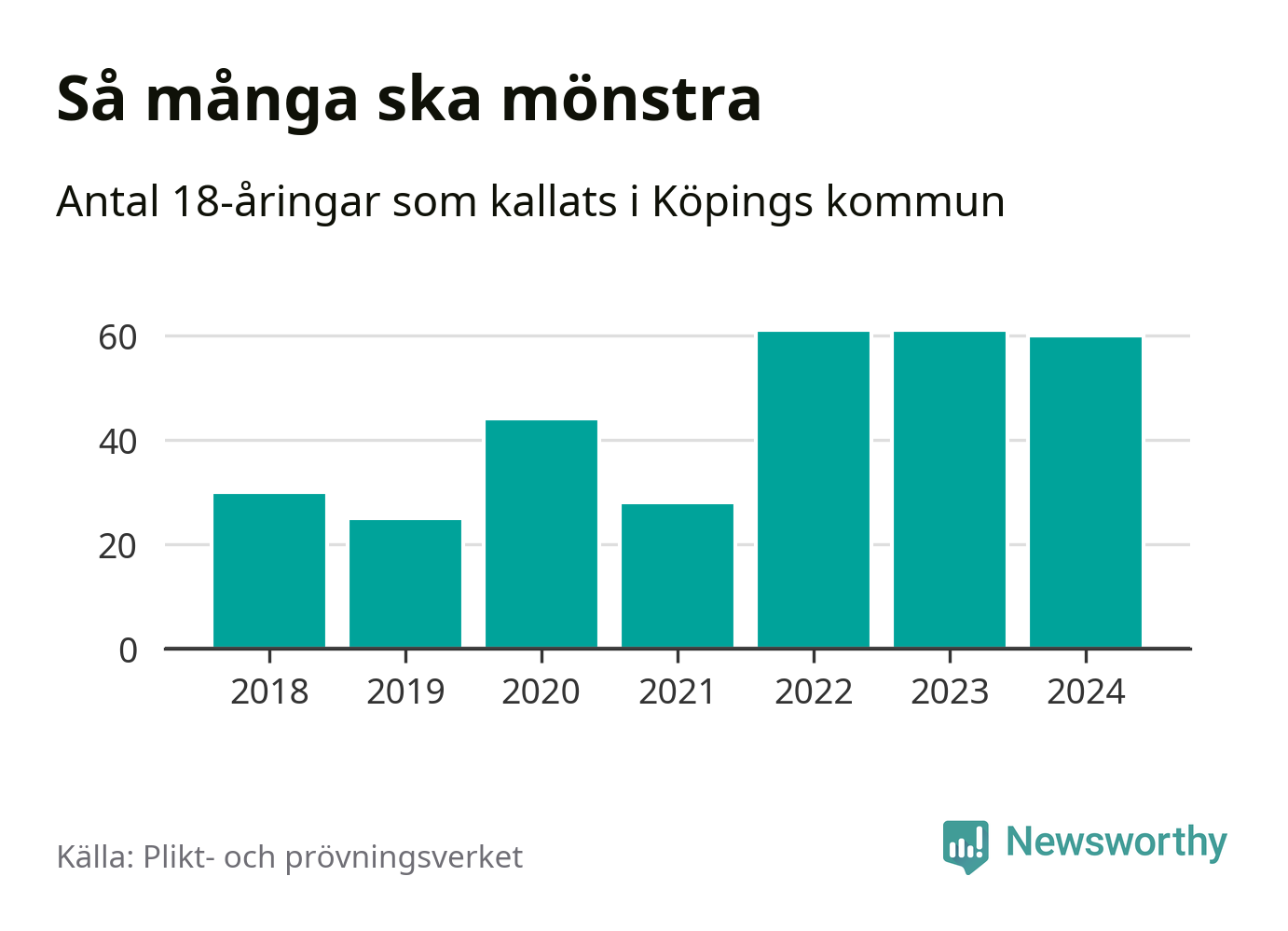 60 personer är en färre än 2023, men sett som andel av respektive åldersgrupp är skillnaden liten. 2018 kallades som jämförelse 30 artonåringar från Köping till mönstring. Det motsvarade ungefär 10 procent av årskullen född år 2000. Totalt från Västmanlands län kallas 717 personer födda 2006 i år.