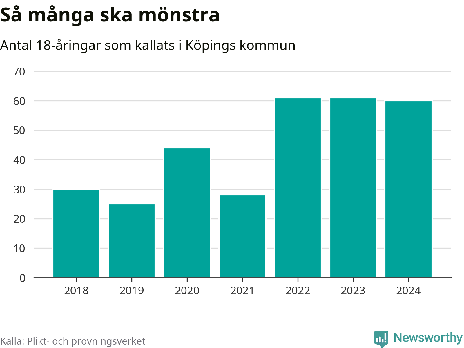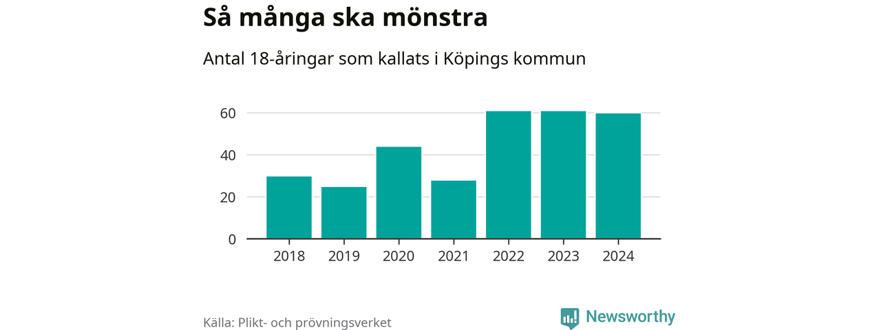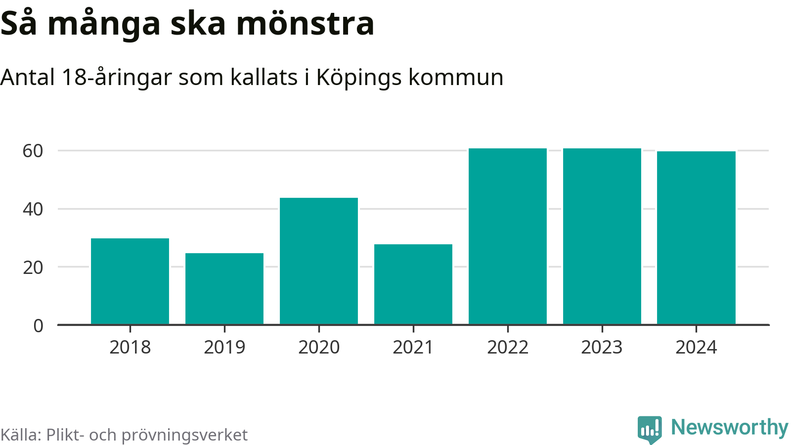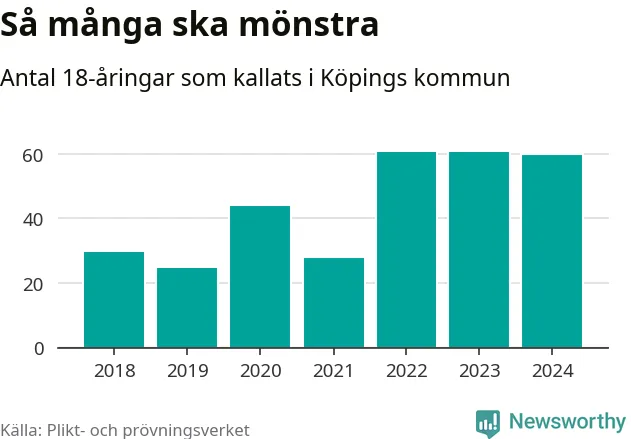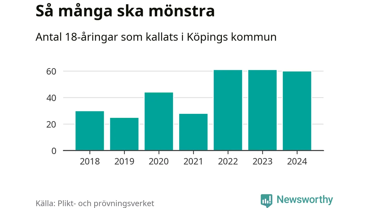 60 personer är en färre än 2023, men sett som andel av respektive åldersgrupp är skillnaden liten. 2018 kallades som jämförelse 30 artonåringar från Köping till mönstring. Det motsvarade ungefär 10 procent av årskullen född år 2000. Totalt från Västmanlands län kallas 717 personer födda 2006 i år.