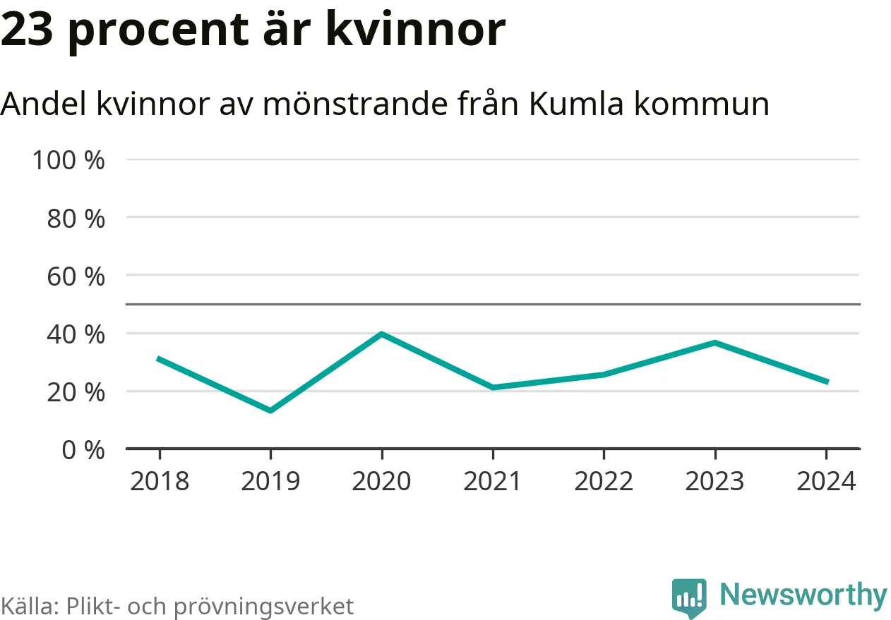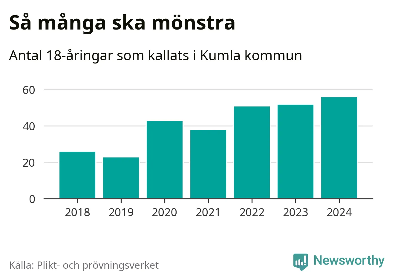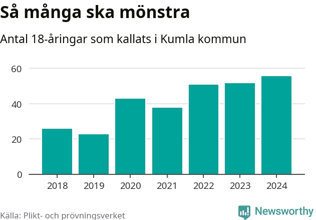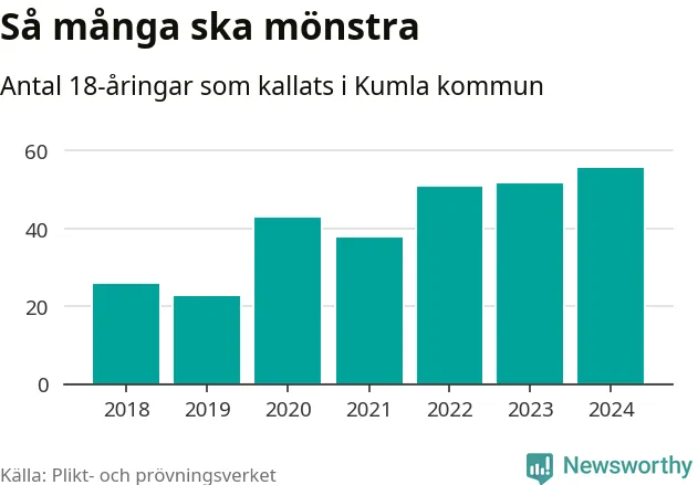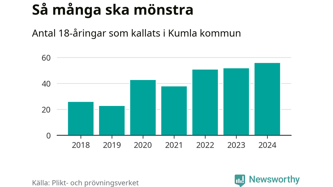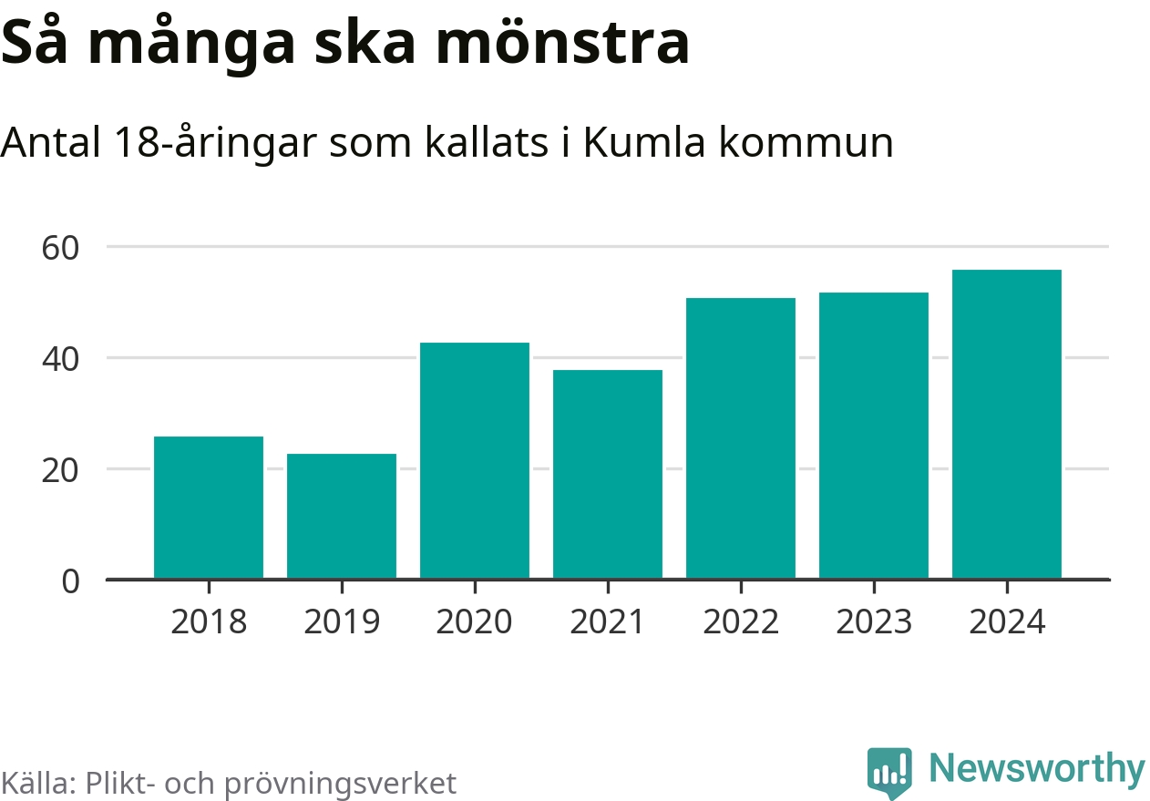 56 personer är det högsta antalet kallade i Kumla sedan 2018, som är första året med statistik på kommunnivå (värnplikten återinfördes 2017), och fyra mönstrande mer än 2023. 2018 kallades som jämförelse 26 artonåringar från Kumla till mönstring. Det motsvarade ungefär 9 procent av årskullen född år 2000. Totalt från Örebro län kallas 786 personer födda 2006 i år.