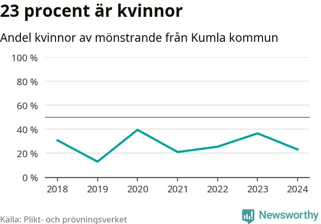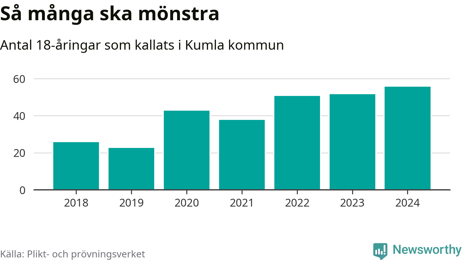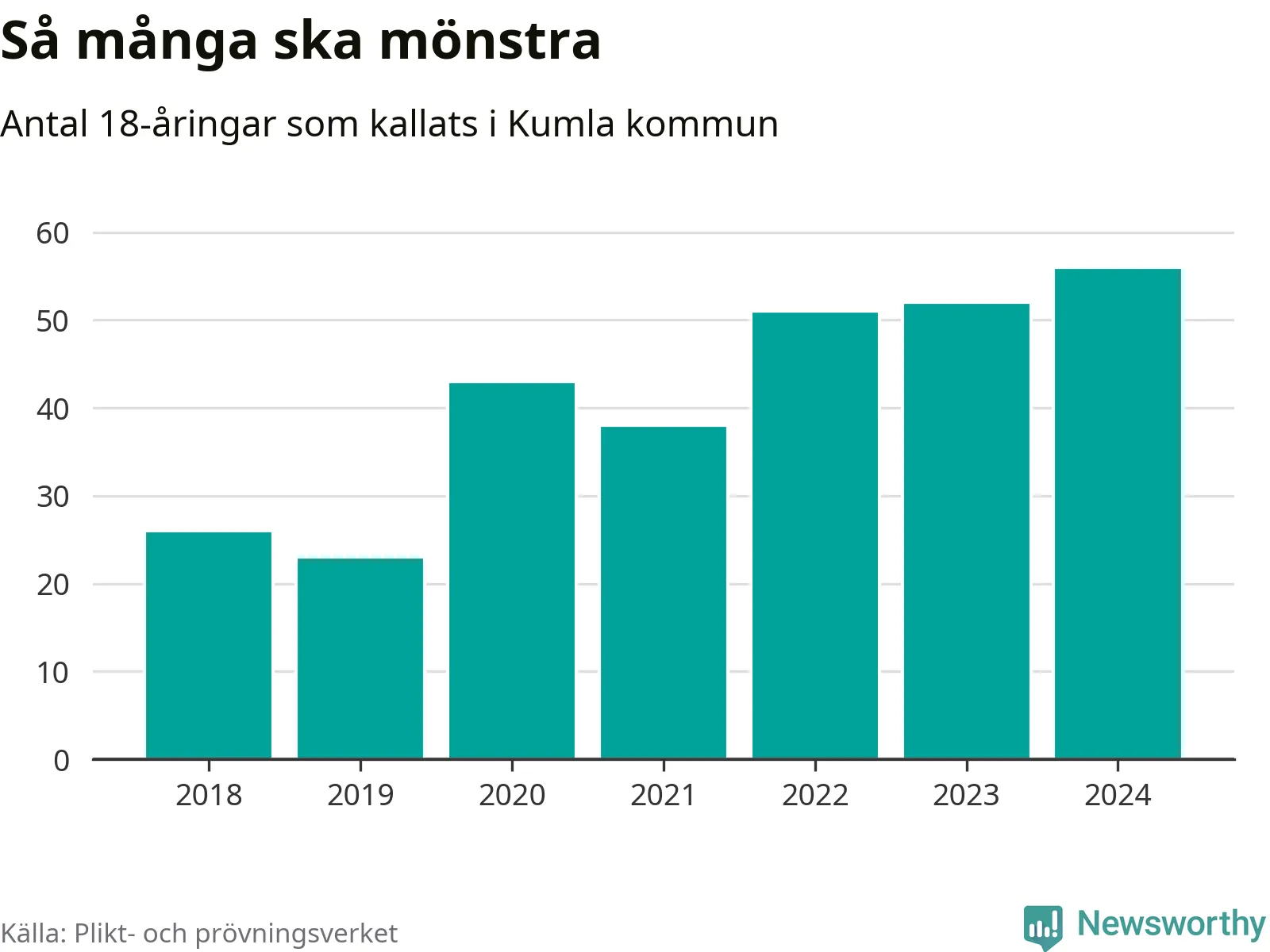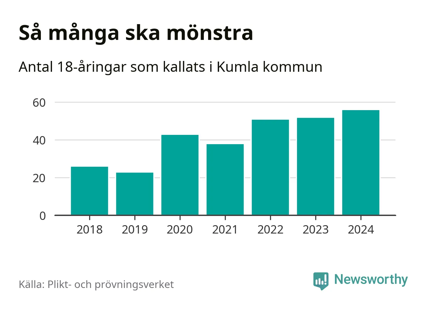 56 personer är det högsta antalet kallade i Kumla sedan 2018, som är första året med statistik på kommunnivå (värnplikten återinfördes 2017), och fyra mönstrande mer än 2023. 2018 kallades som jämförelse 26 artonåringar från Kumla till mönstring. Det motsvarade ungefär 9 procent av årskullen född år 2000. Totalt från Örebro län kallas 786 personer födda 2006 i år.