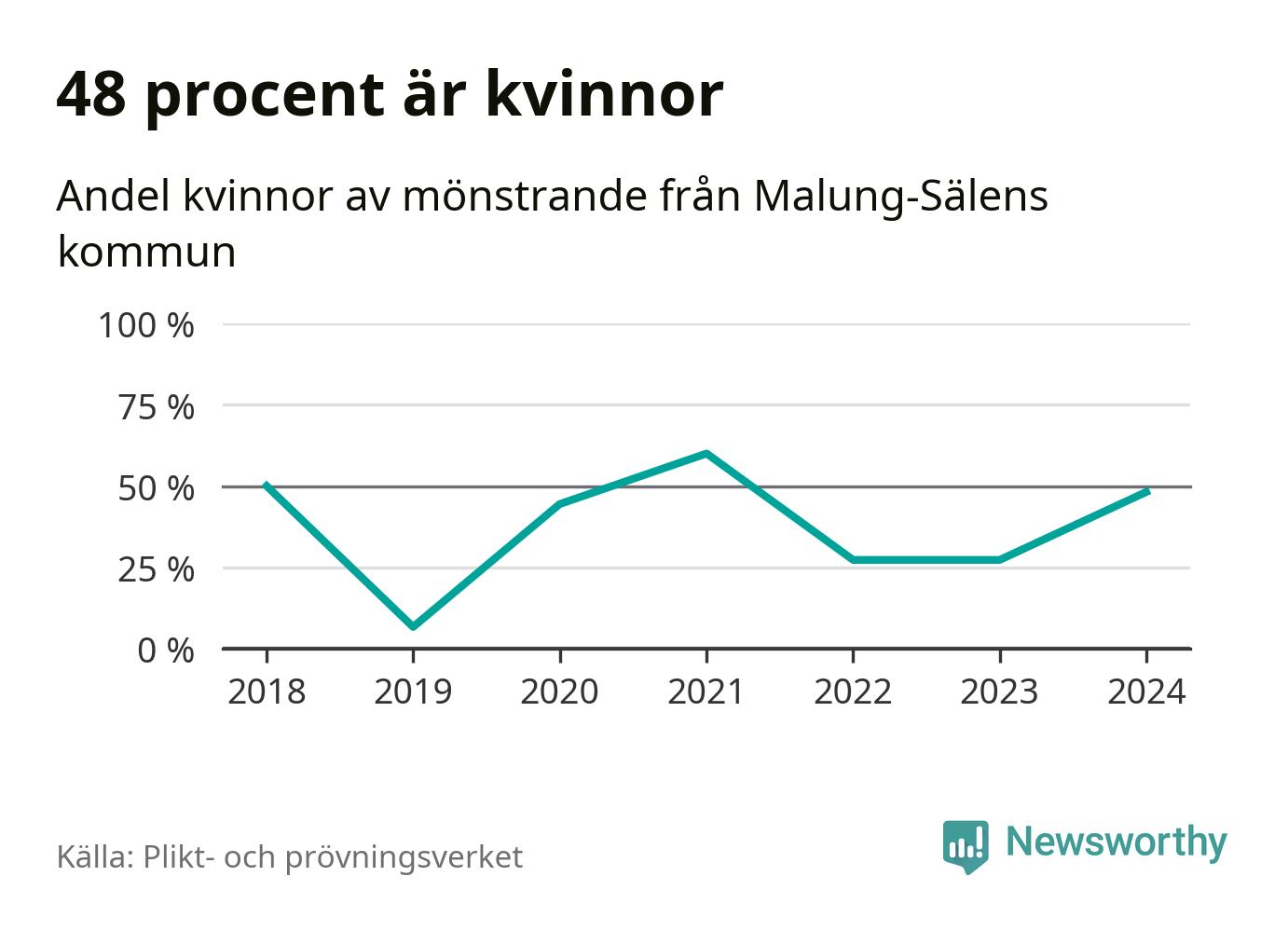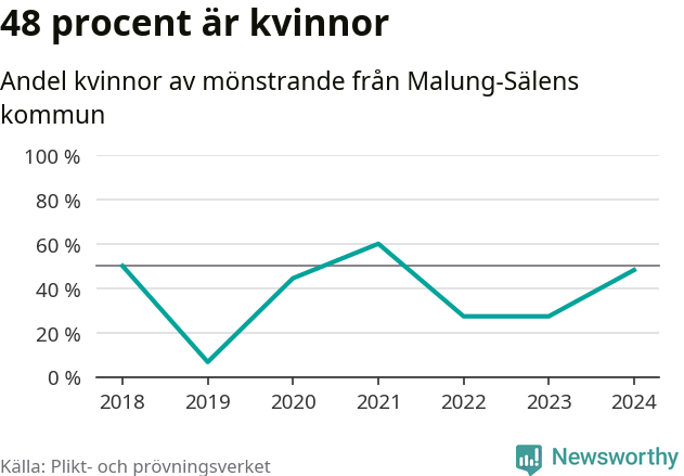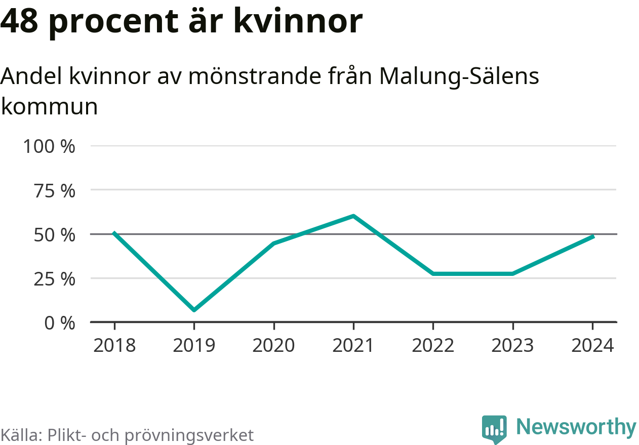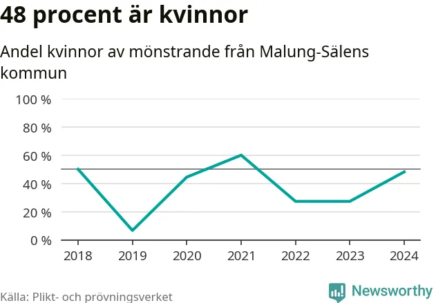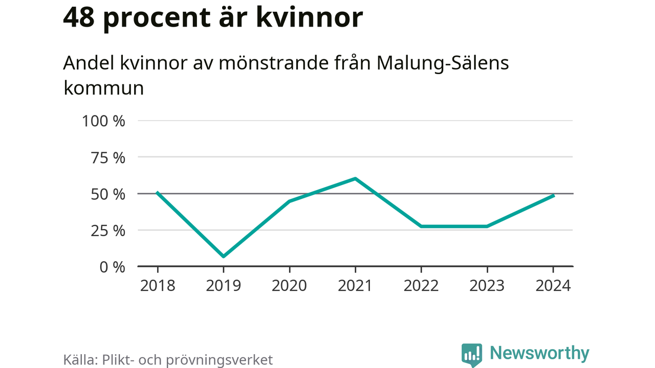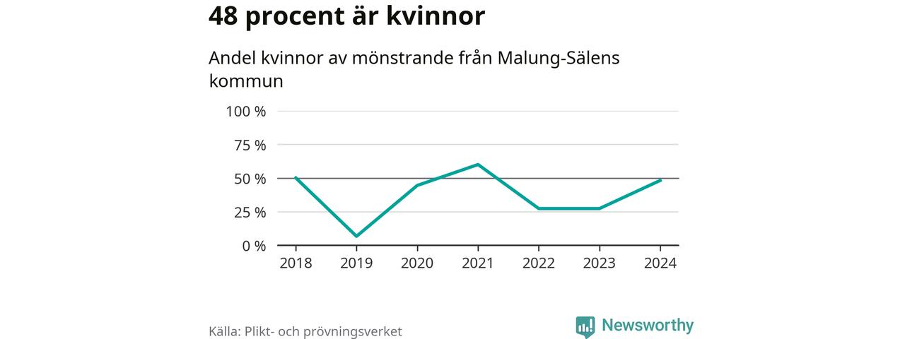13 av de som kallats till mönstring från Malung-Sälen är kvinnor, vilket motsvarar 48 procent av de mönstrande. I absoluta tal är det fler kvinnor än något år sedan värnplikten återinfördes, men 2021 var en större andel av de mönstrande från kommunen kvinnor (60 procent). I riket som helhet är 30 procent av de mönstrande tjejer.