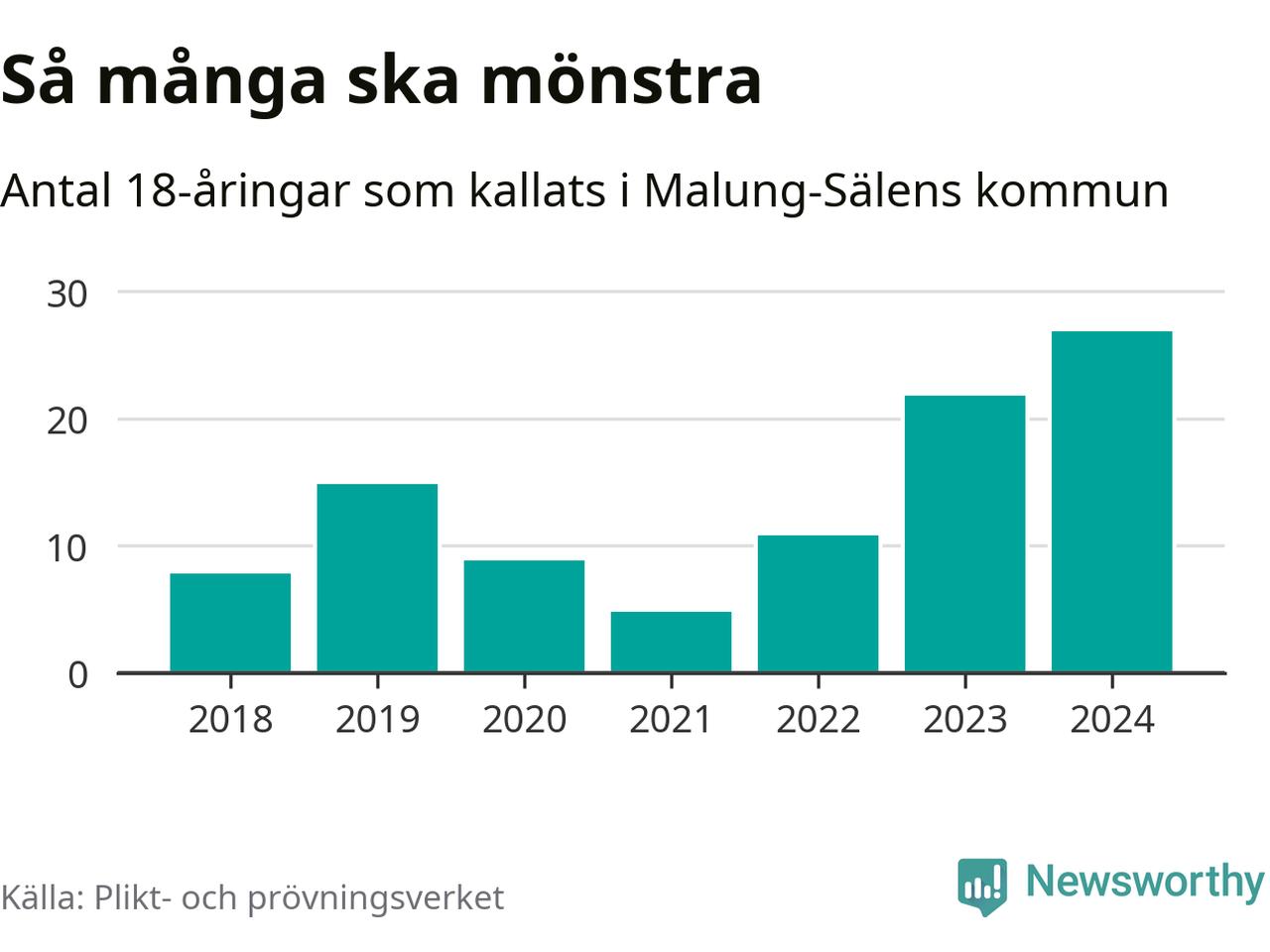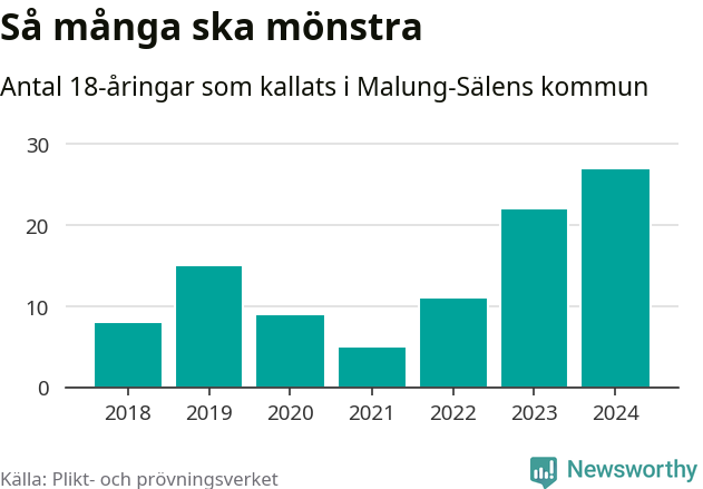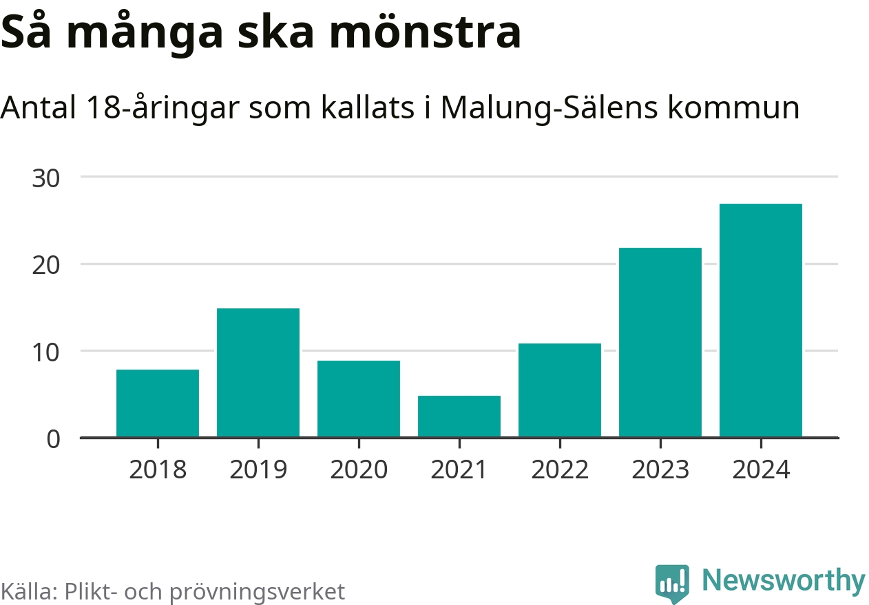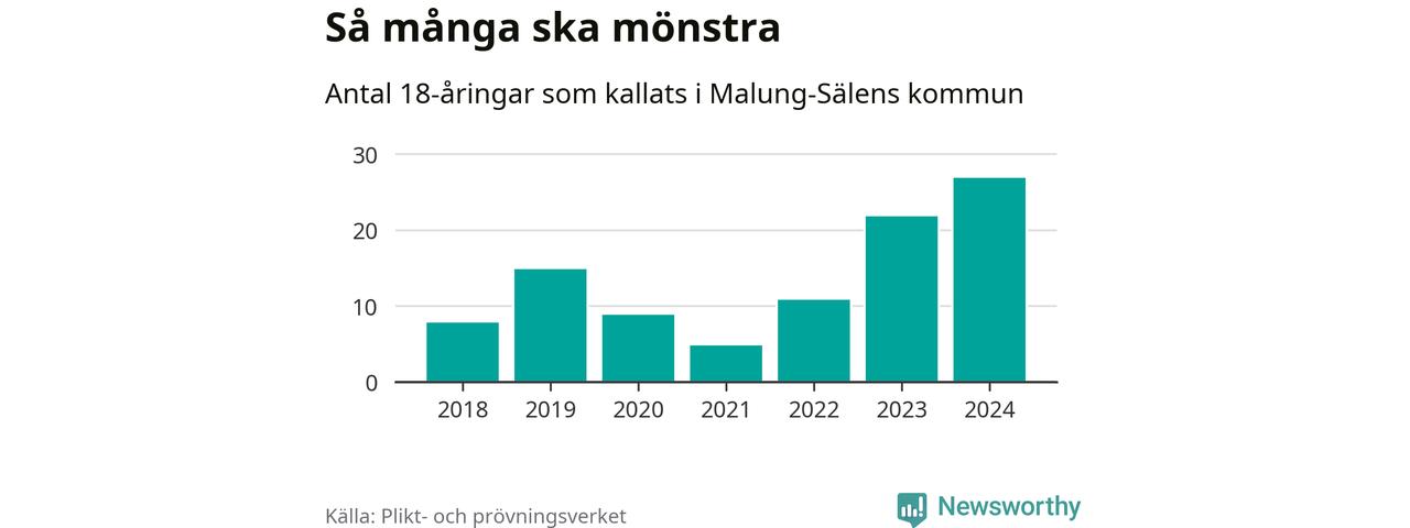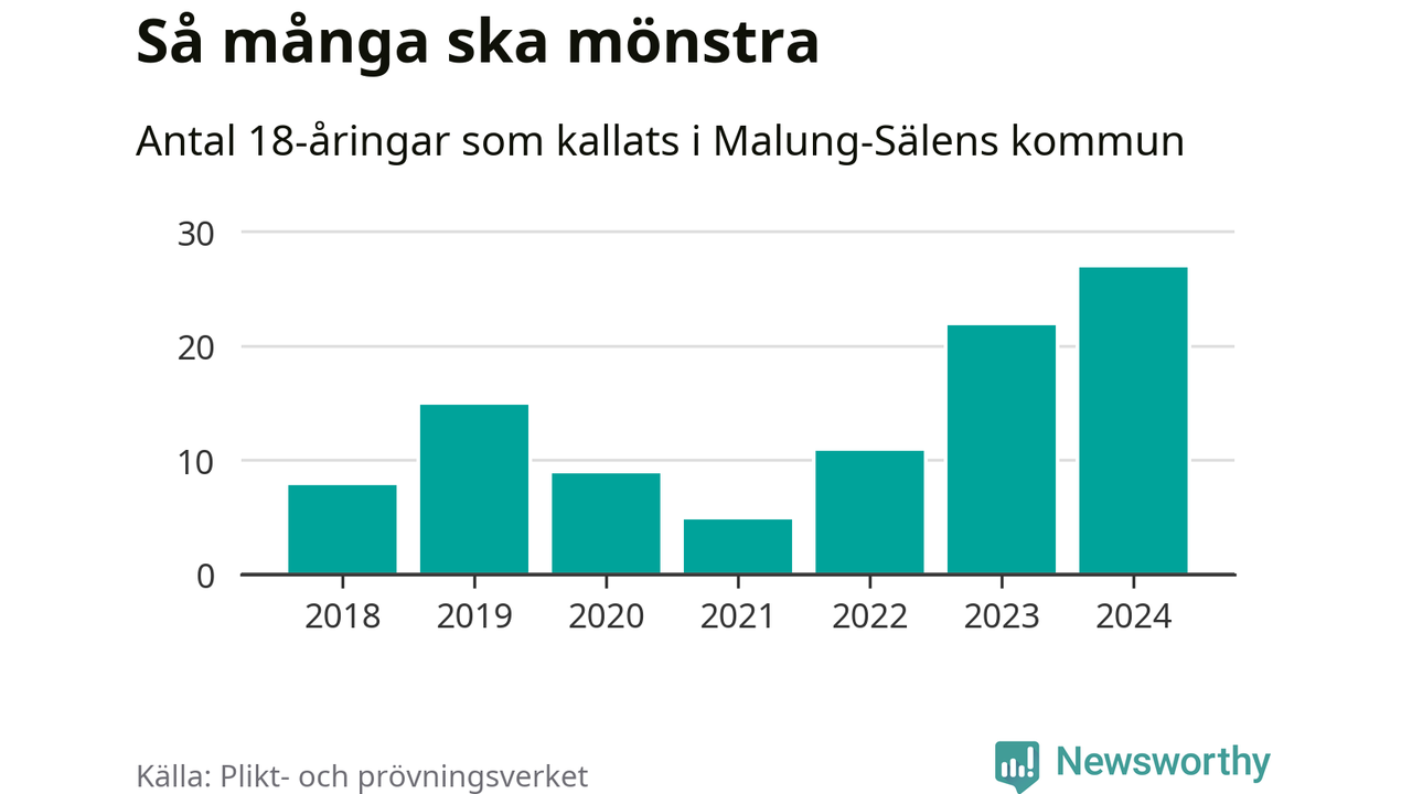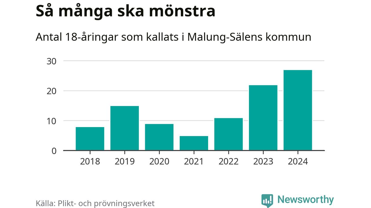 27 personer är det högsta antalet kallade i Malung-Sälen sedan 2018, som är första året med statistik på kommunnivå (värnplikten återinfördes 2017), och fem mönstrande mer än 2023. 2018 kallades som jämförelse åtta 18-åringar från Malung-Sälen till mönstring. Det motsvarade ungefär 7 procent av årskullen född år 2000. Totalt från Dalarnas län kallas 729 personer födda 2006 i år.