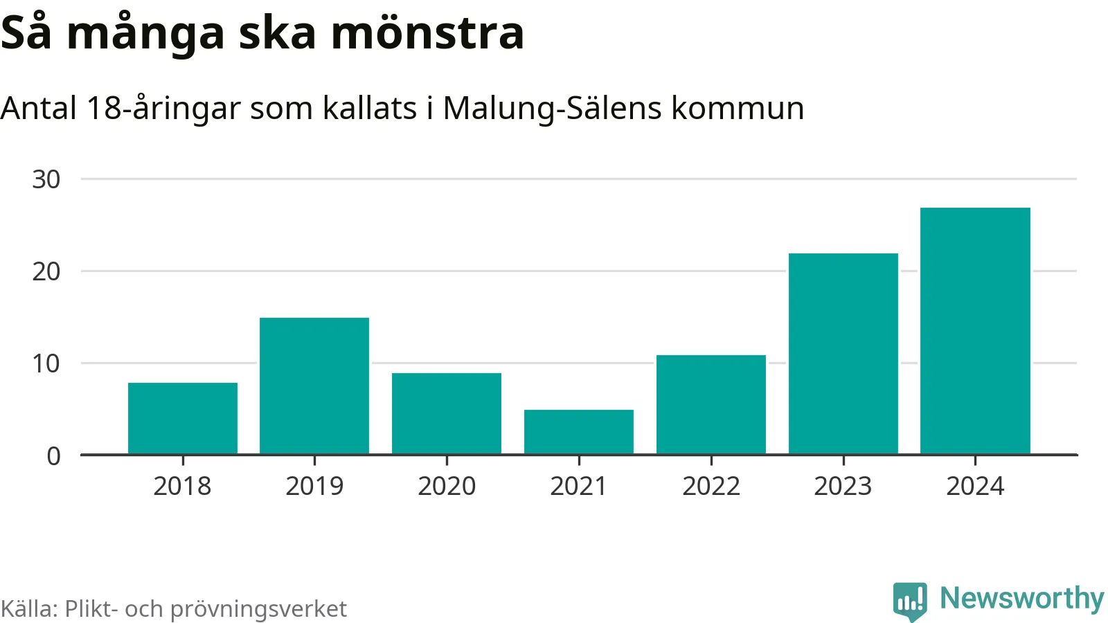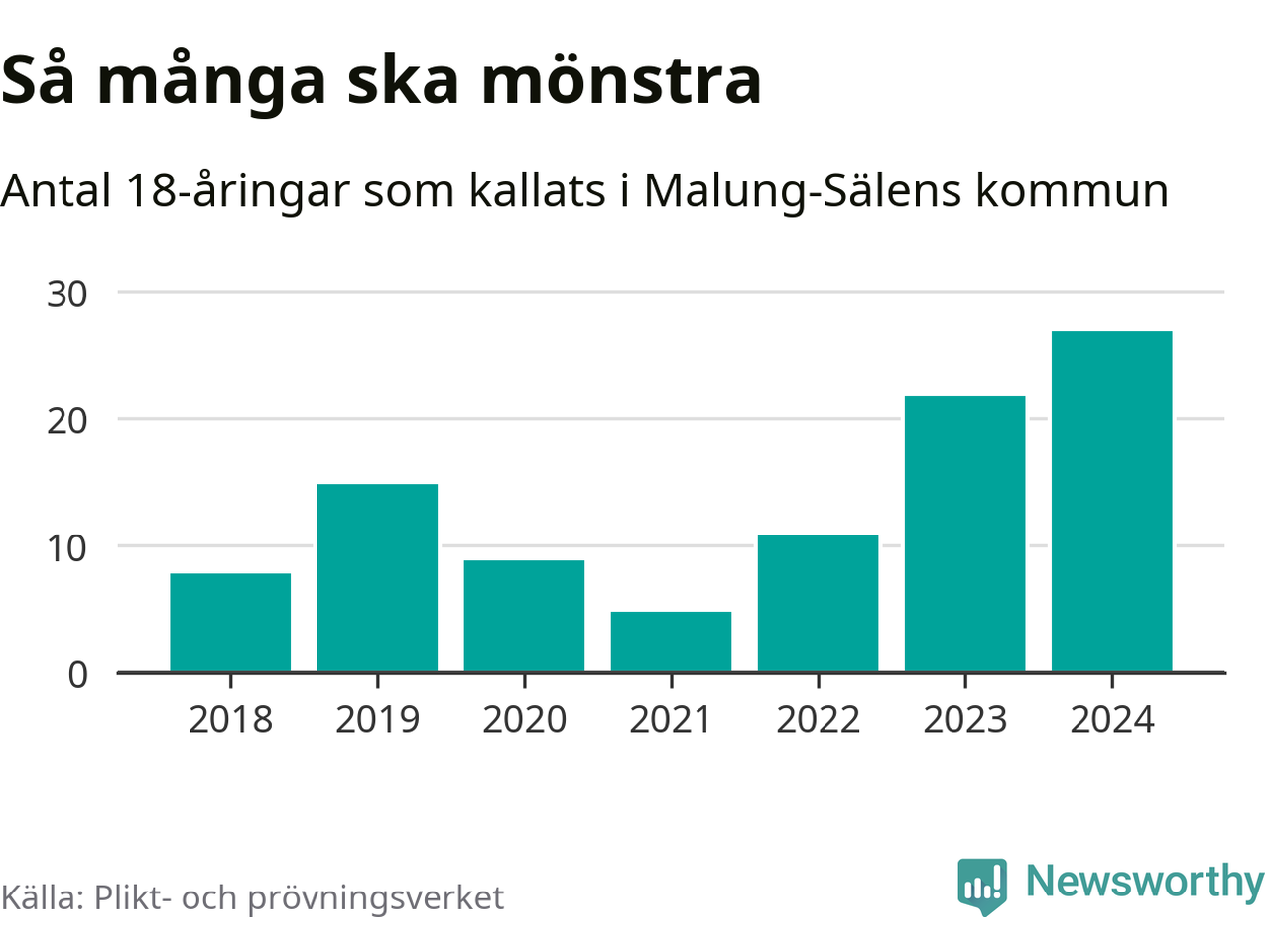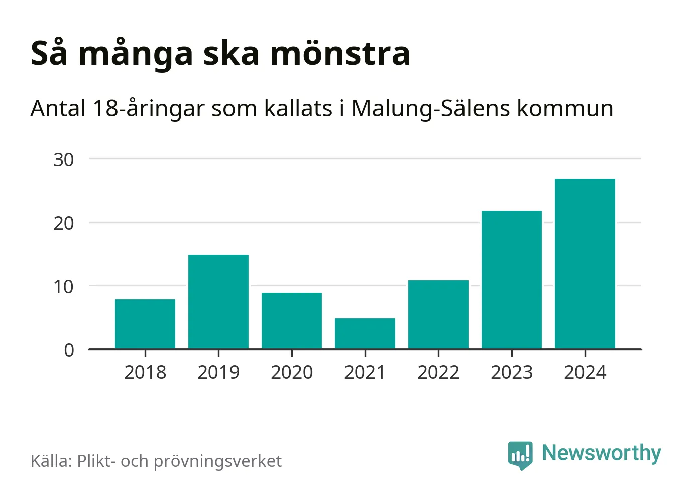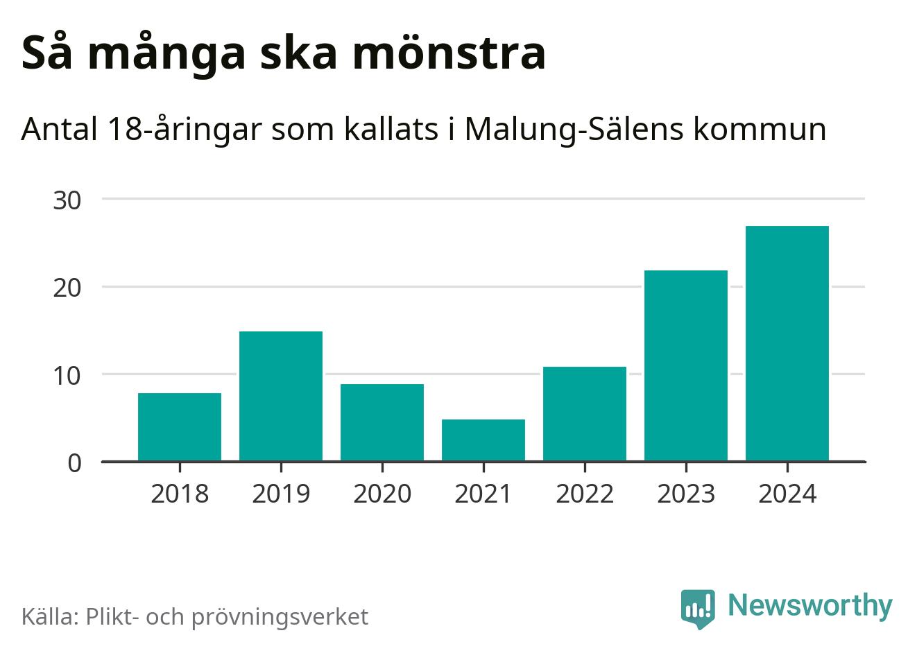 27 personer är det högsta antalet kallade i Malung-Sälen sedan 2018, som är första året med statistik på kommunnivå (värnplikten återinfördes 2017), och fem mönstrande mer än 2023. 2018 kallades som jämförelse åtta 18-åringar från Malung-Sälen till mönstring. Det motsvarade ungefär 7 procent av årskullen född år 2000. Totalt från Dalarnas län kallas 729 personer födda 2006 i år.