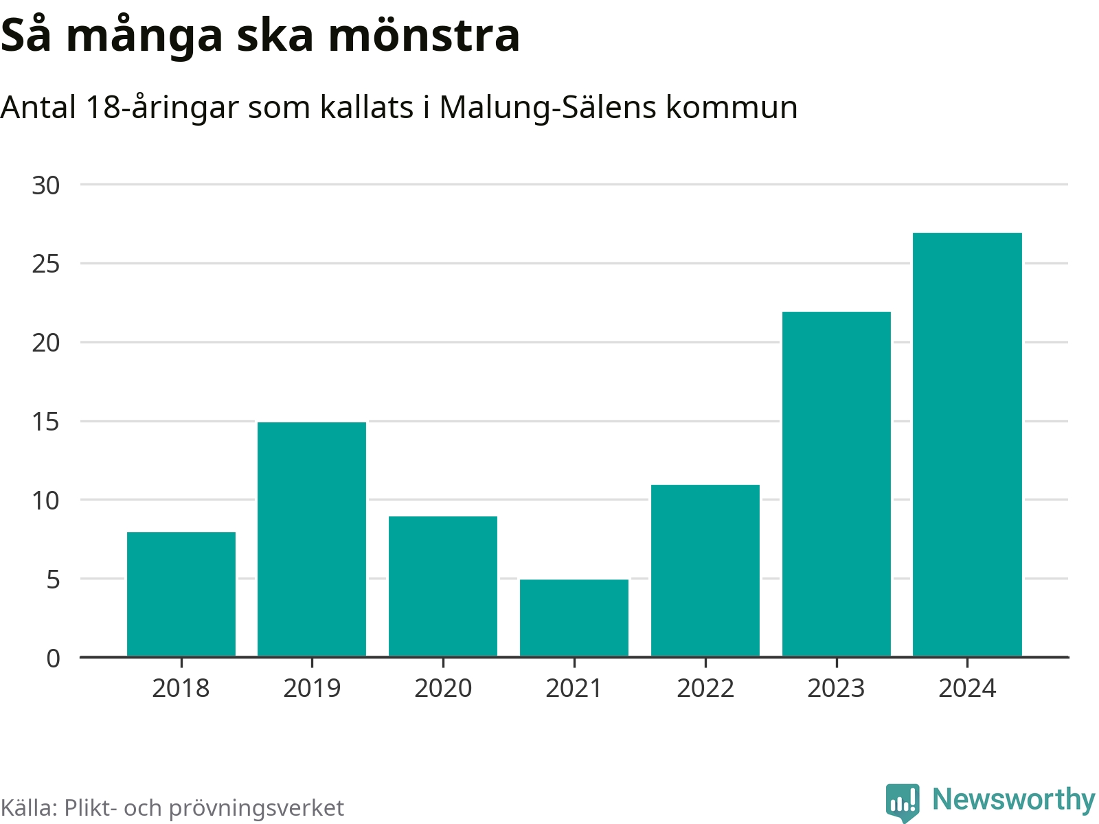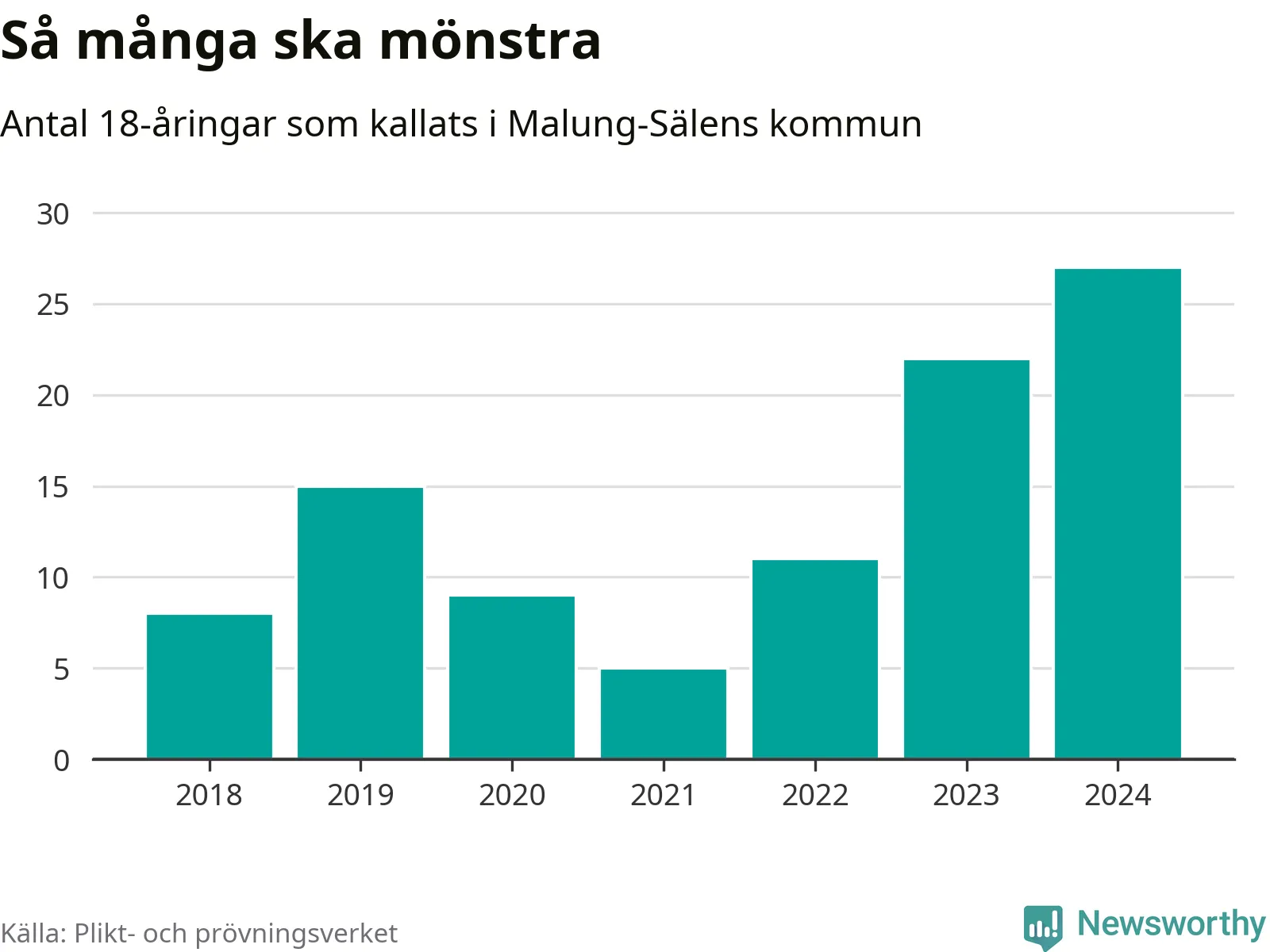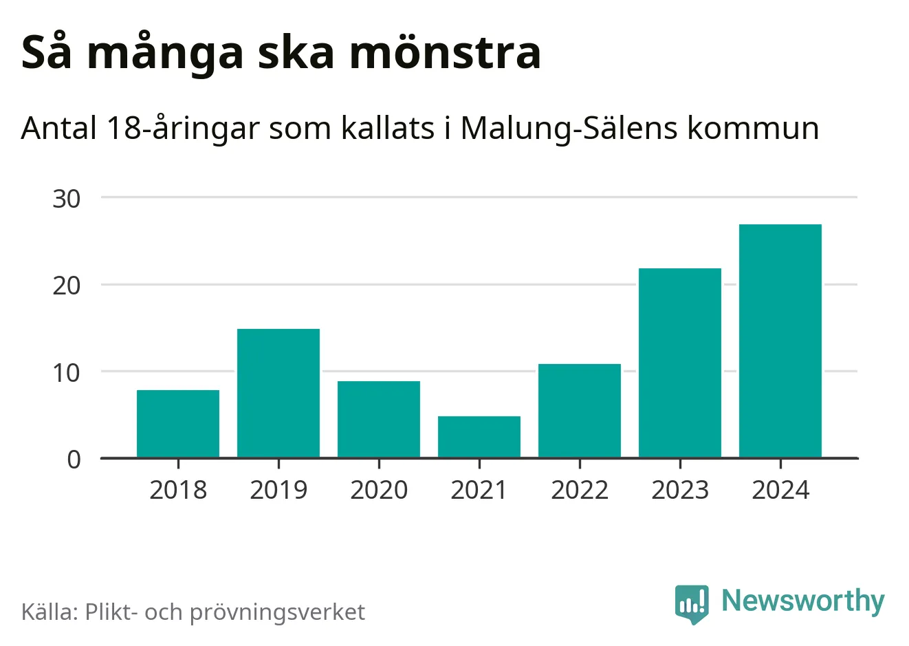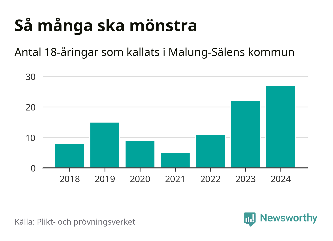 27 personer är det högsta antalet kallade i Malung-Sälen sedan 2018, som är första året med statistik på kommunnivå (värnplikten återinfördes 2017), och fem mönstrande mer än 2023. 2018 kallades som jämförelse åtta 18-åringar från Malung-Sälen till mönstring. Det motsvarade ungefär 7 procent av årskullen född år 2000. Totalt från Dalarnas län kallas 729 personer födda 2006 i år.