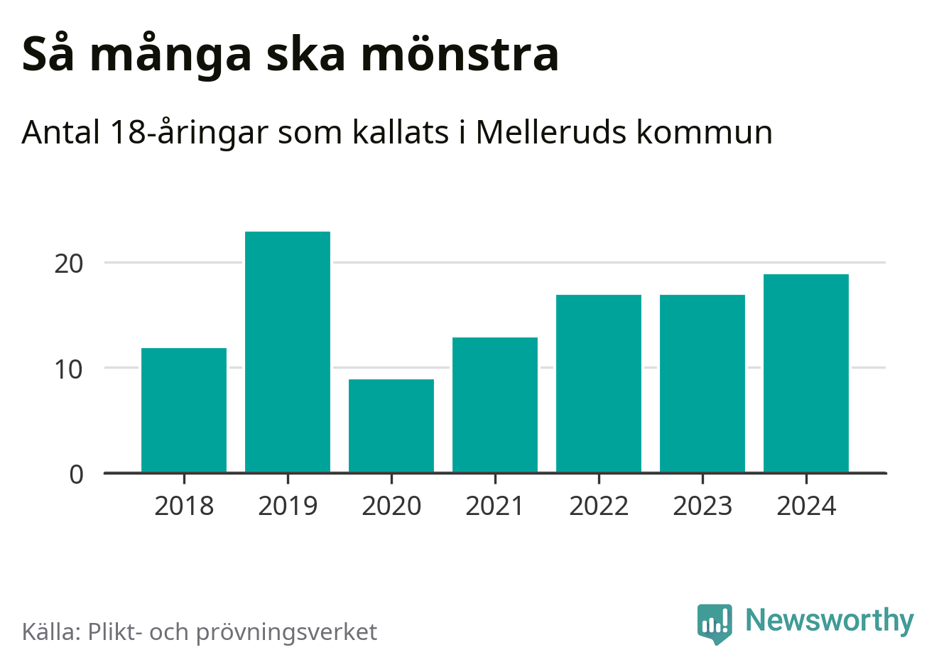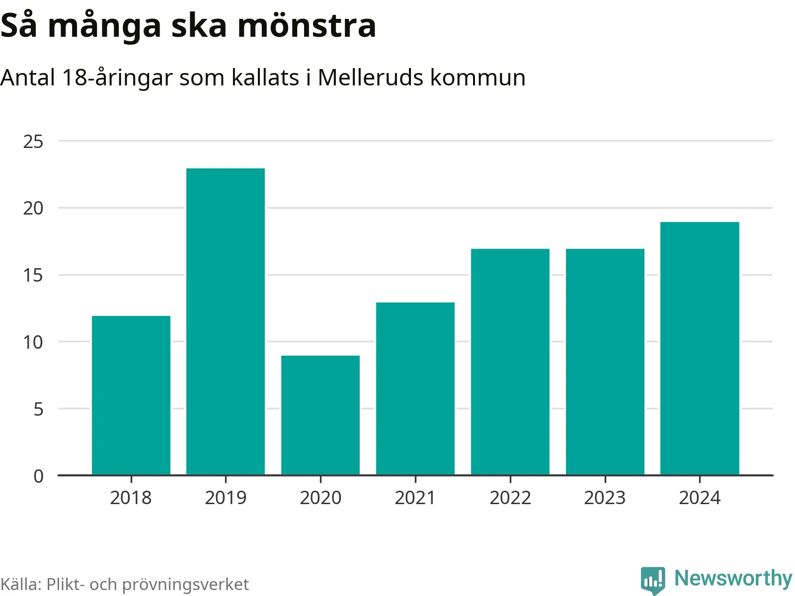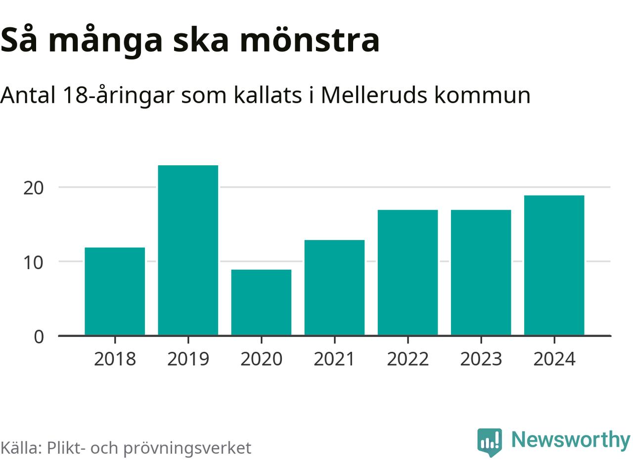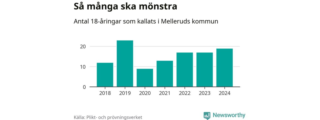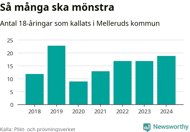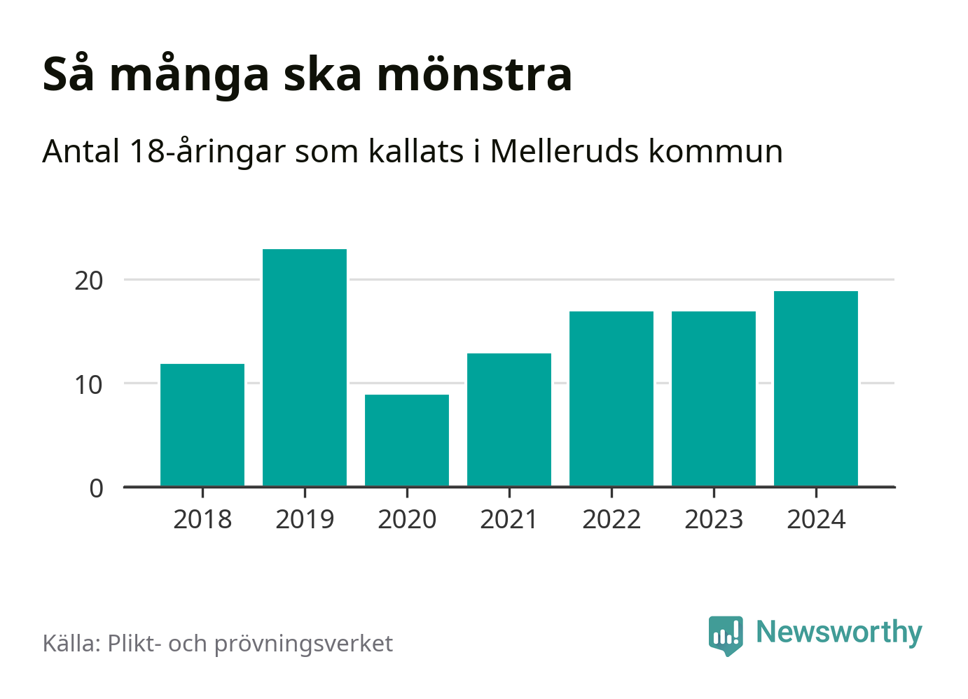 Nu kallas 27 900 svenskar födda 2006 till mönstring. Och 19 av dem kommer från Mellerud, enligt ny statistik från Plikt- och prövningsverket. Det innebär att nästan var fjärde invånare i åldersgruppen i kommunen kallas till mönstring. Det är ungefär lika stor andel som i Västra Götaland totalt. Även i riket som helhet kallas nästan var fjärde person i årskullen.