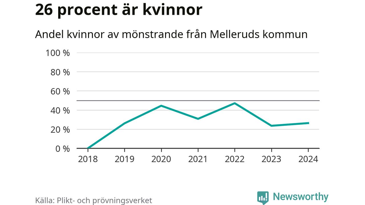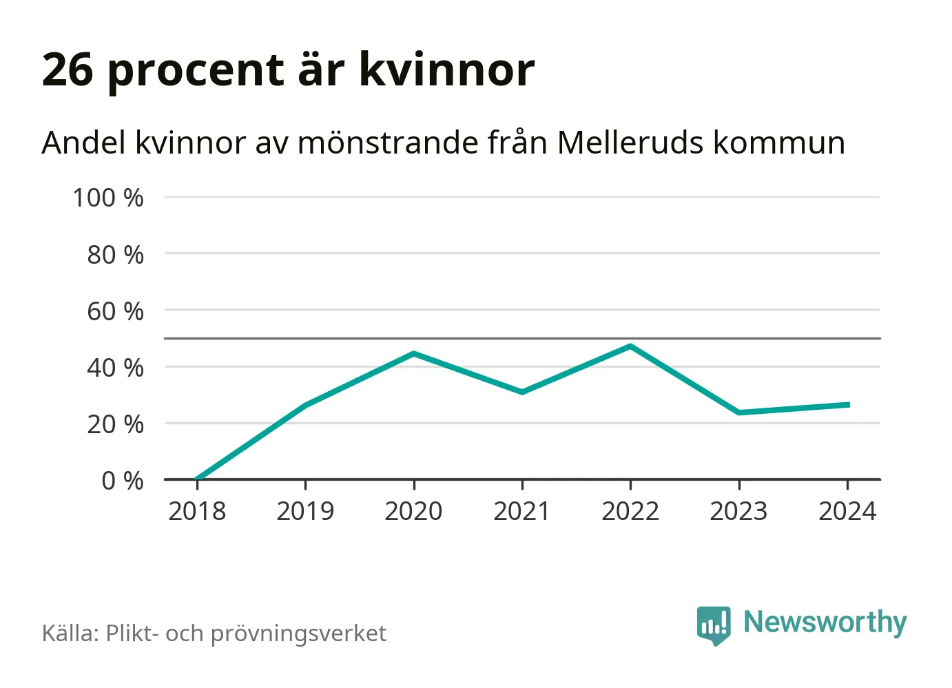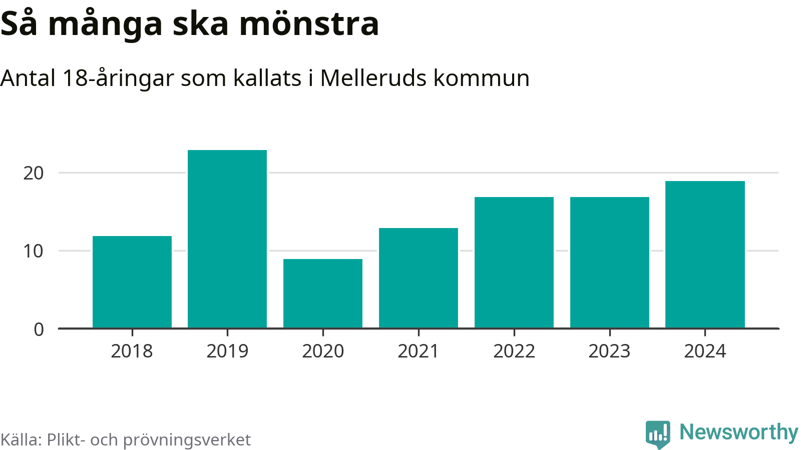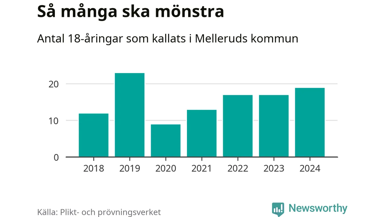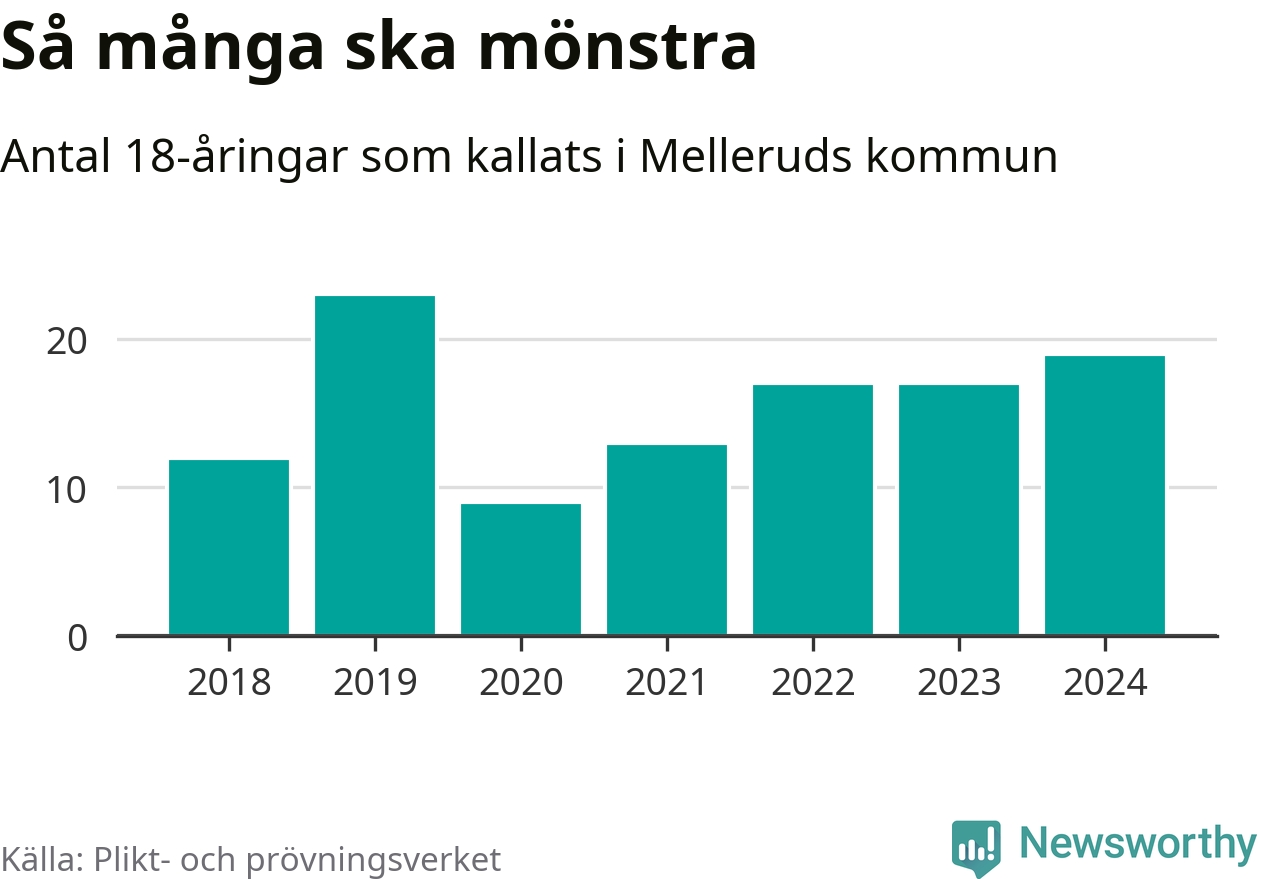 Nu kallas 27 900 svenskar födda 2006 till mönstring. Och 19 av dem kommer från Mellerud, enligt ny statistik från Plikt- och prövningsverket. Det innebär att nästan var fjärde invånare i åldersgruppen i kommunen kallas till mönstring. Det är ungefär lika stor andel som i Västra Götaland totalt. Även i riket som helhet kallas nästan var fjärde person i årskullen.