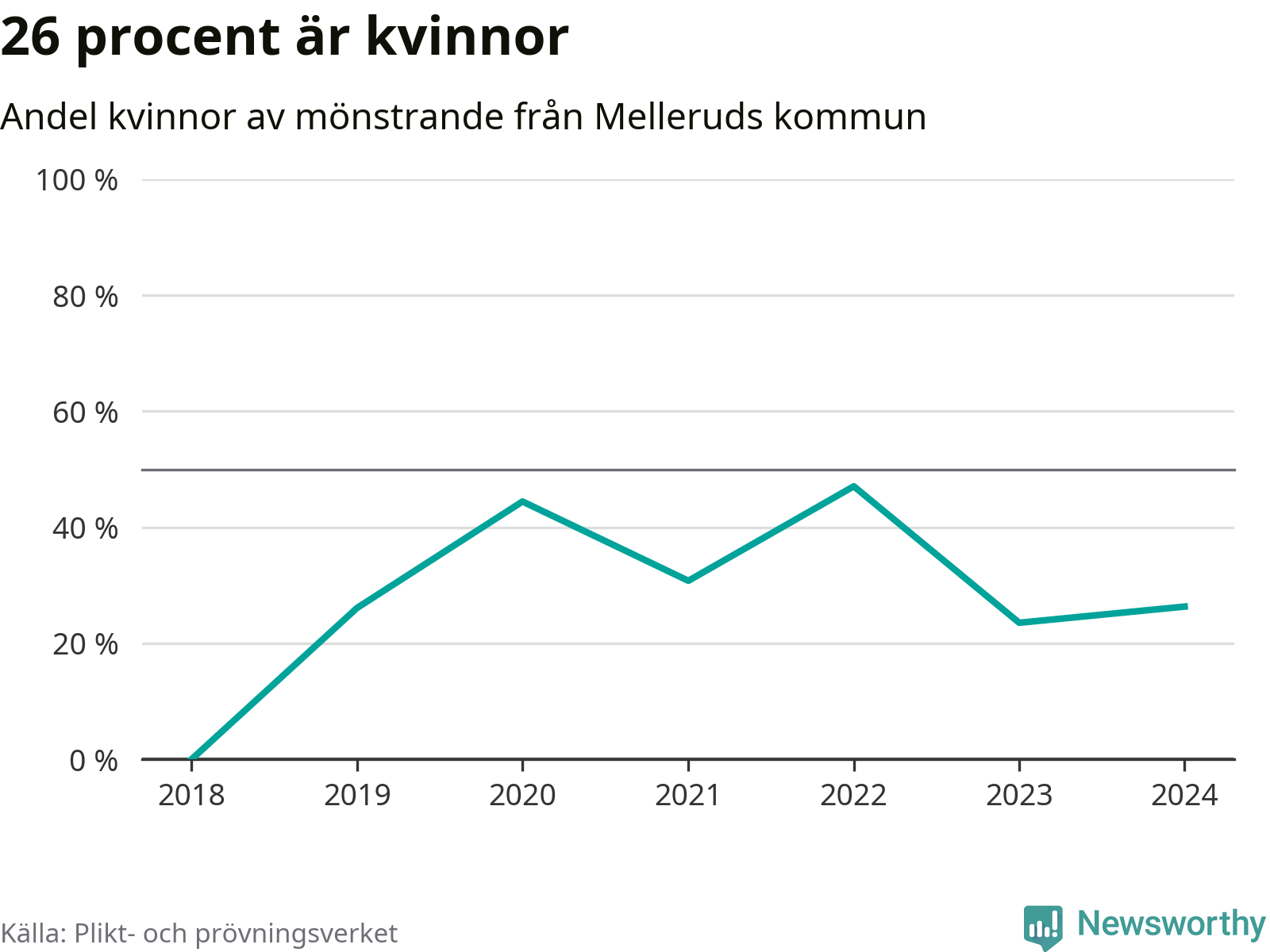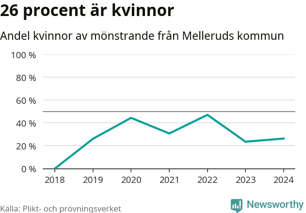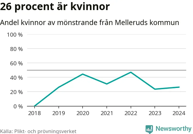 Fem av de som kallats till mönstring från Mellerud är kvinnor, vilket motsvarar 26 procent av de mönstrande. Som mest har åtta kvinnor kallats från kommunen (2022). I riket som helhet är 30 procent av de mönstrande tjejer.