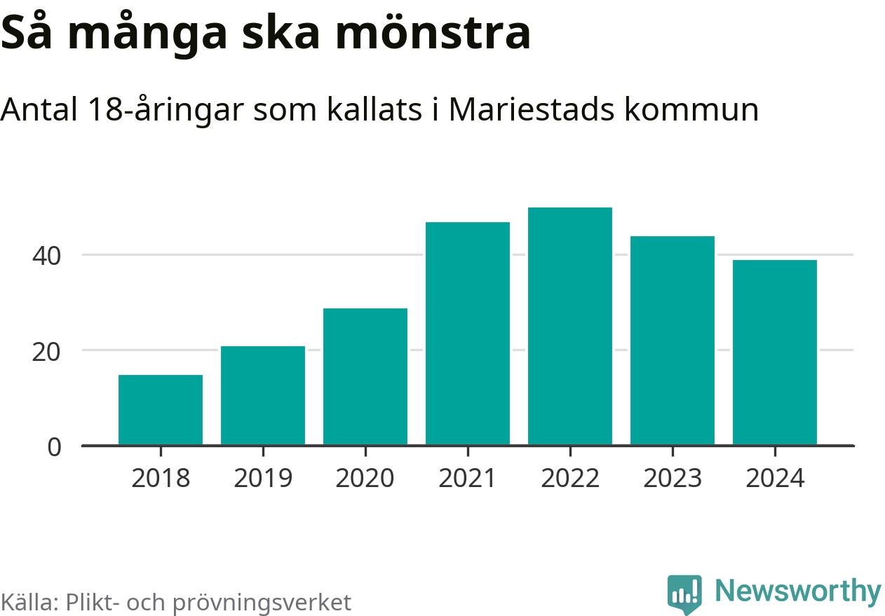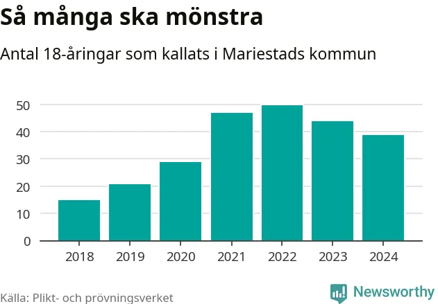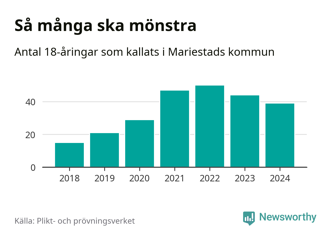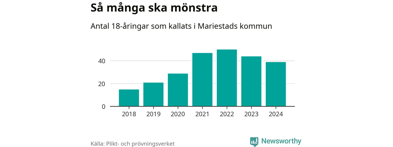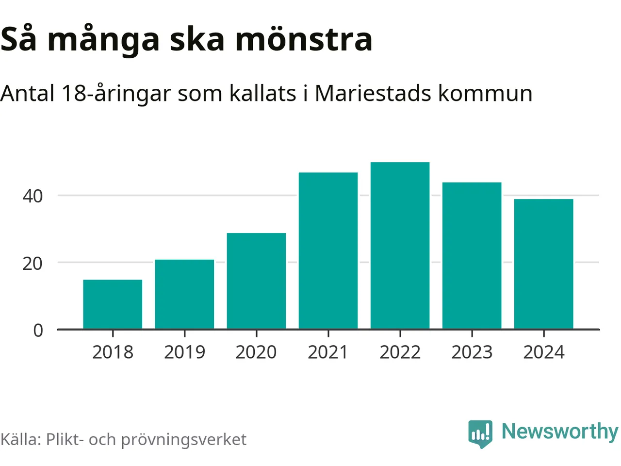 Nu kallas 27 900 svenskar födda 2006 till mönstring. Och 39 av dem kommer från Mariestad, enligt ny statistik från Plikt- och prövningsverket. Det innebär att var sjunde invånare i åldersgruppen i kommunen kallas till mönstring. Det är en lägre andel än i Västra Götaland totalt. I riket som helhet kallas nästan var fjärde person i årskullen.